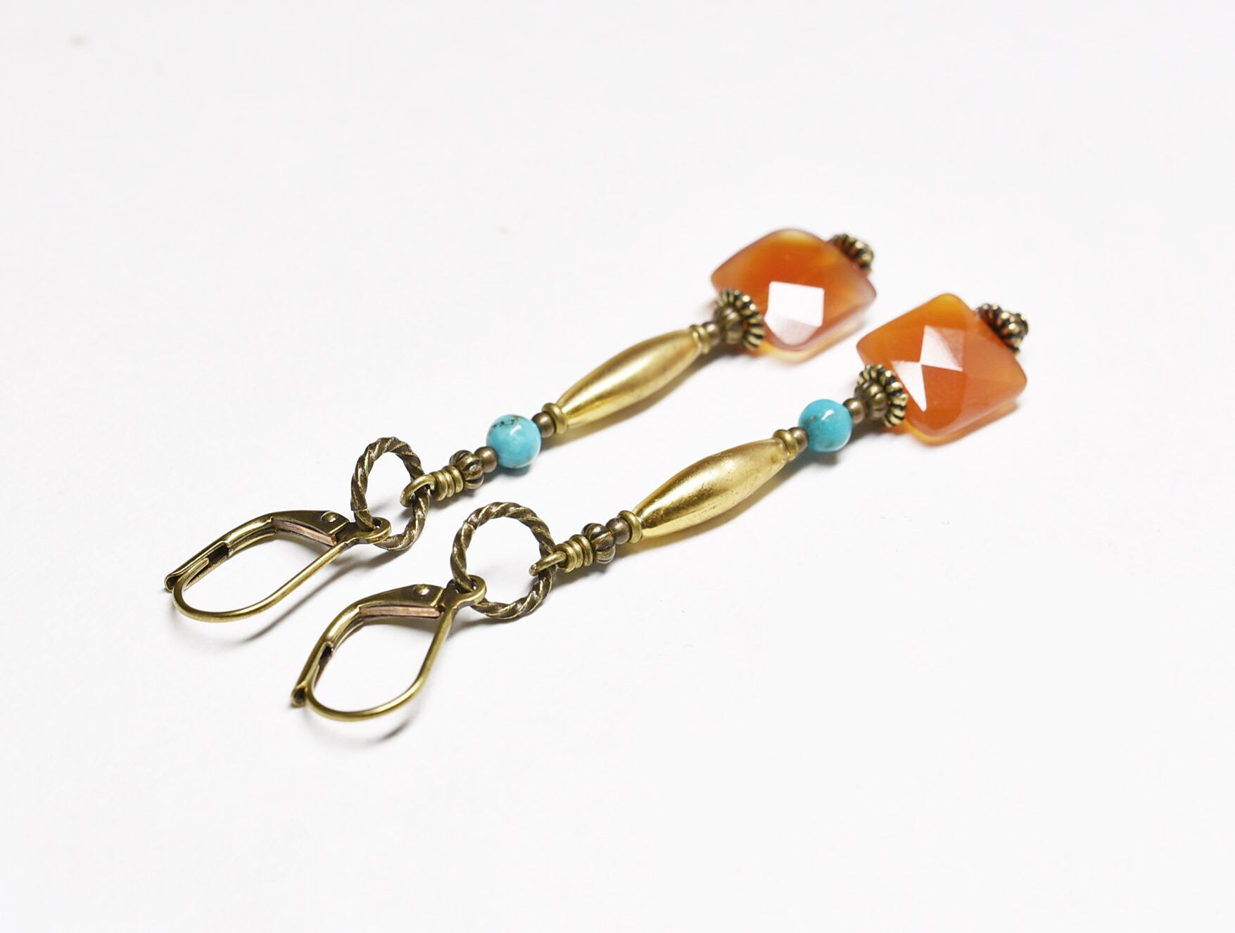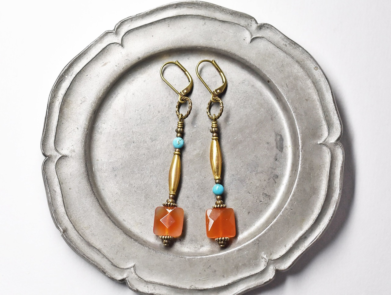 カーネリアンと、フランス産吹きガラス、ターコイズを繋いだアンシメトリーなピアスです。