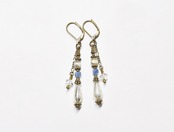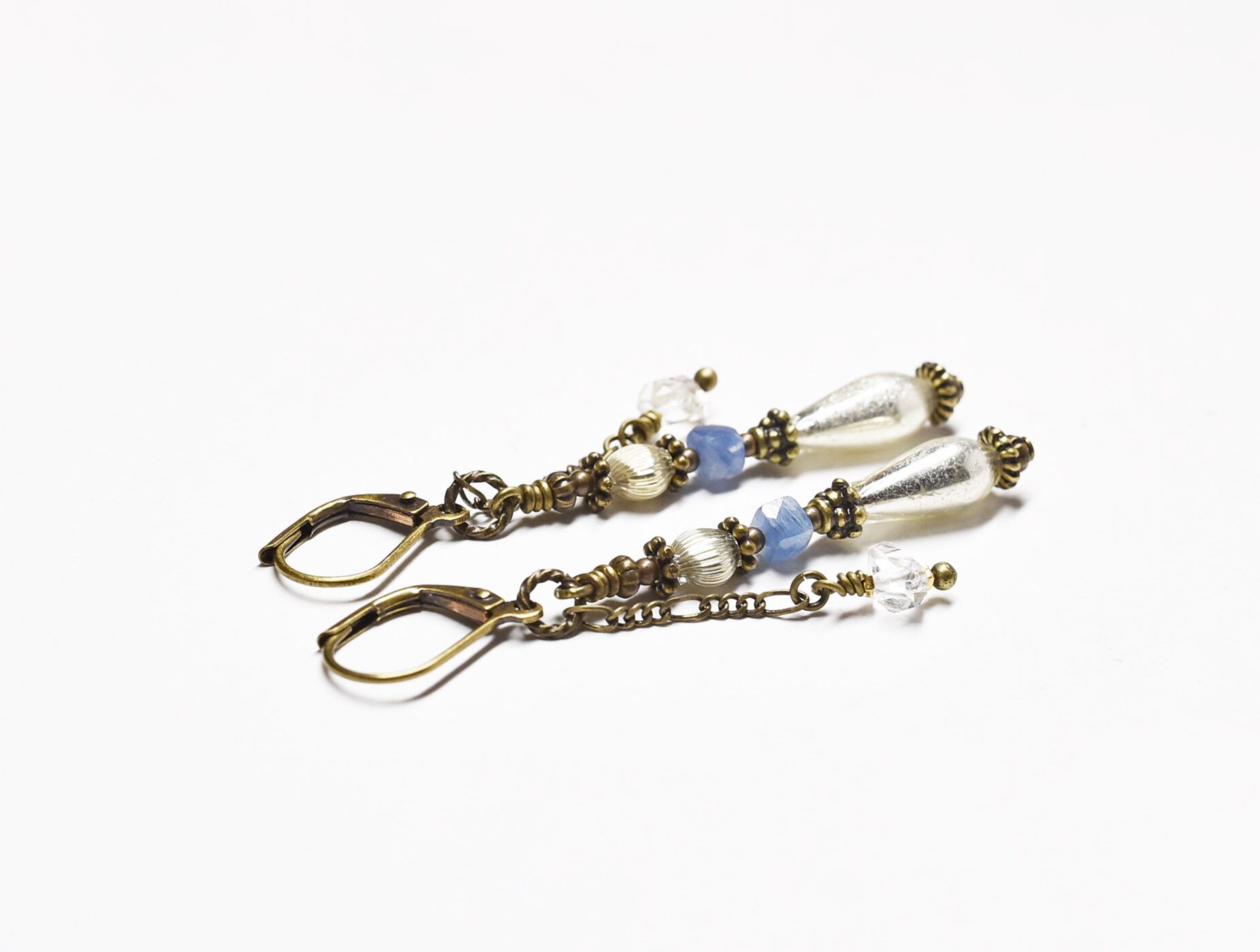 2種類のフランス産の吹きガラスパーツと、カイヤナイト、チェーンでハーキマーダイヤモンドを繋いだピアスです。
