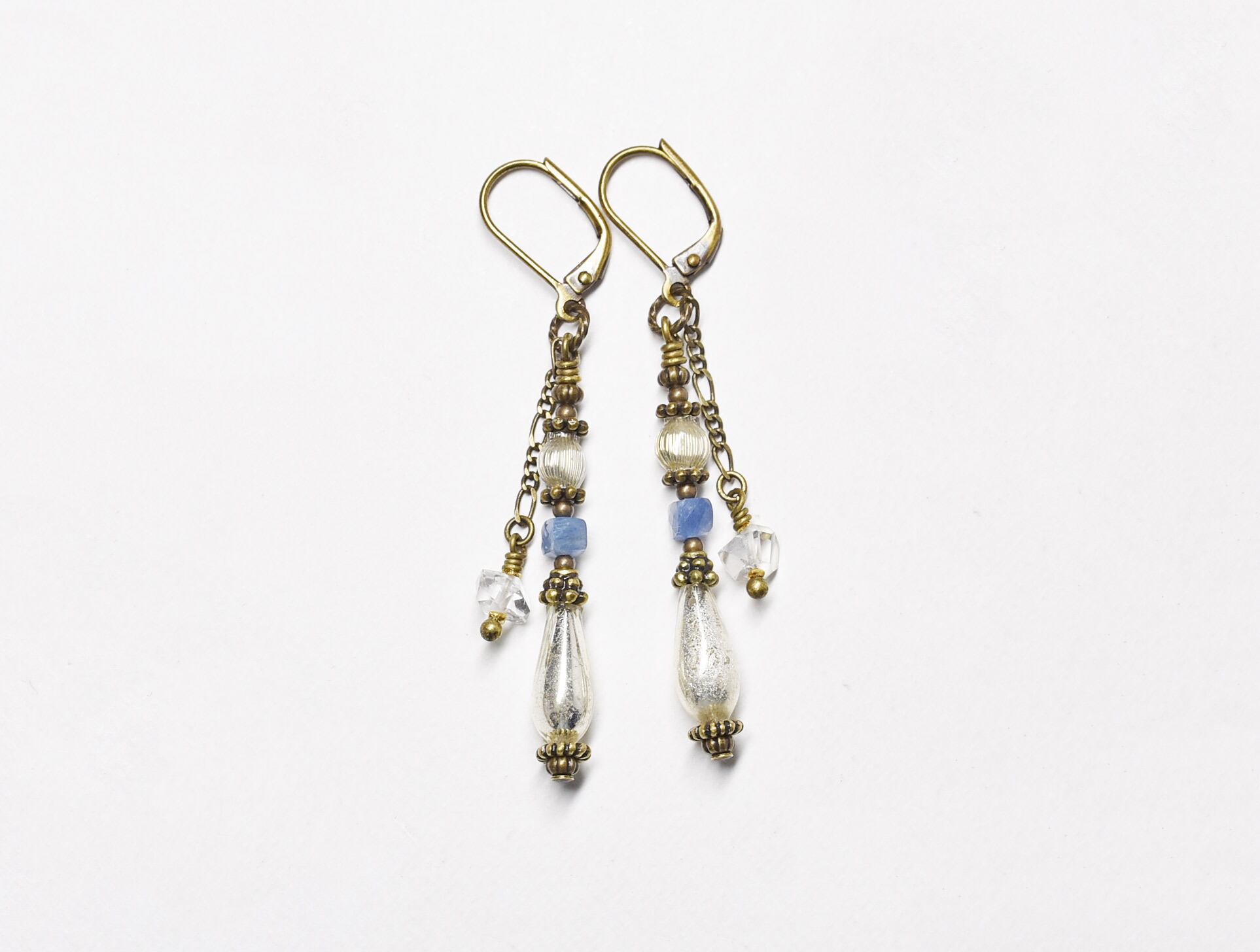 2種のフランス吹きガラスとカイヤナイト、ハーキマーダイヤモンドのピアス