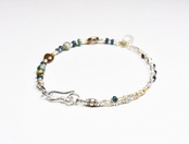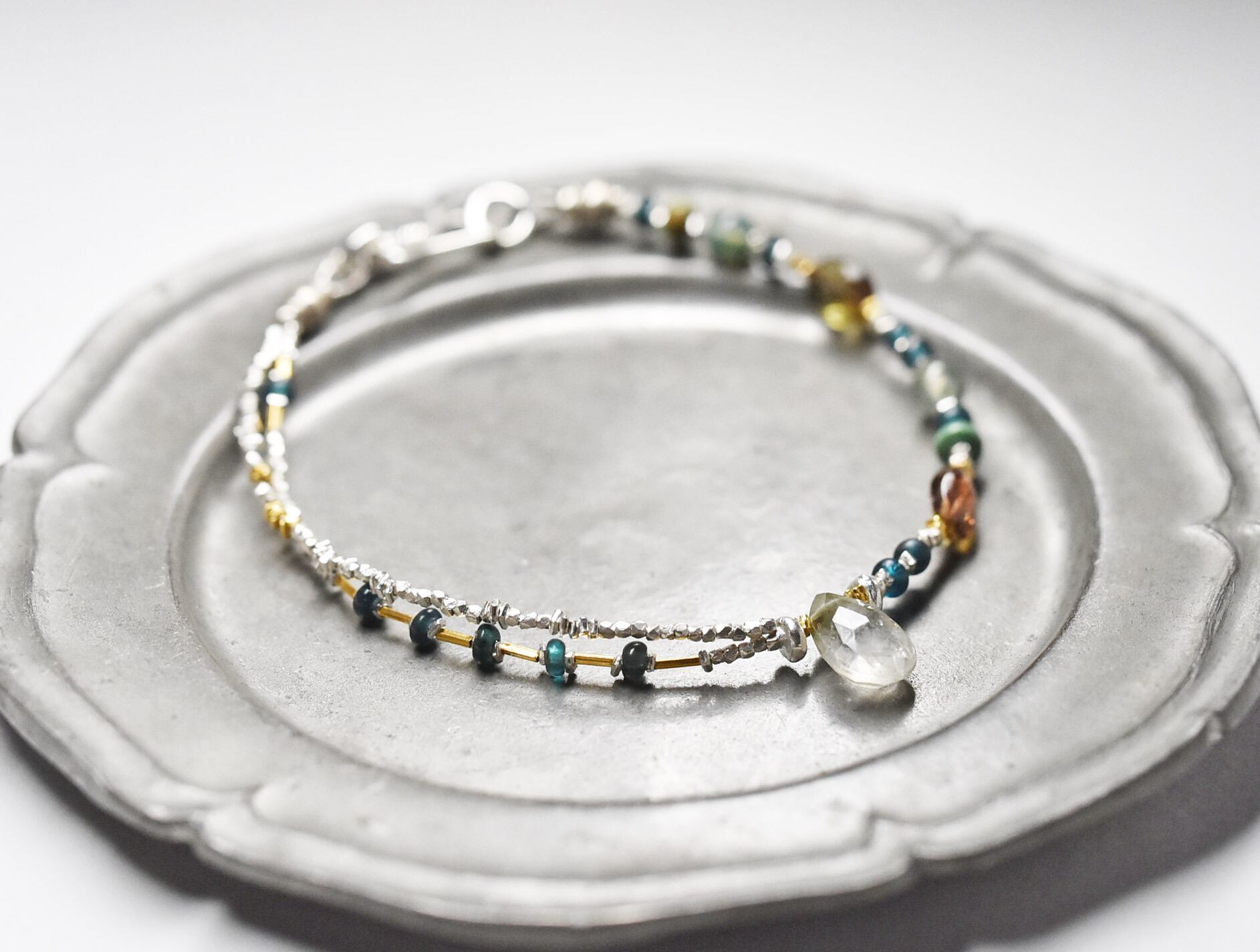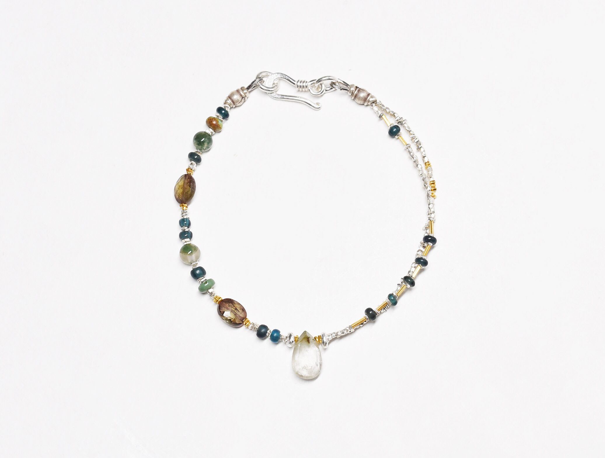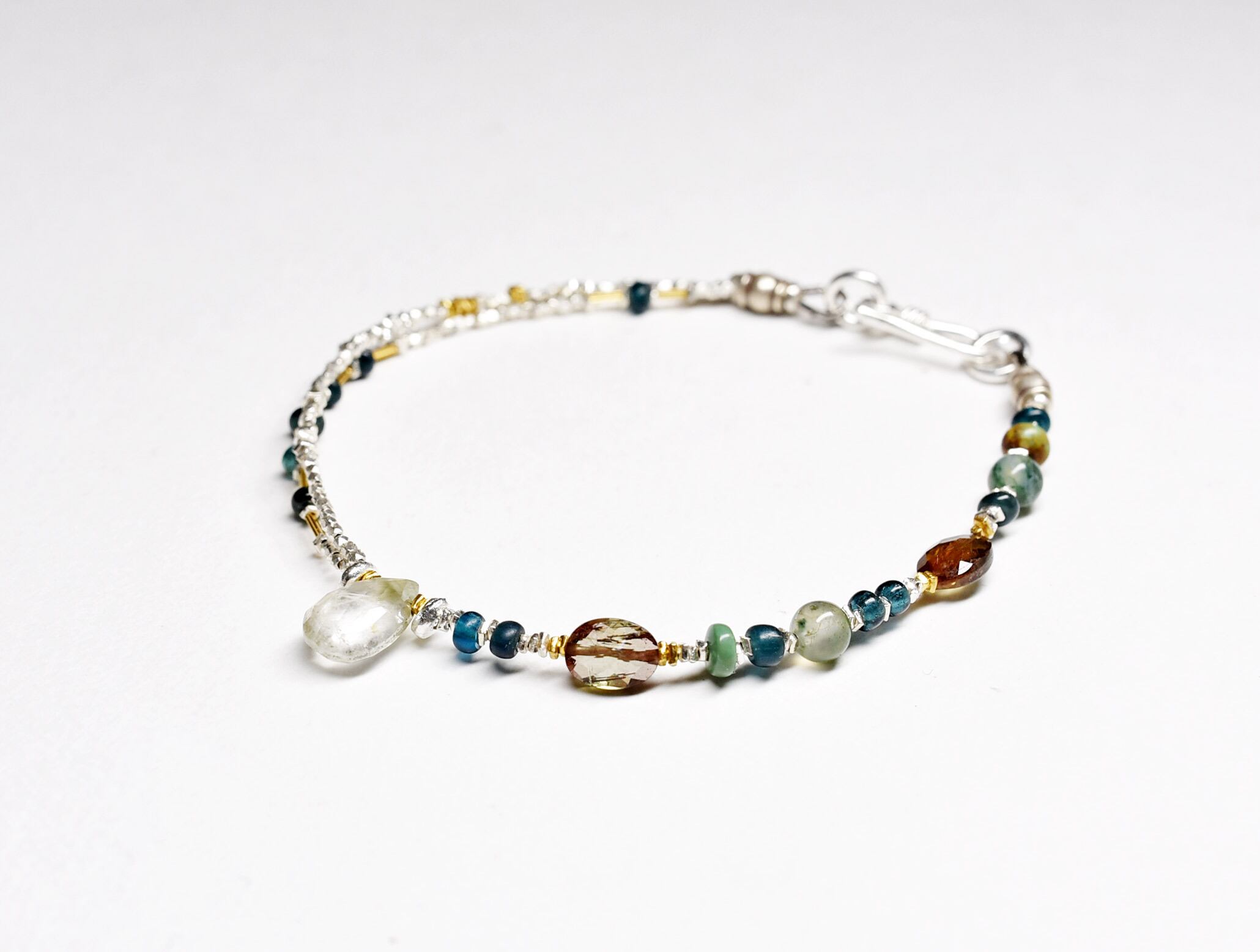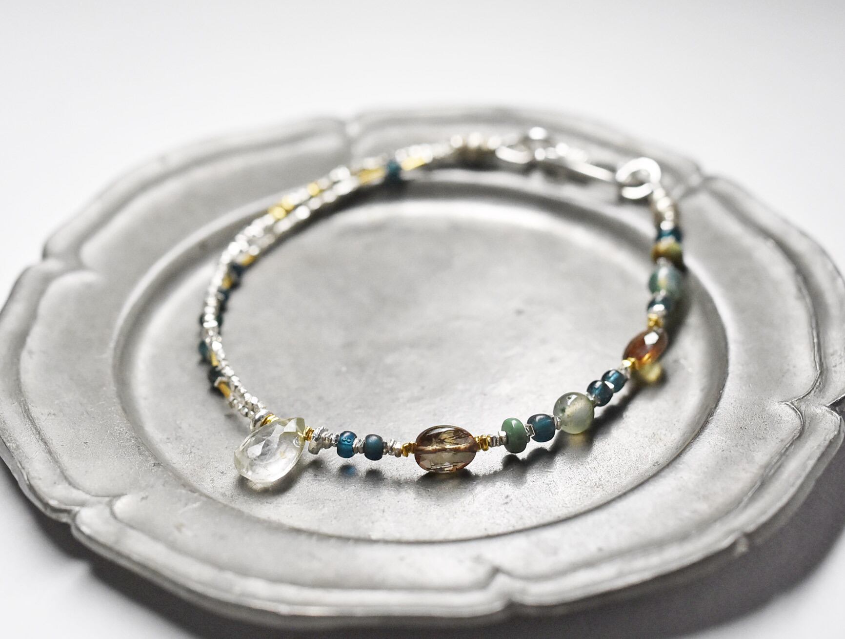 内包物水晶とアンドリューサイト、インディアンアゲート、ターコイズ、インディゴブルービーズとカレンシルバーを繋いだ華奢なブレスです。