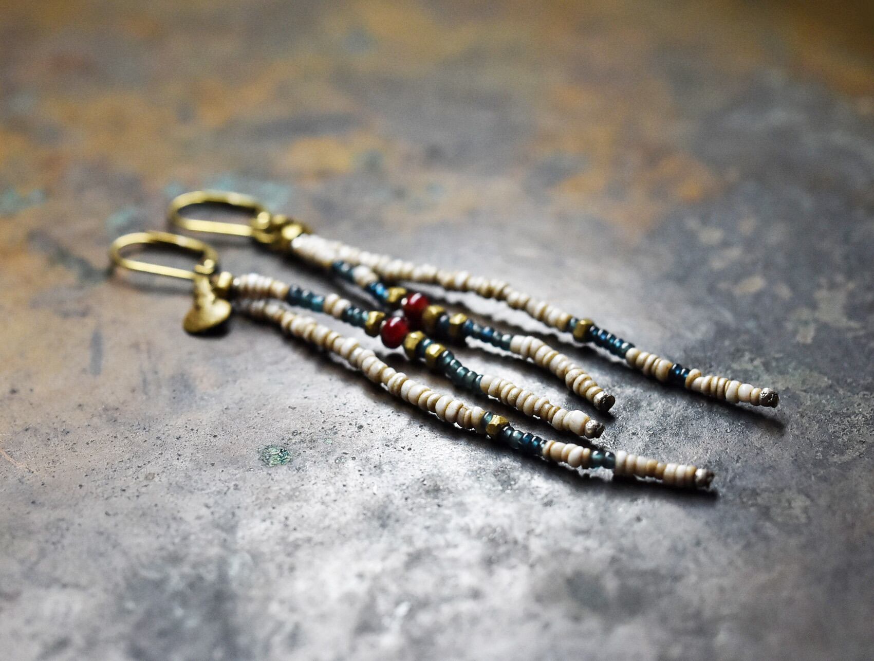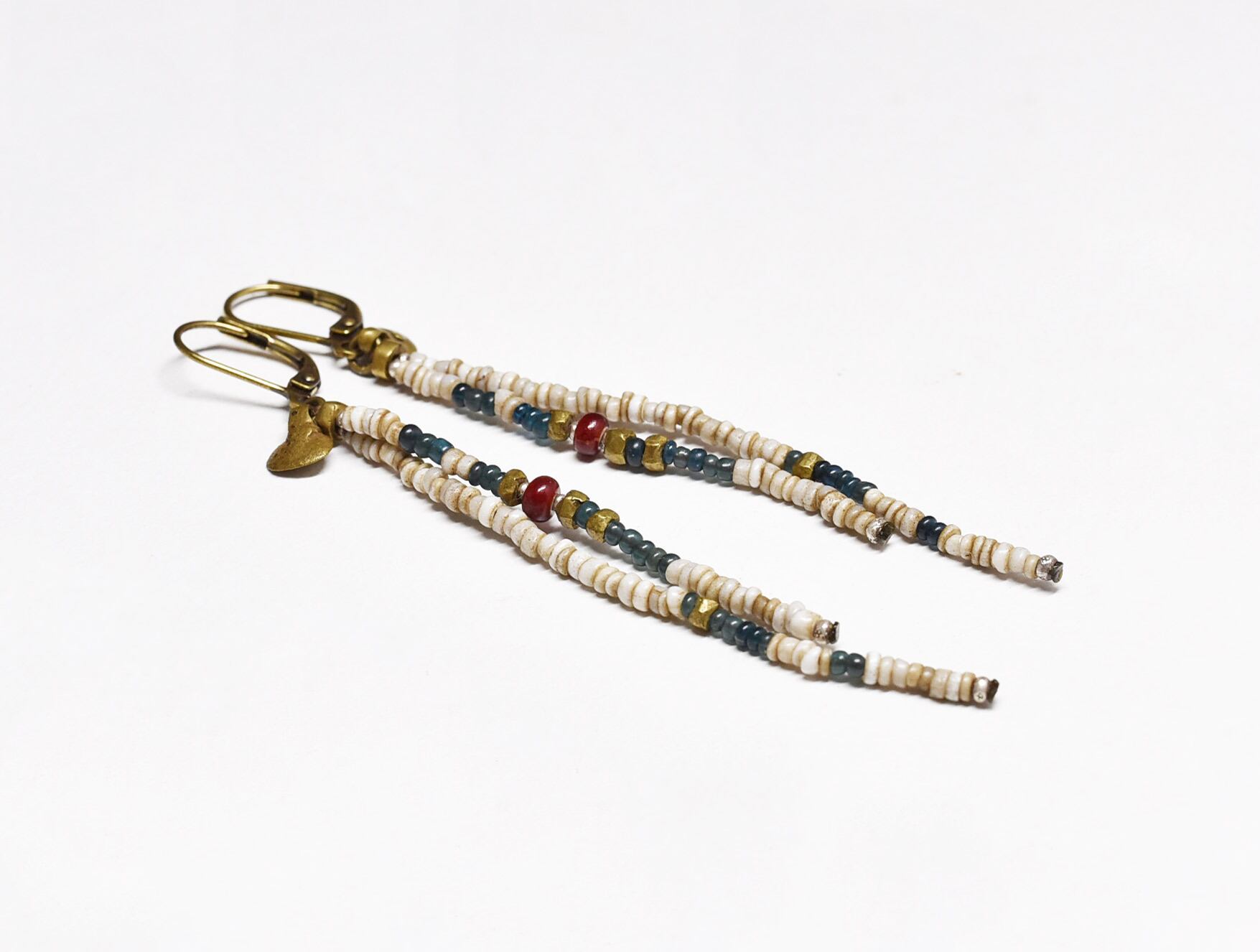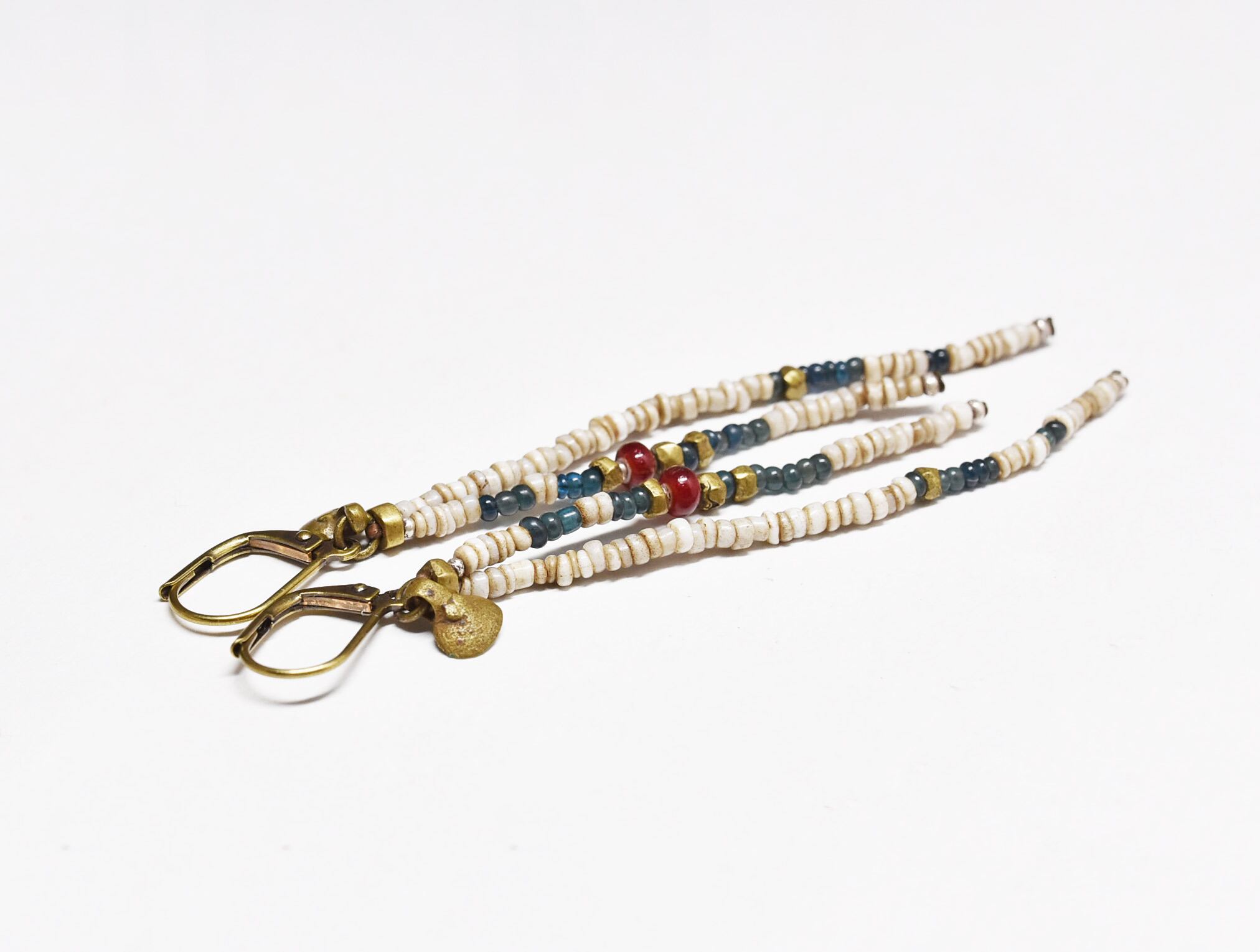 血赤ホワイトハーツ、インディゴブルー&ホワイトビーズ、oldオリッサブラスの2連ピアス