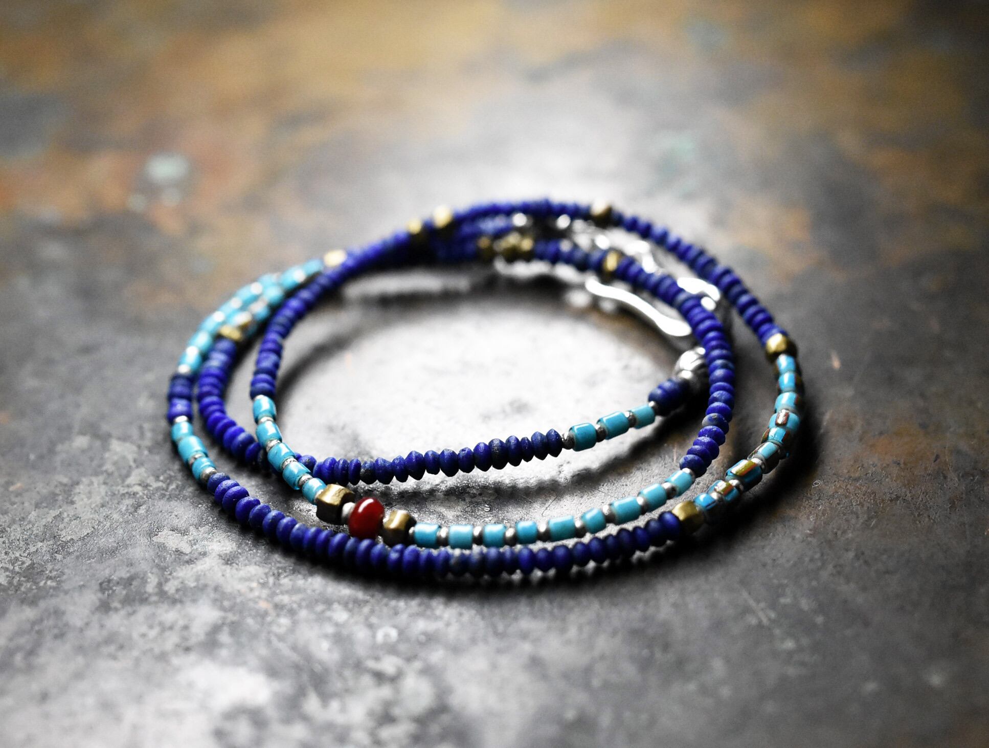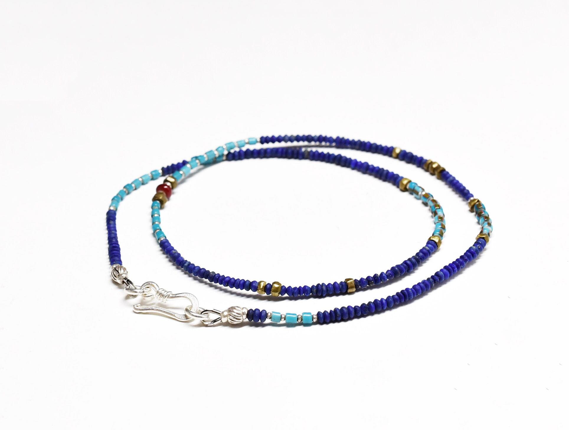 小さなラピスラズリと、3種類のホワイトハーツ、oldオリッサブラスなどを繋げたネックレスです。