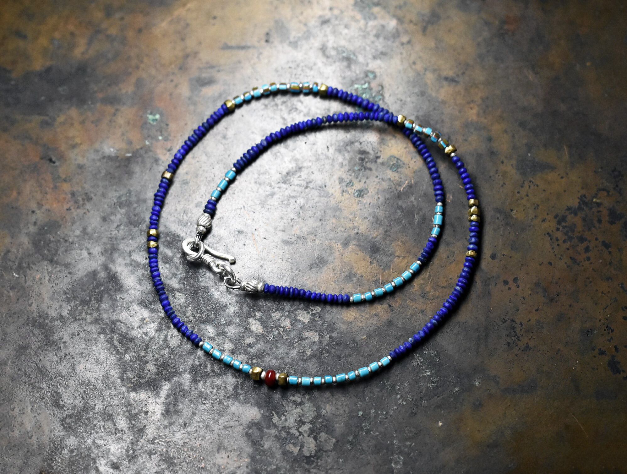 算盤型ラピスととターコイズブルー&血赤ホワイトハーツ、oldオリッサブラスの華奢なネックレス