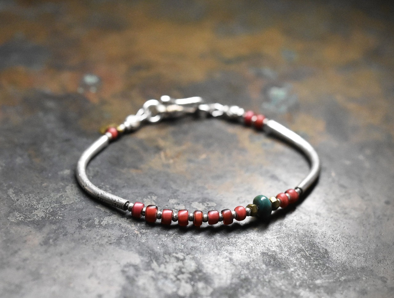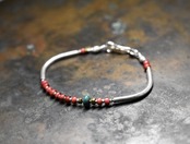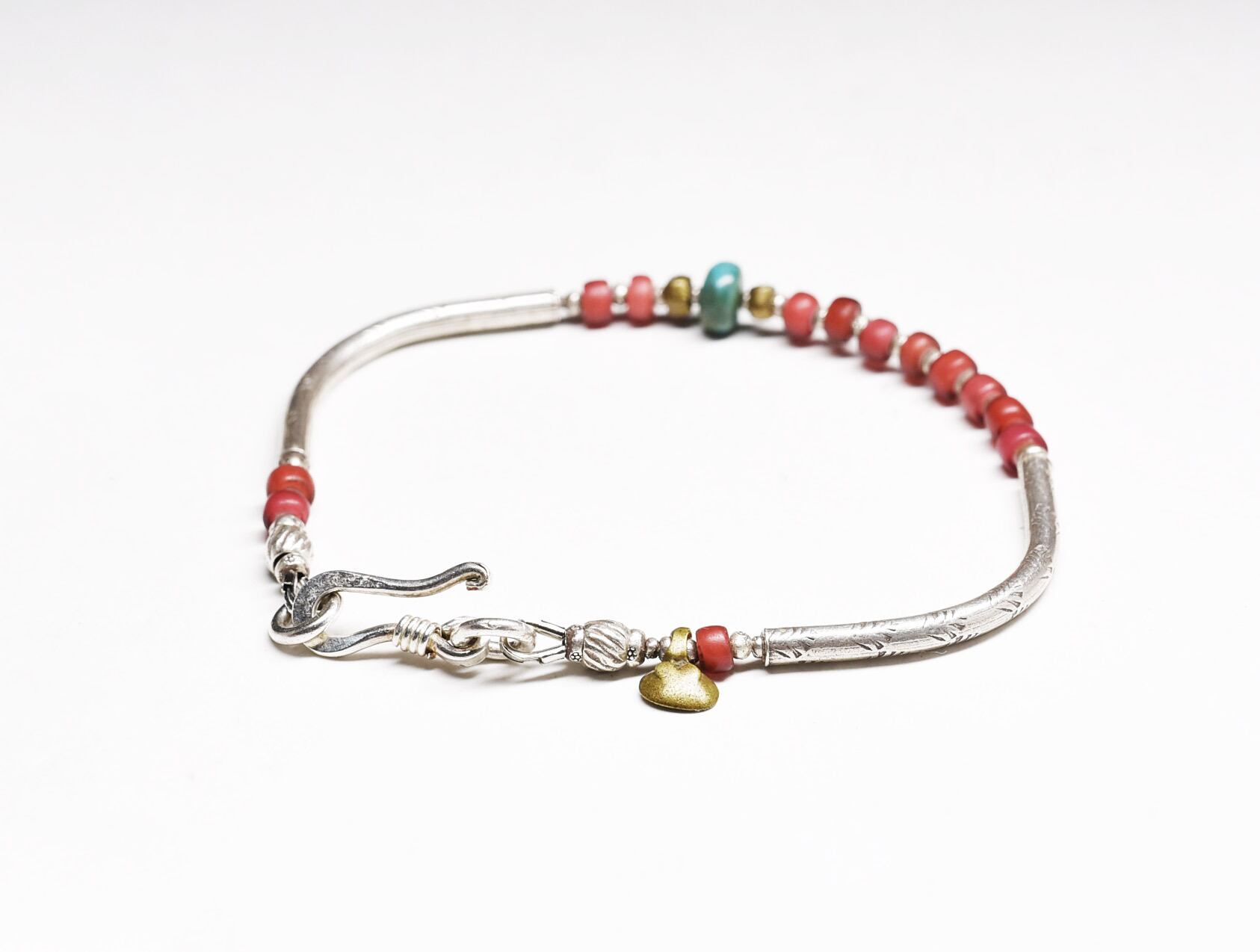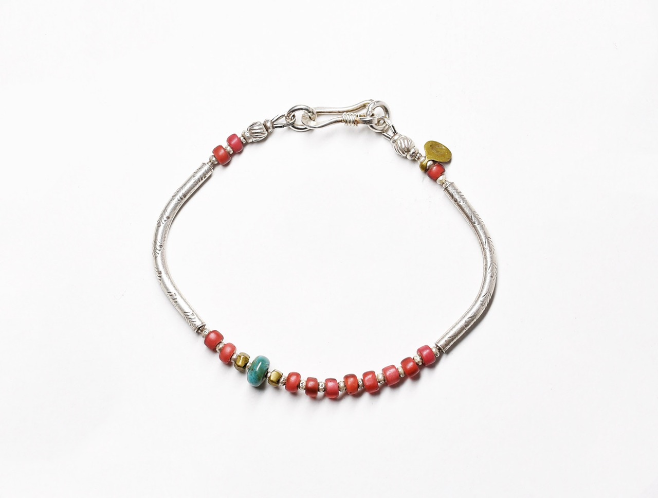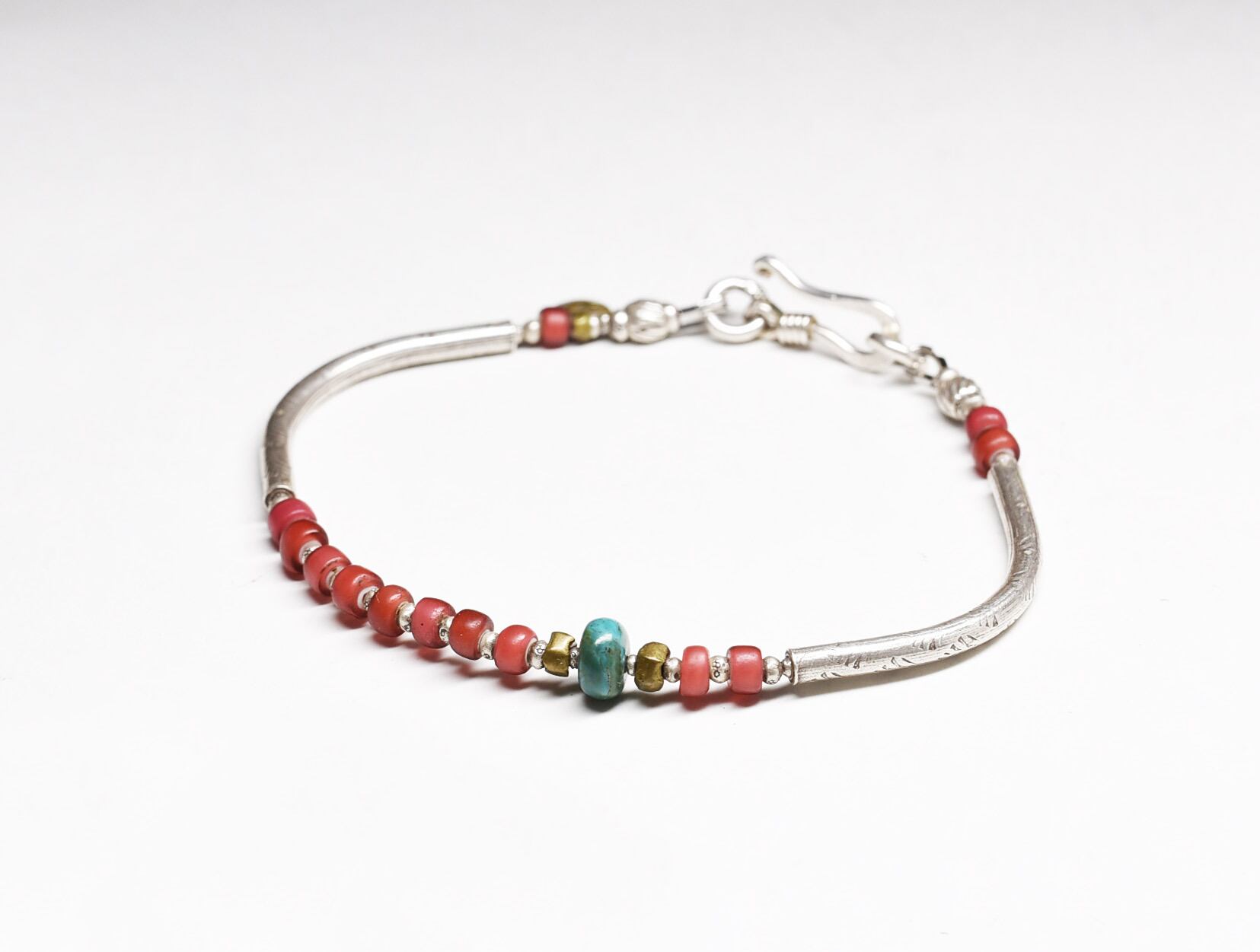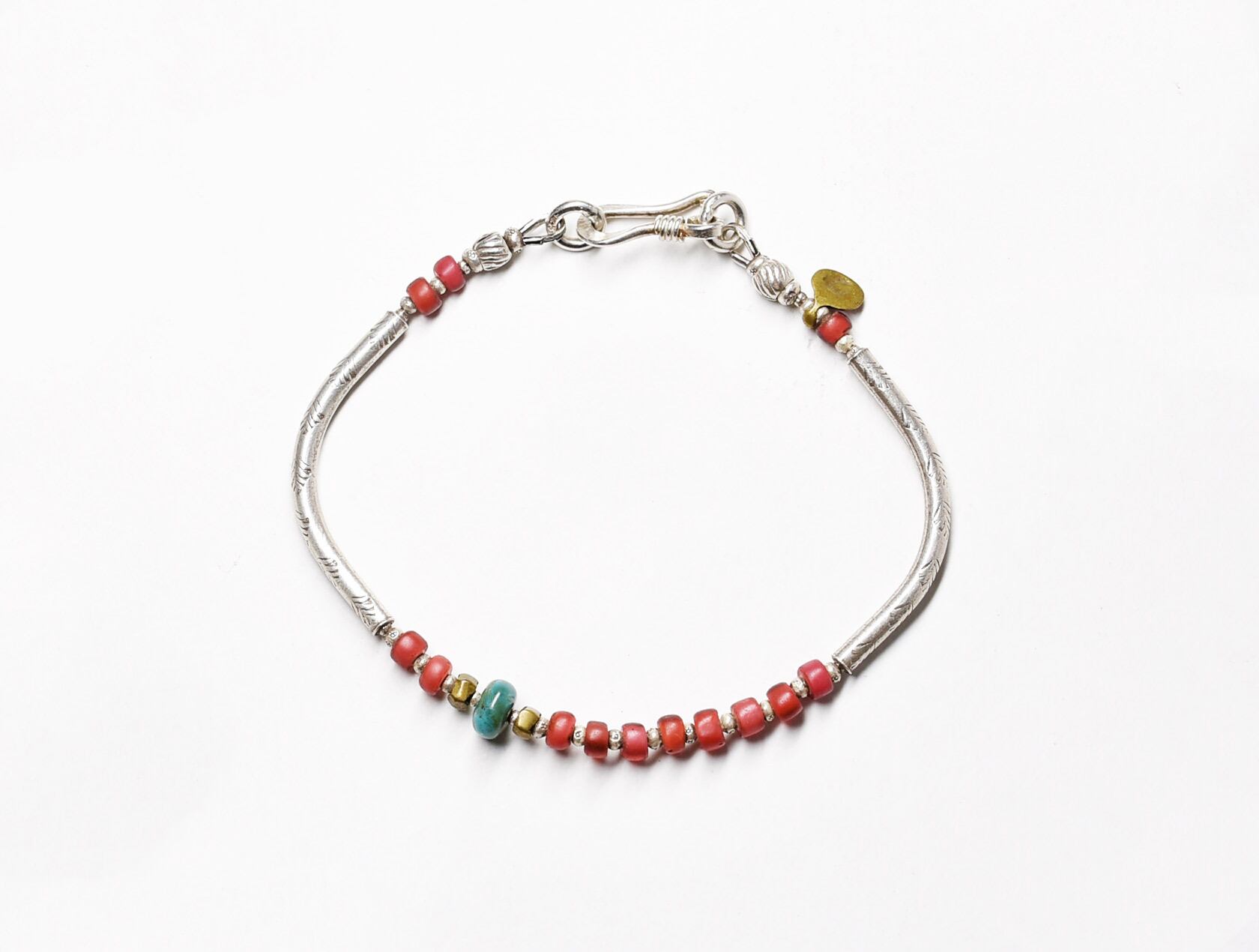 湾曲したカレンシルバーと金赤ホワイトハーツ、ターコイズ、oldオリッサブラスを繋いだ華奢なブレスです。