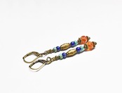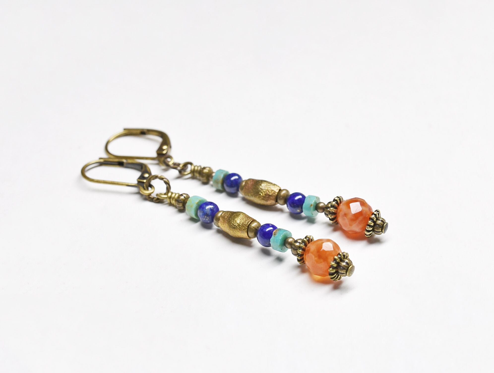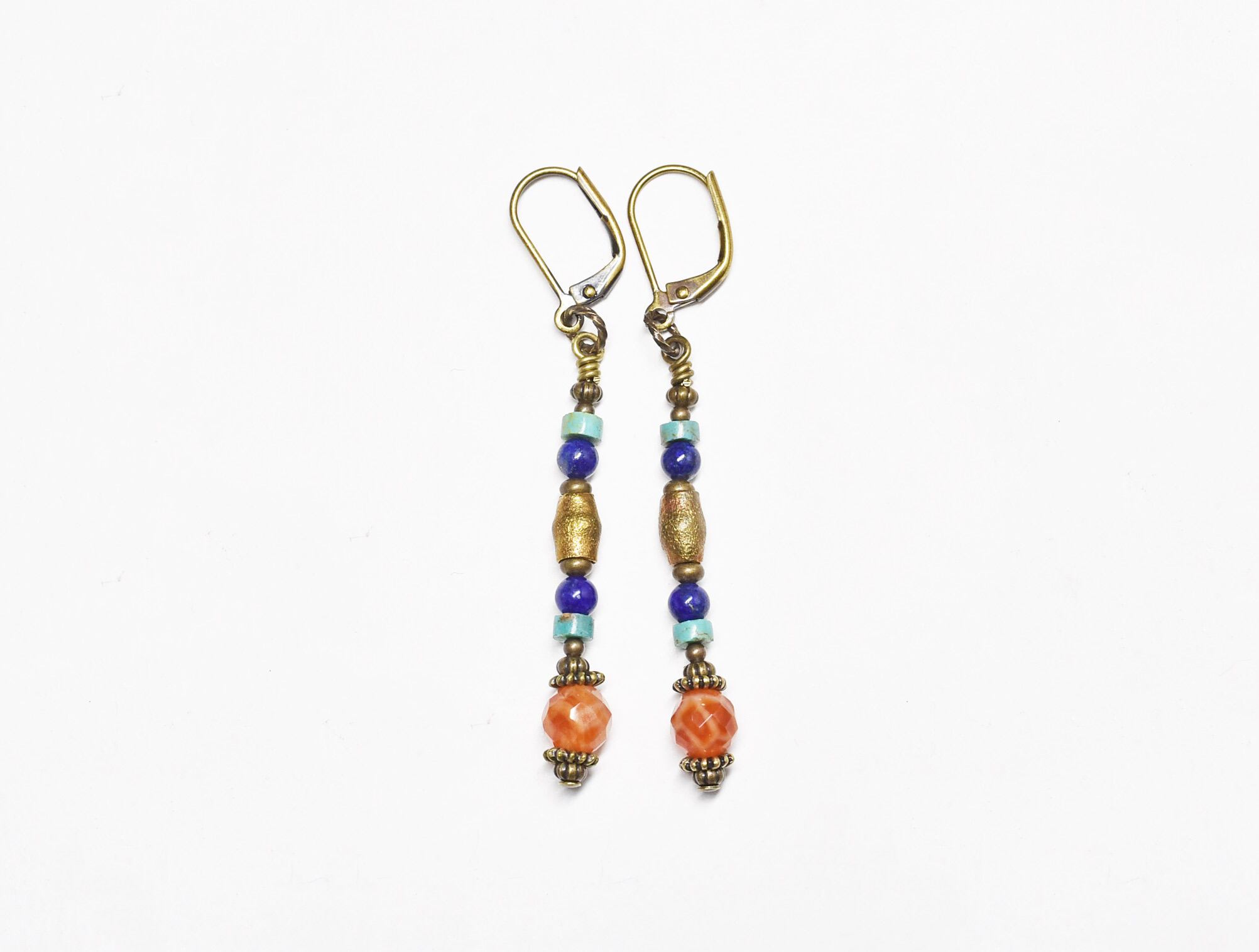アフリカンブラスとファイアーアゲート、ラピスとターコイズのスリムなピアス