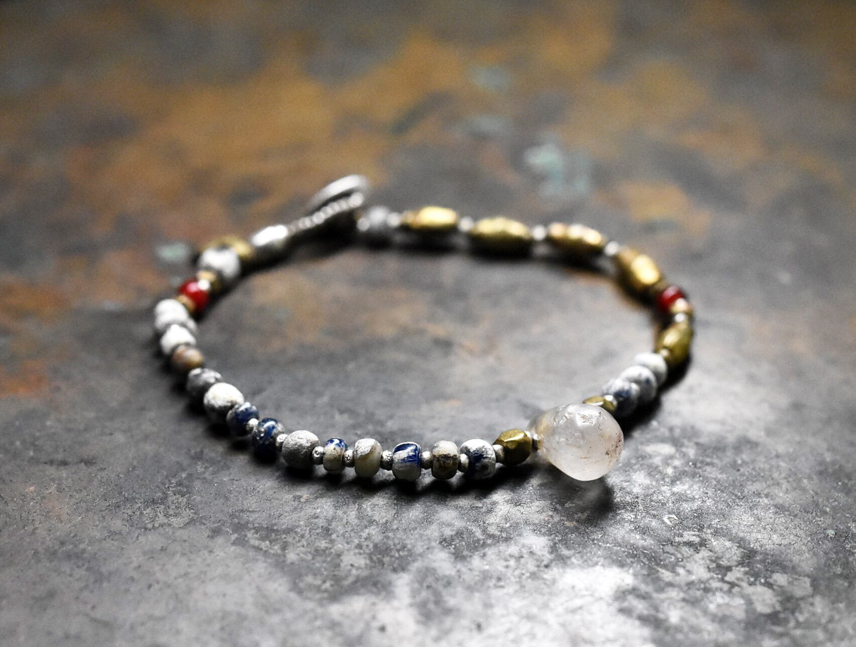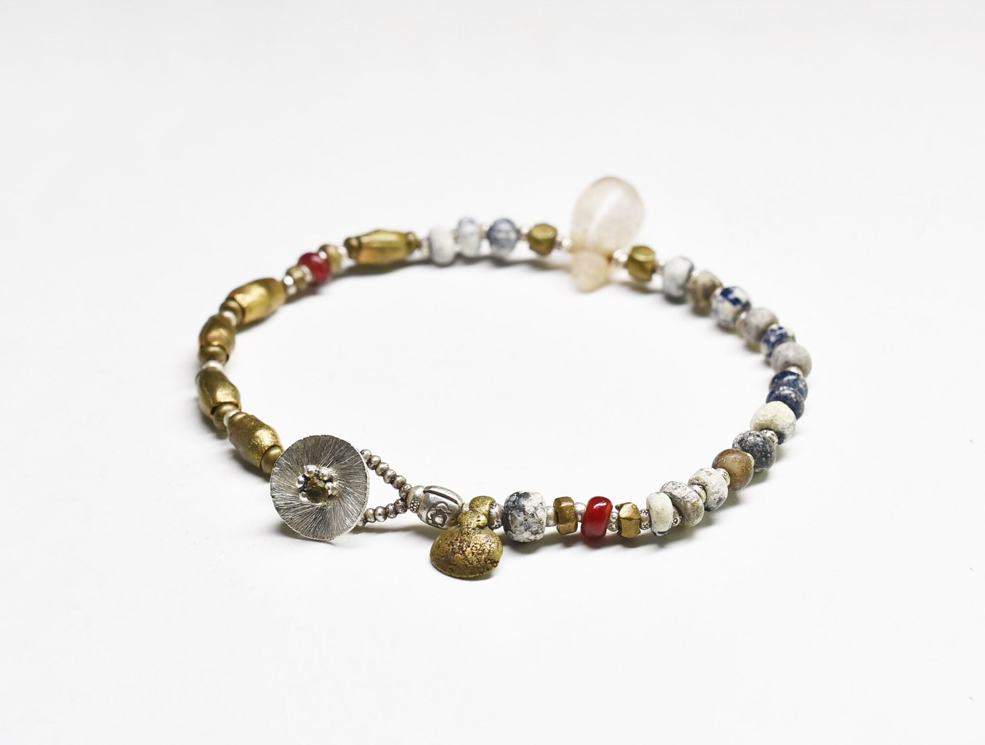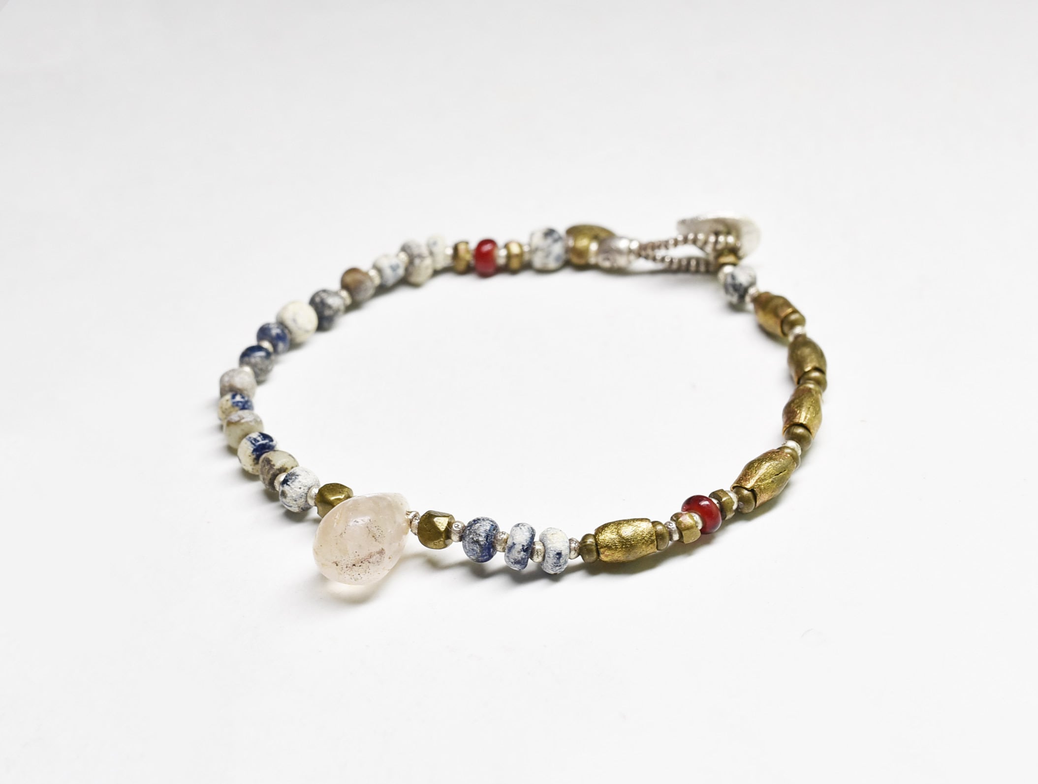 古代水晶、出土ビーズと、血赤ホワイトハーツ、oldオリッサブラス、アフリカンブラスなどを繋いだブレスです。
