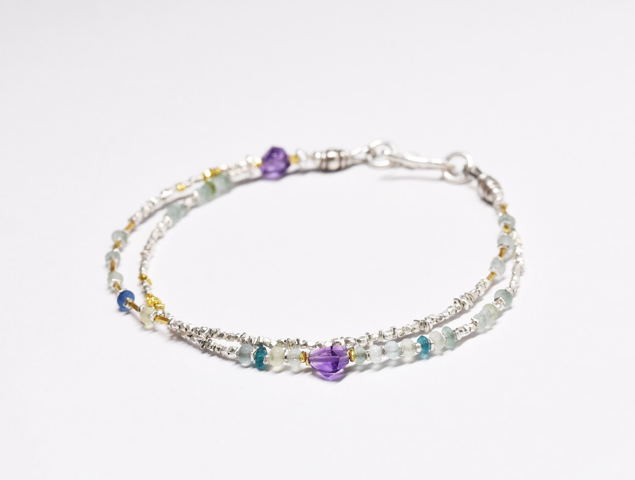 小さなローマングラスビーズと、カレンシルバービーズ、アメジストを繋いだ2連のブレスです。