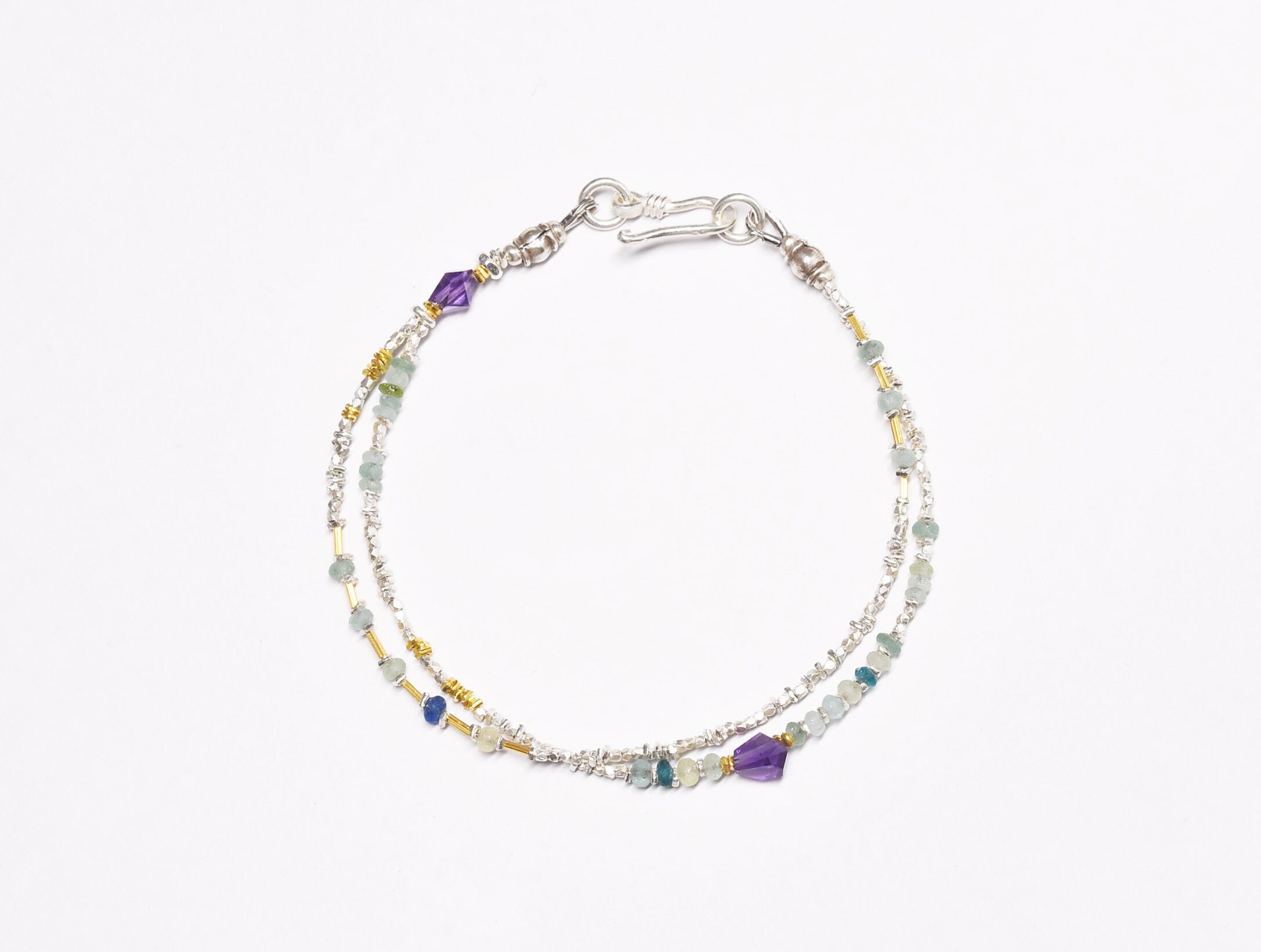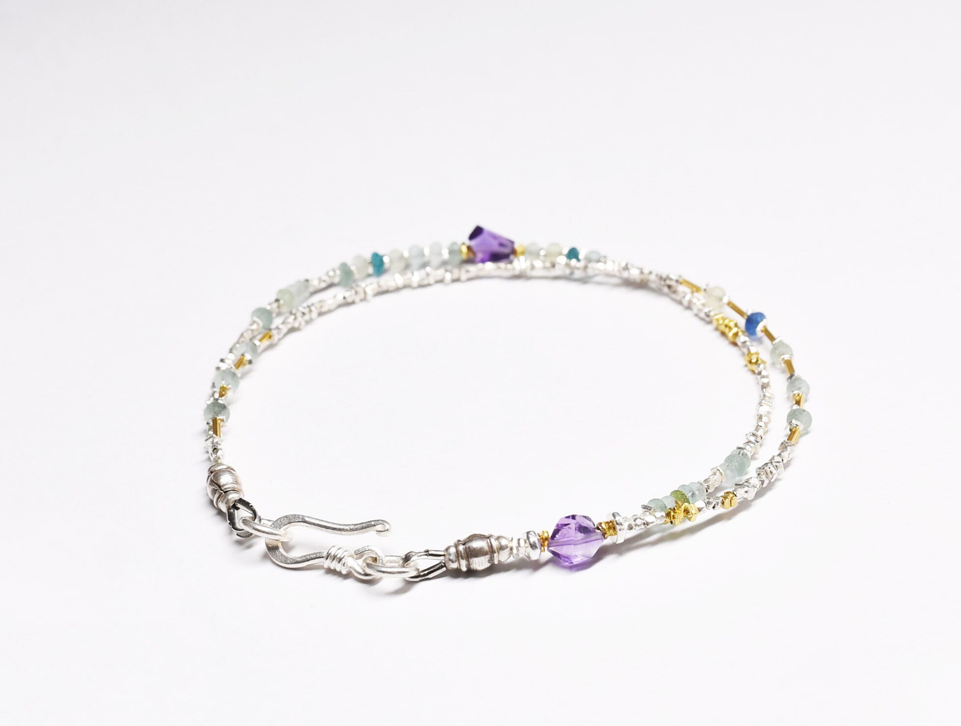 古代ガラスの味わいと、シルバーやアメジストの煌めきが目を惹くブレスです。