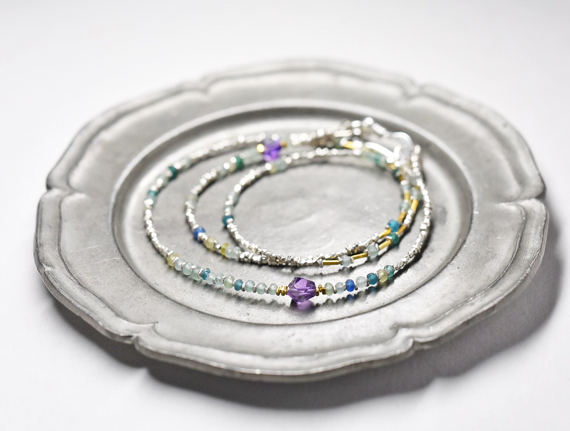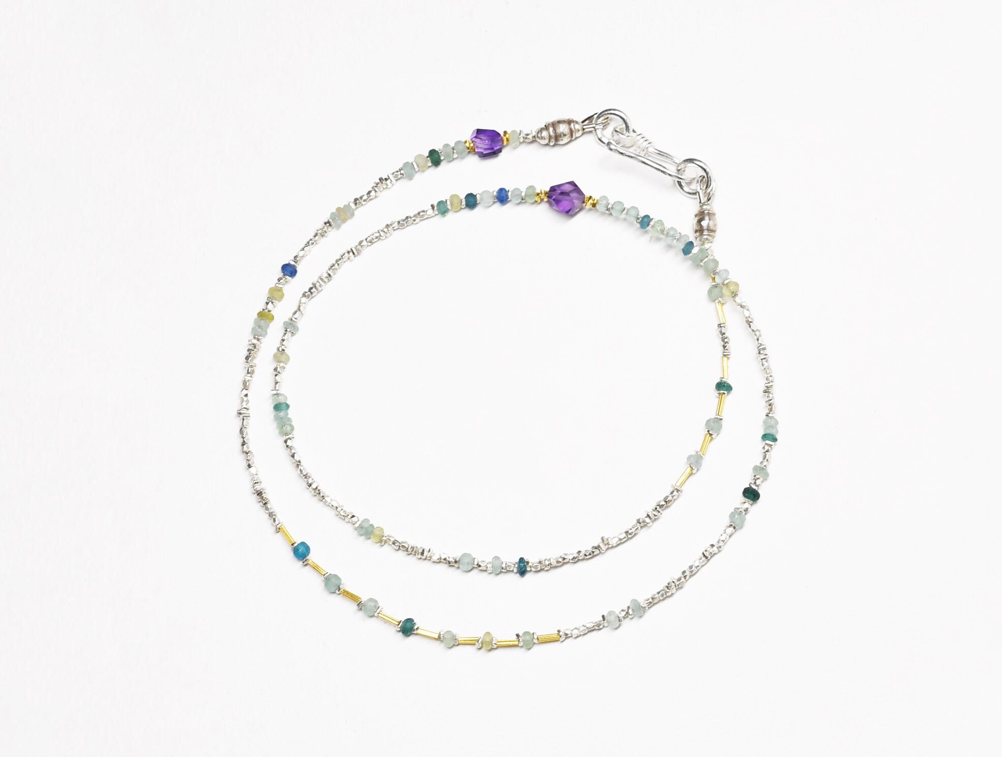 古代ガラスの味わいと、シルバーやアメジストの煌めきが目を惹くネックレスです。