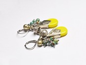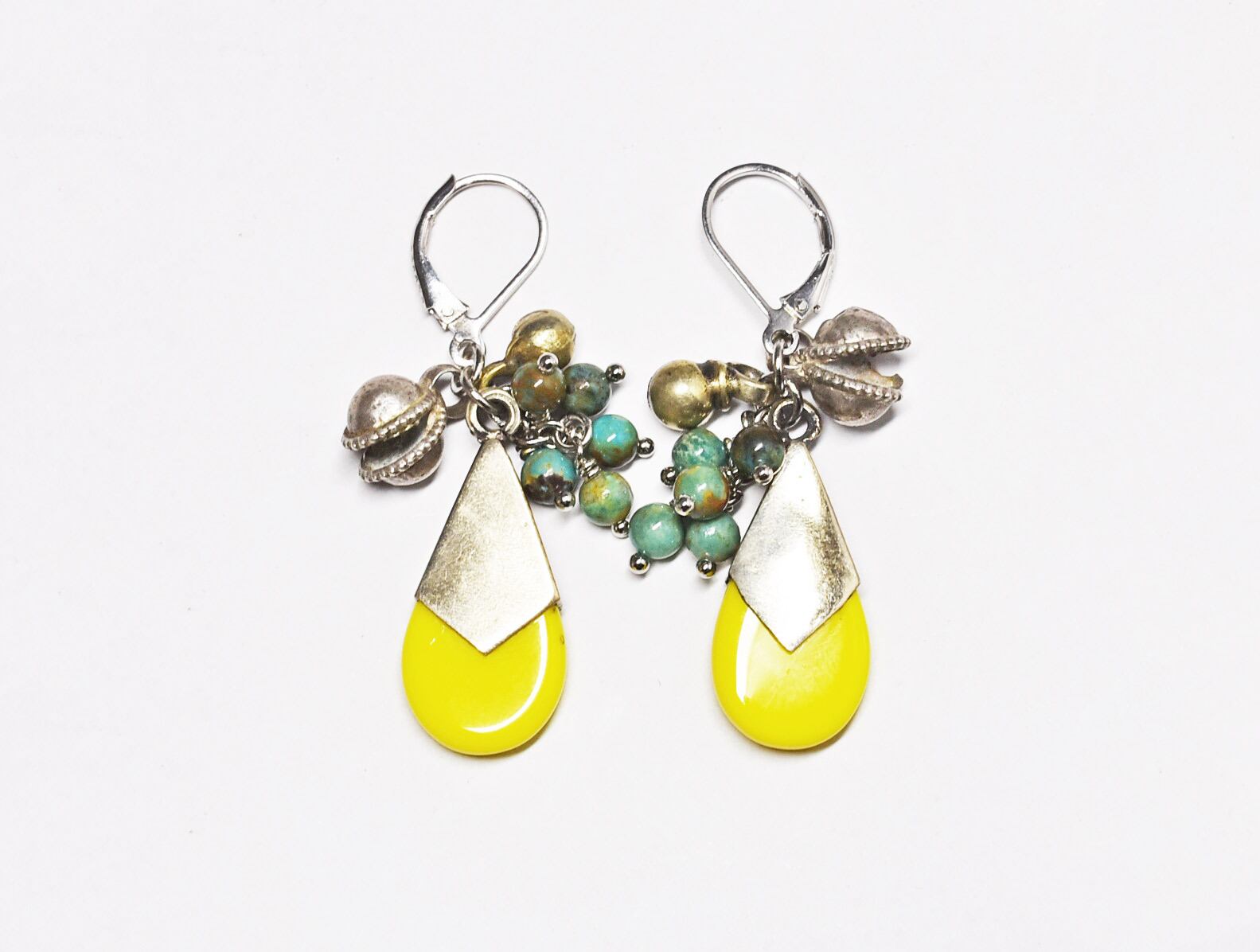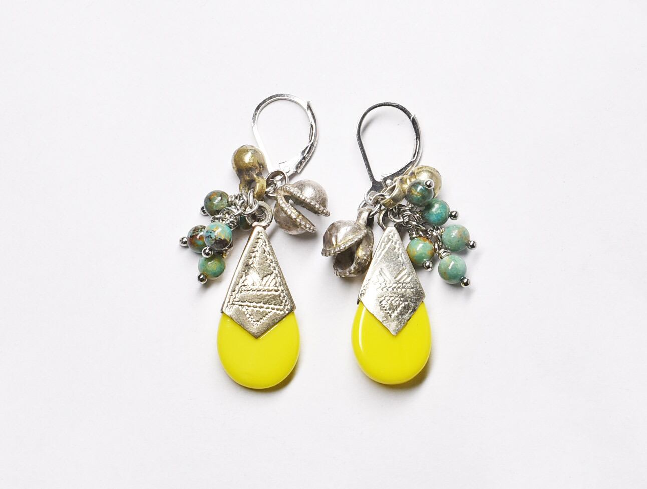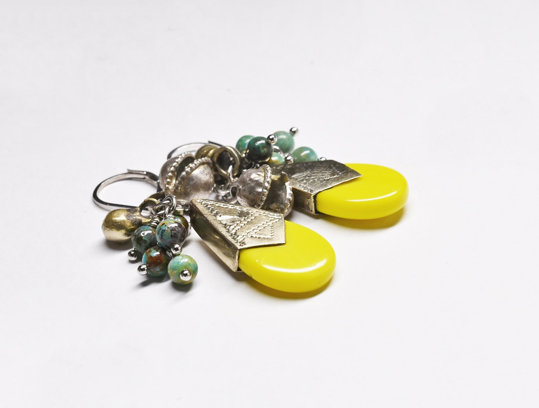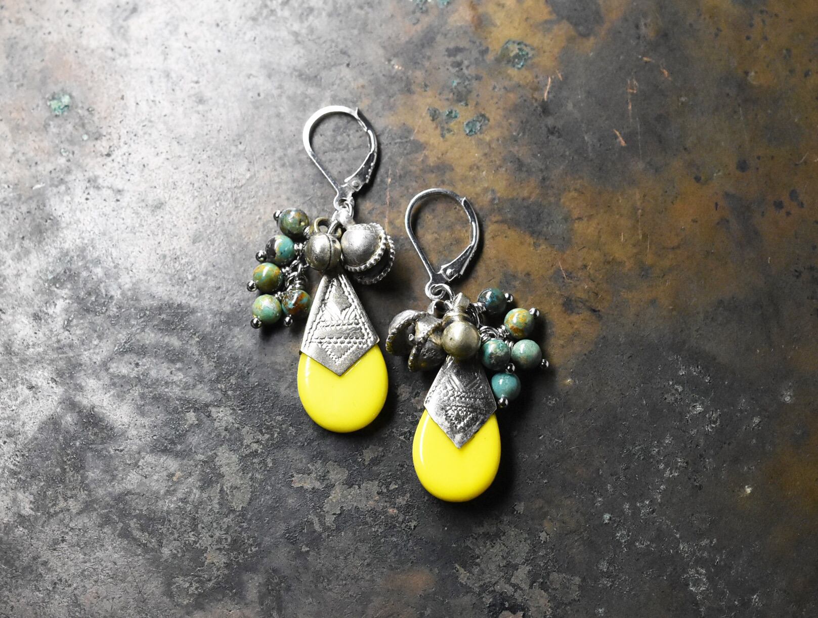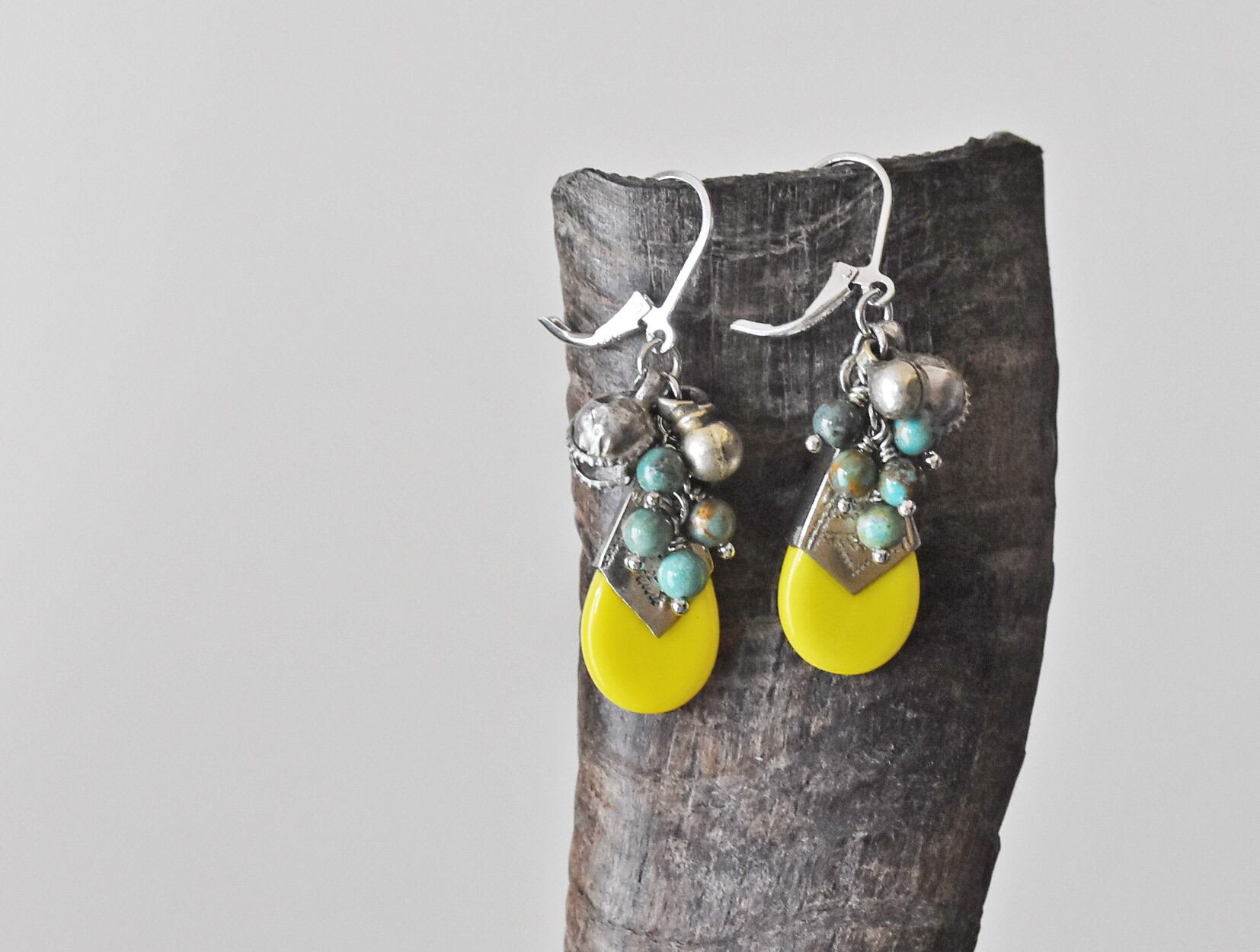 メタル装飾イエローウエディングビーズとアフガニスタンのベル、たわわなターコイズのピアス