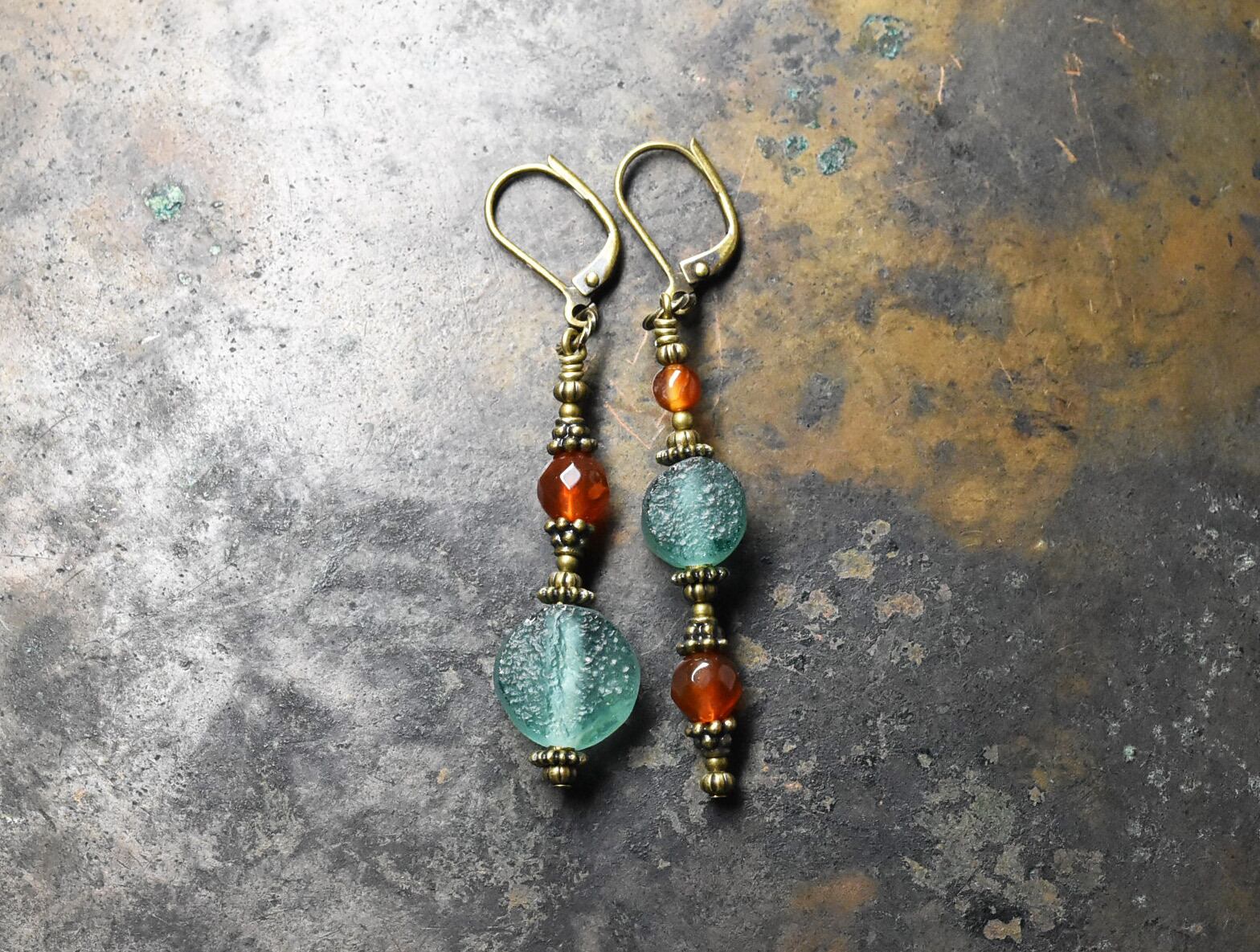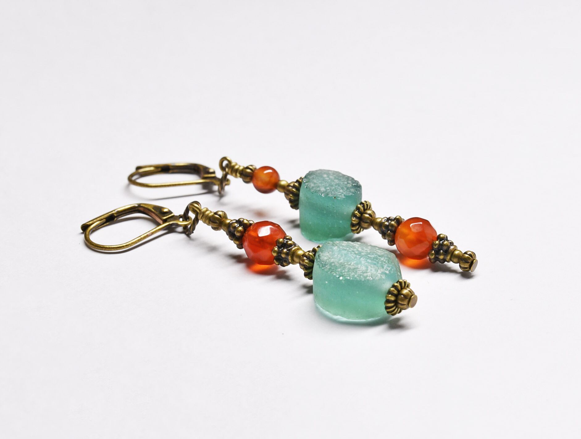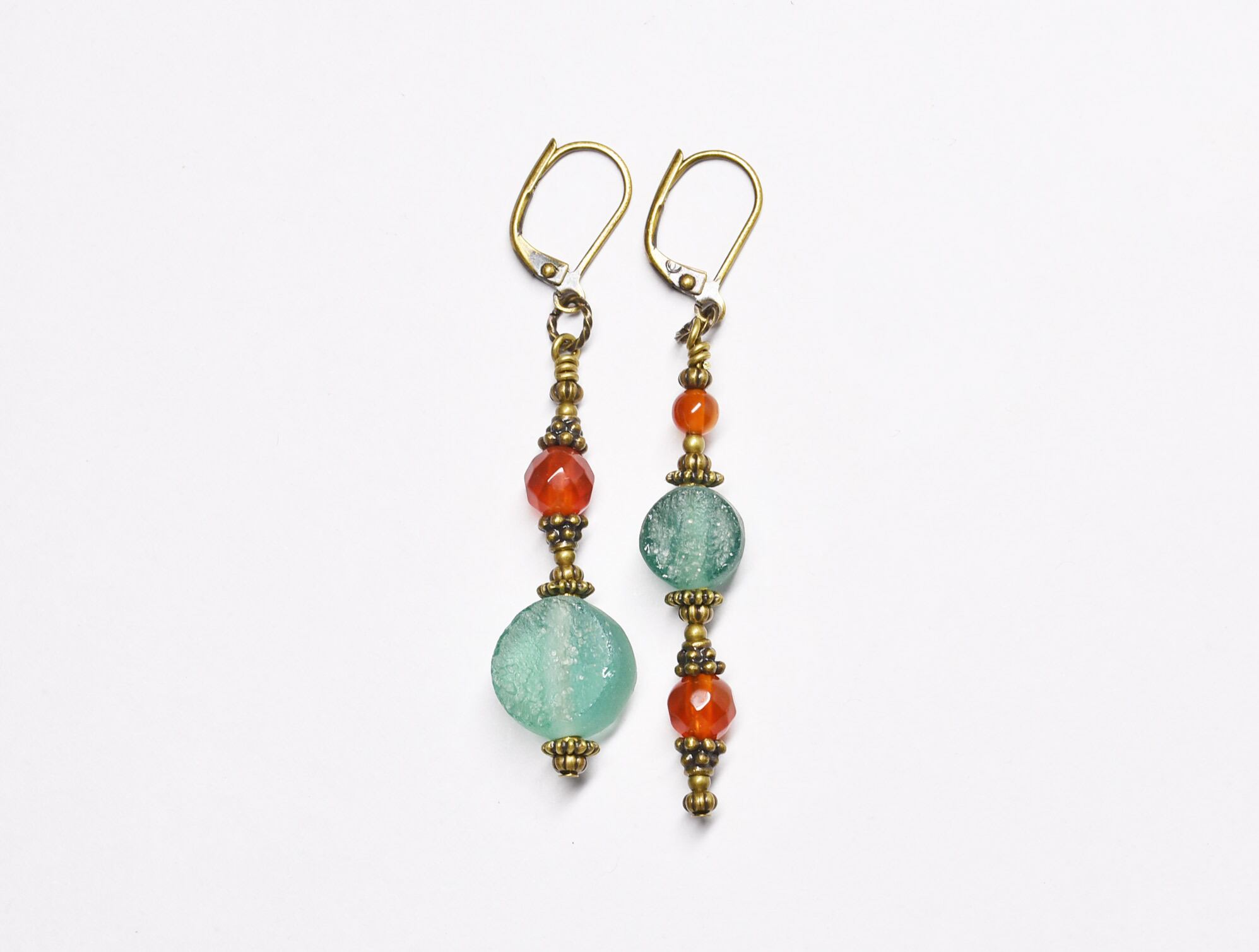ミントグリーンローマングラスとカーネリアンのアンシメトリーピアス