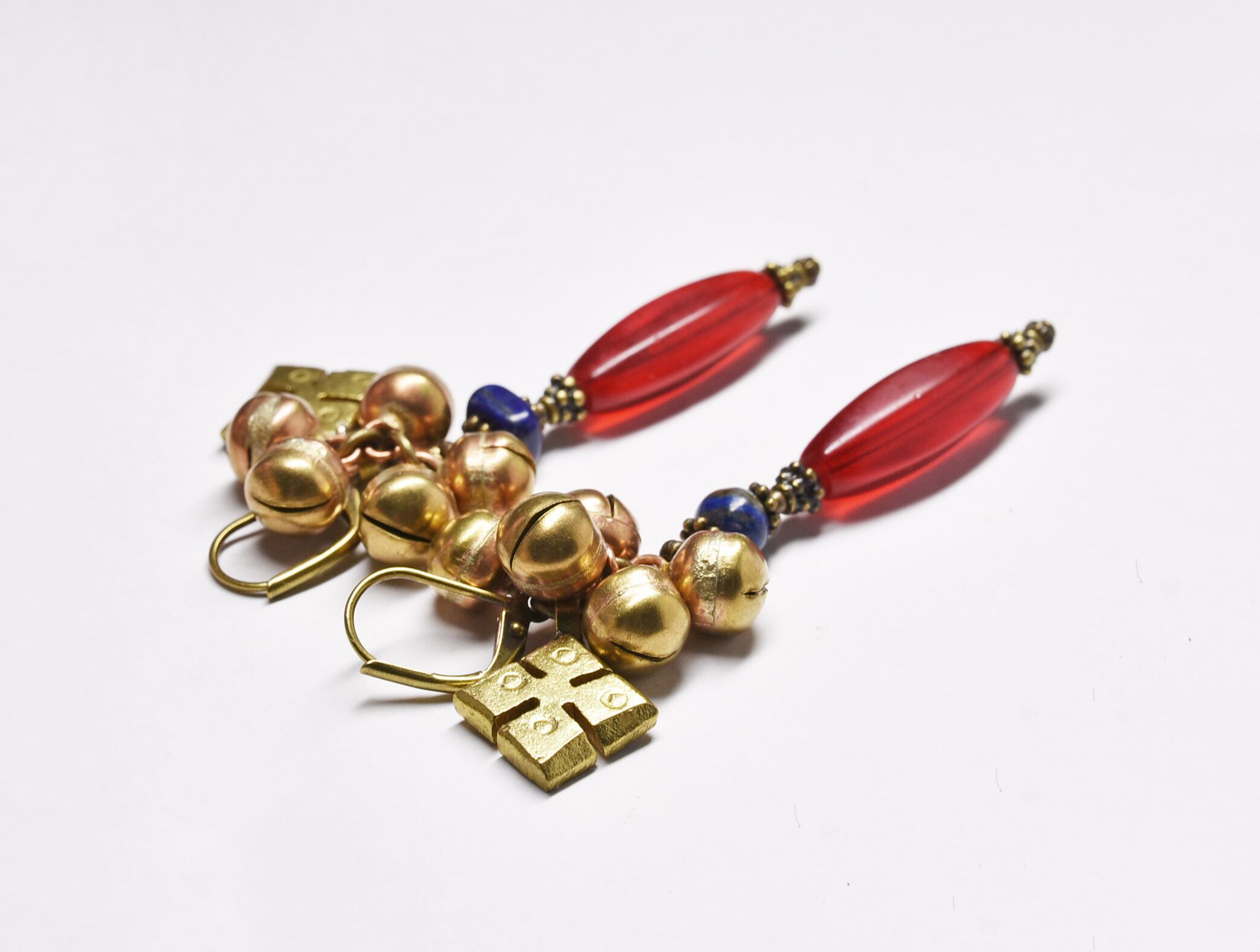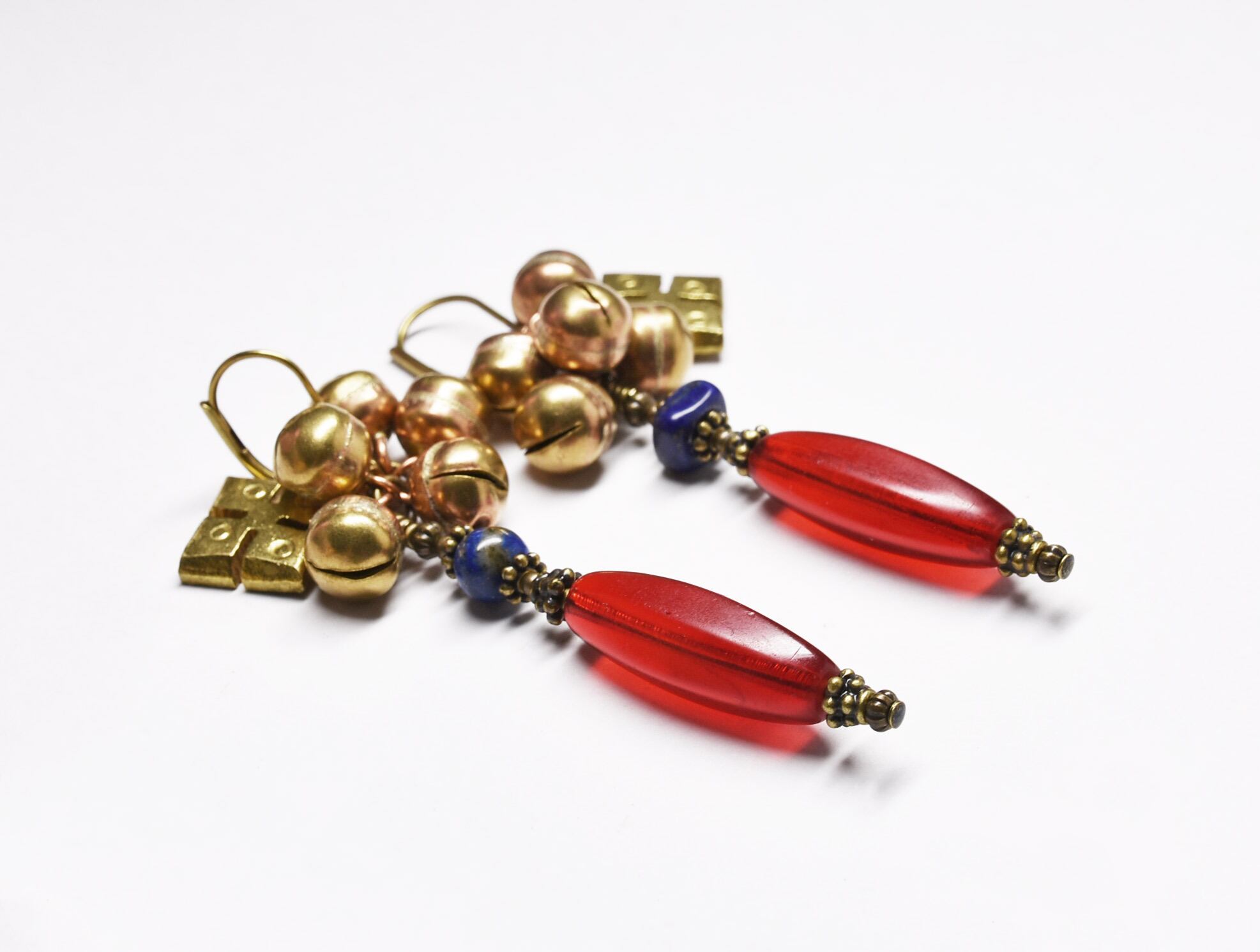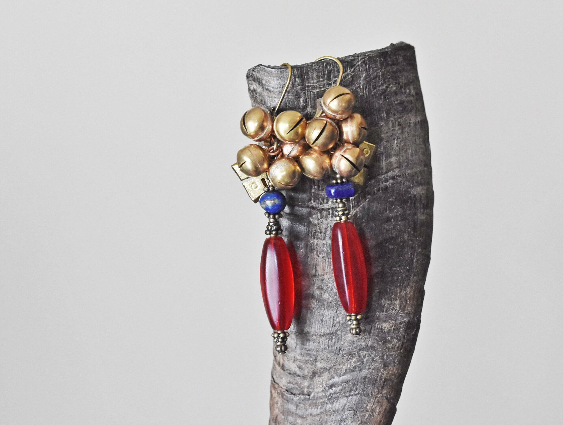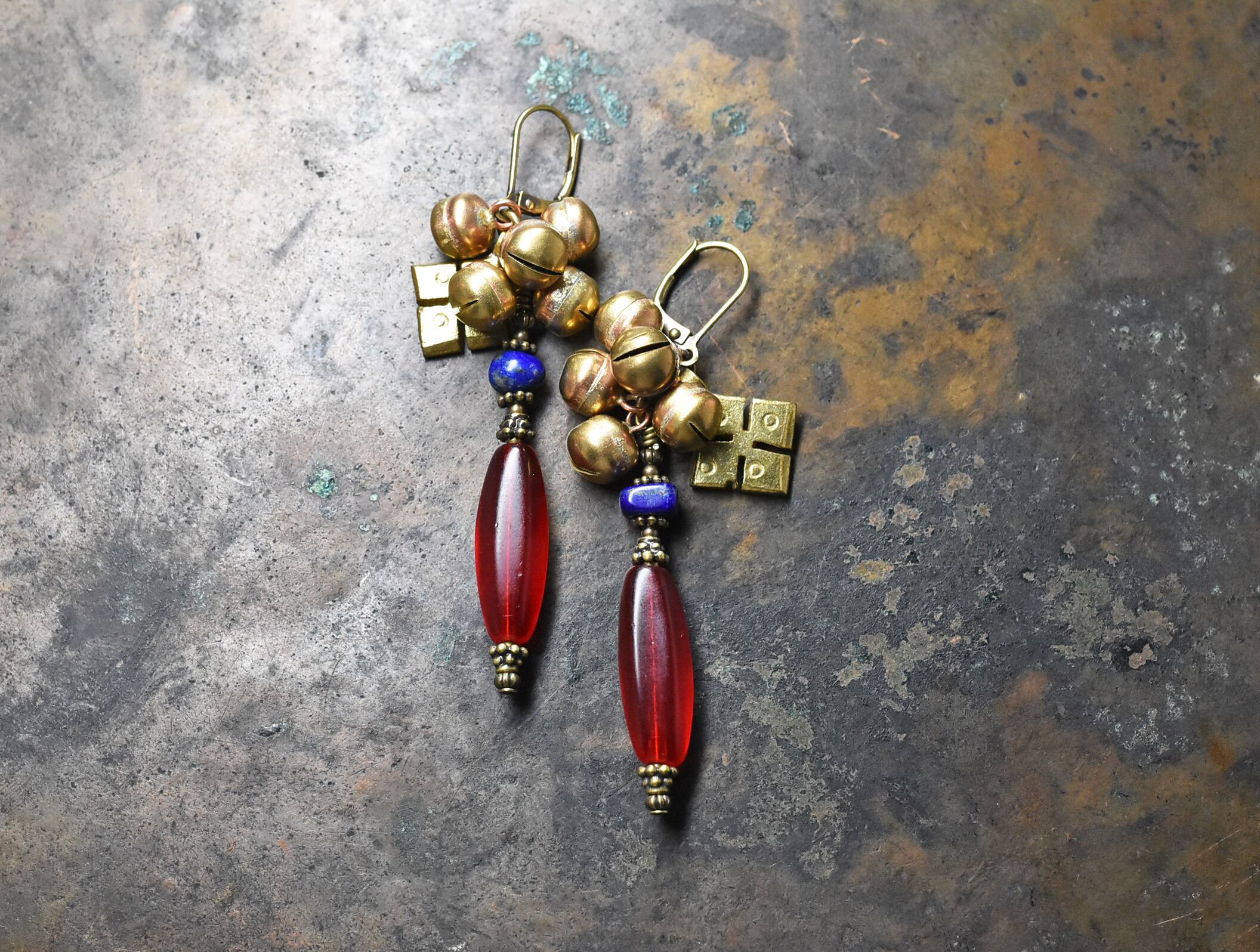 真っ赤なアンティークボヘミアビーズとたわわな鈴、エチオピアンクロスとラピスのピアス