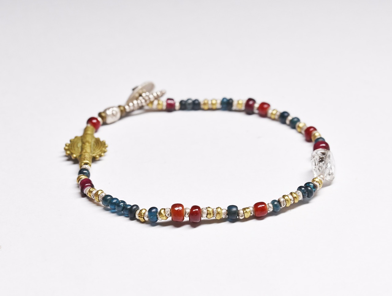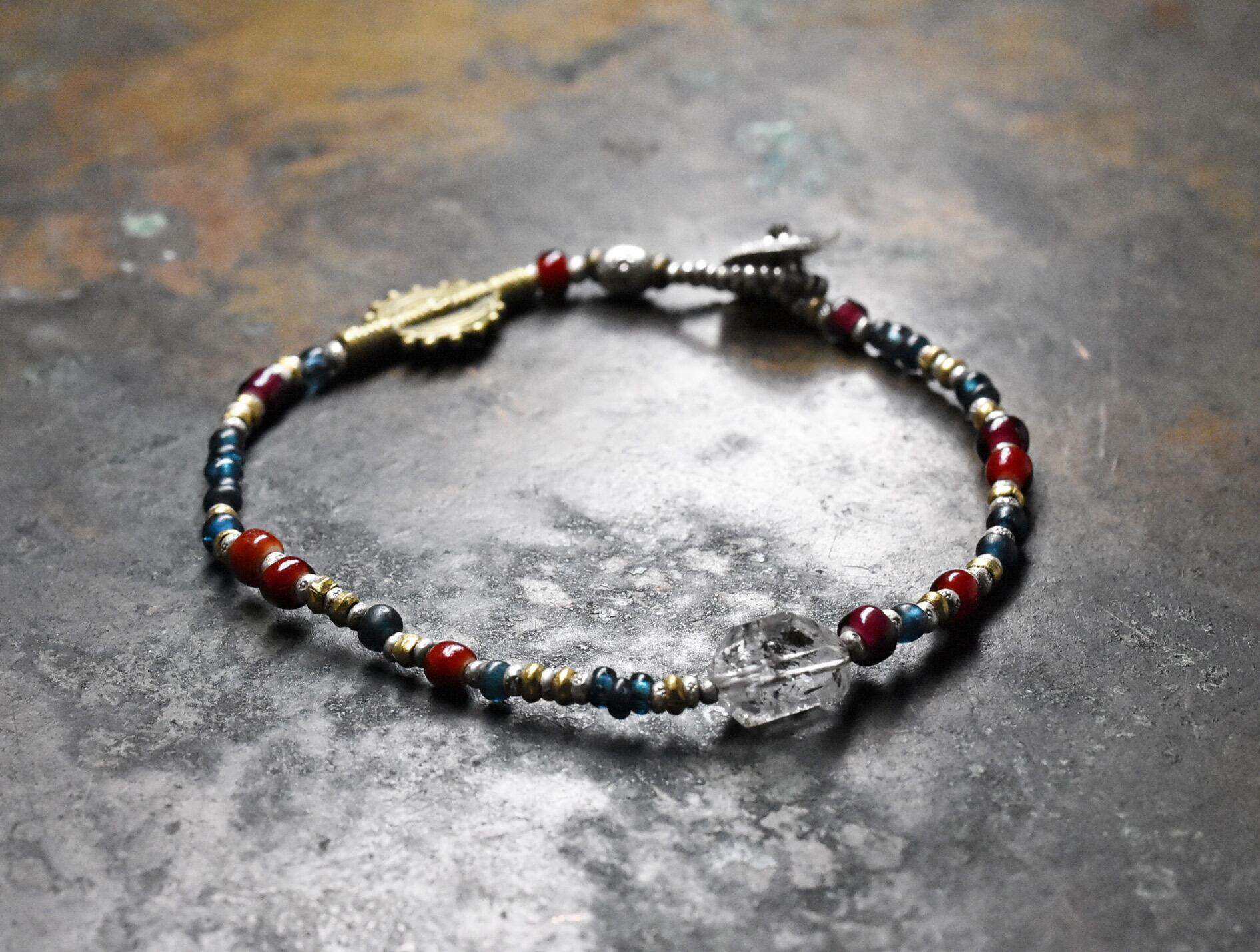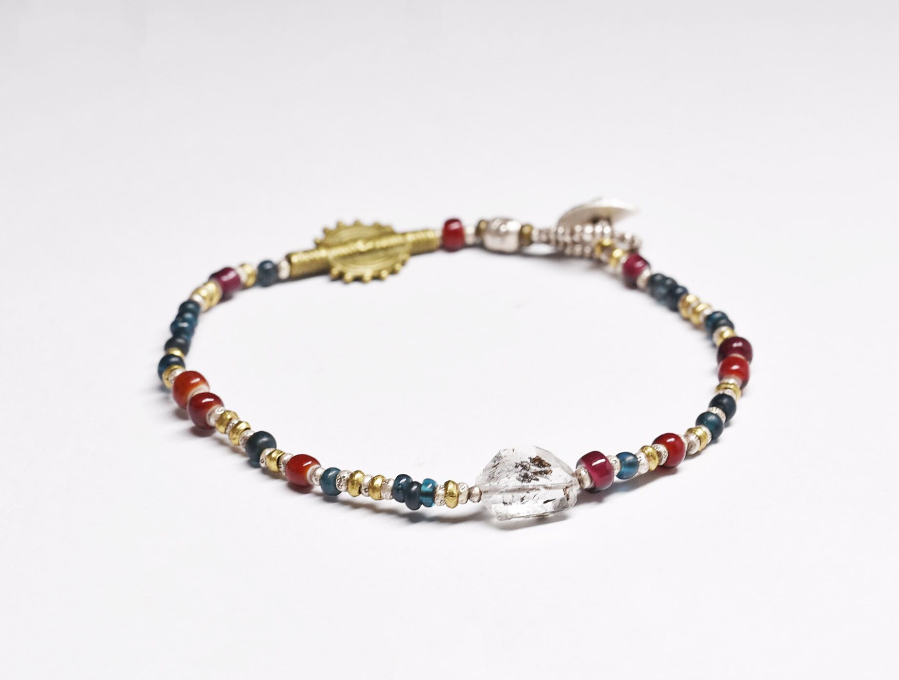 ハーキマーダイヤモンドとホワイトハーツ、インディゴブルービーズ、民族ブラス、カレンシルバーを繋いだブレスです。