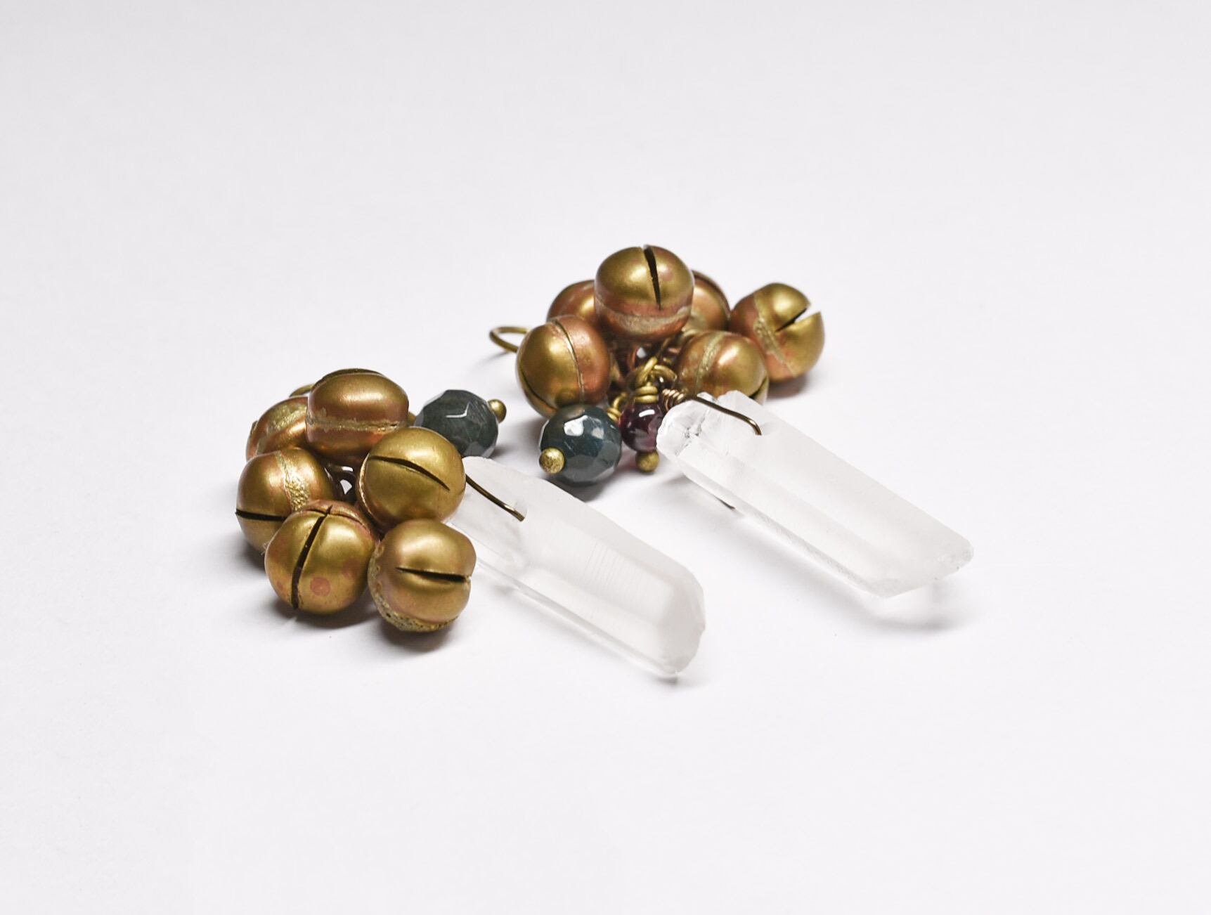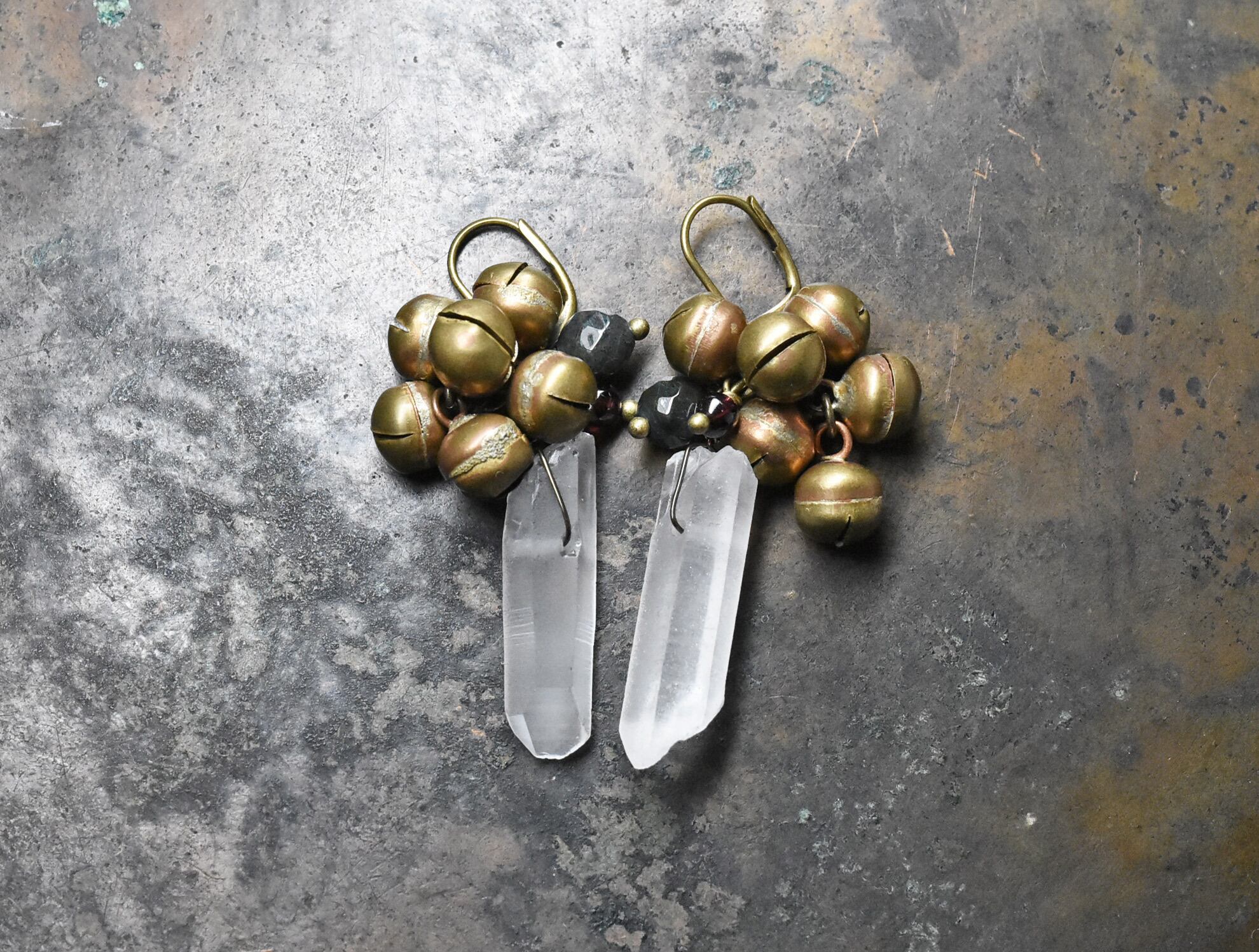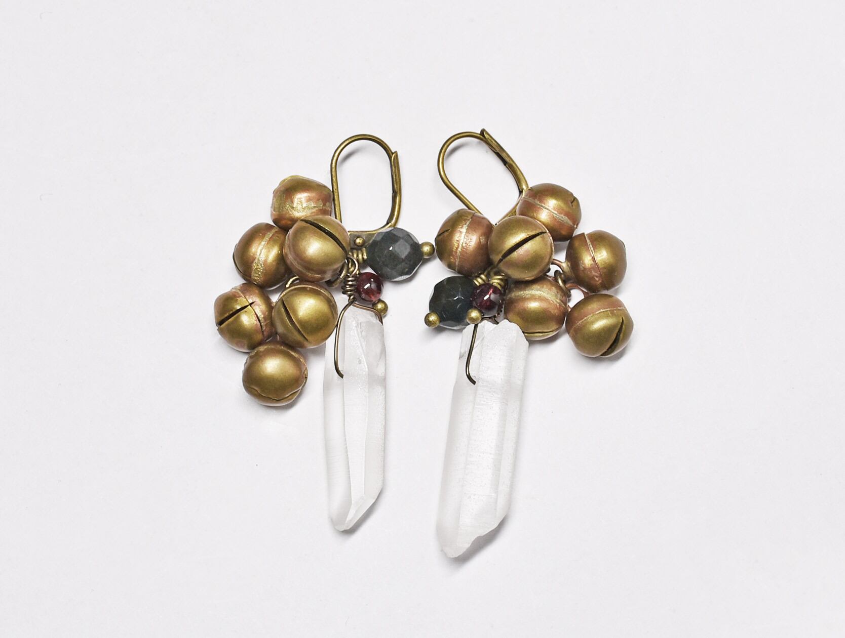 水晶とたわわな鈴、インディアンアゲート、ガーネットを繋いピアスです。