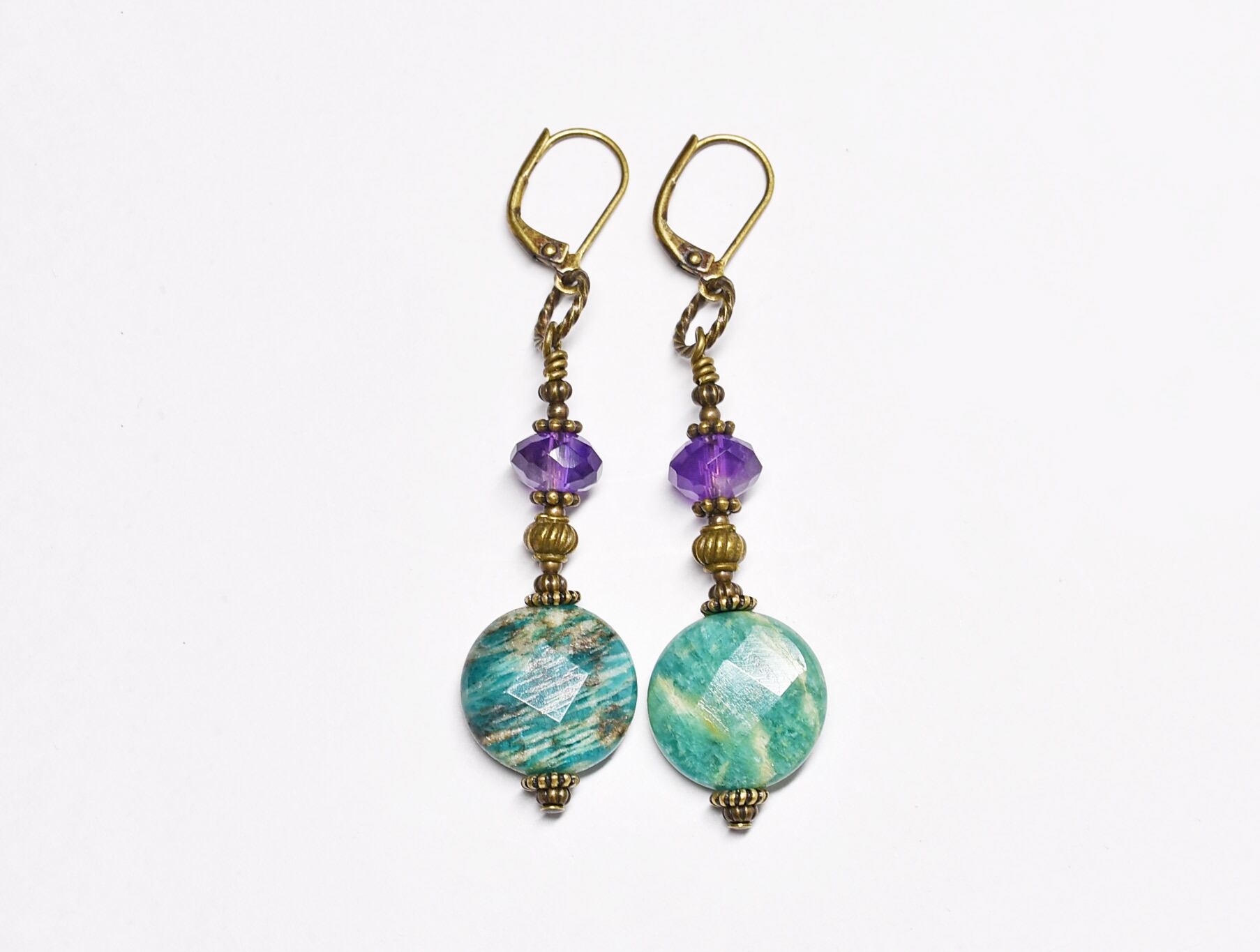 アマゾナイト、アメジスト、ブラスビーズを繋いだピアスです。