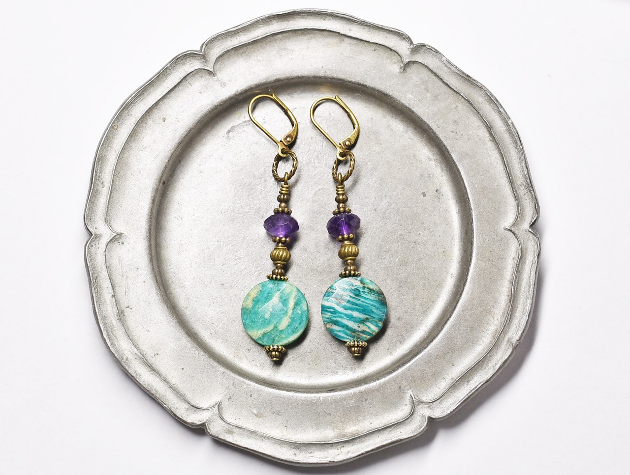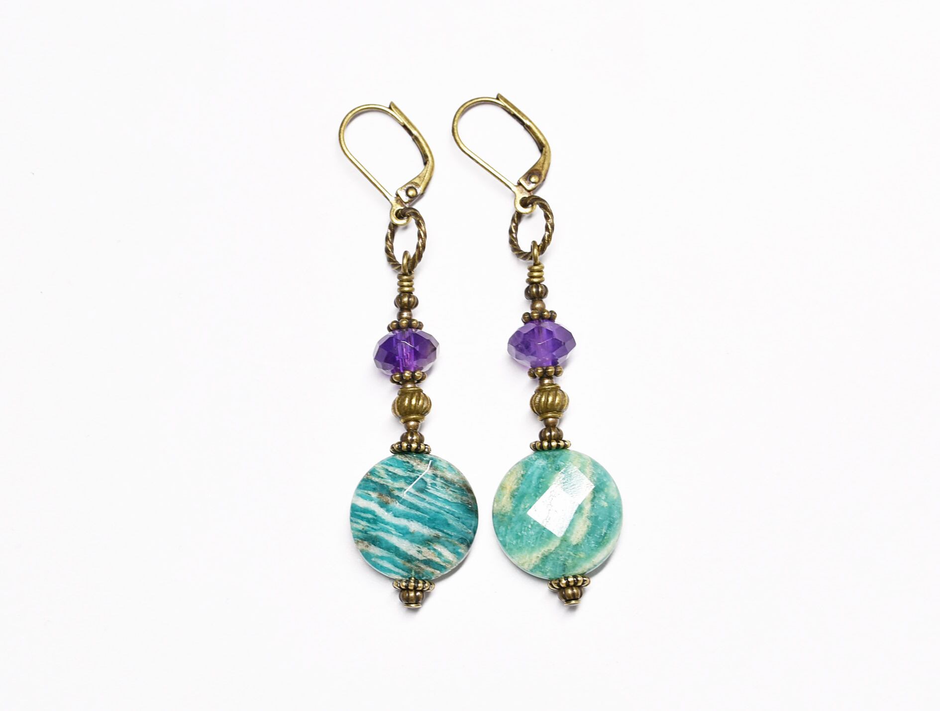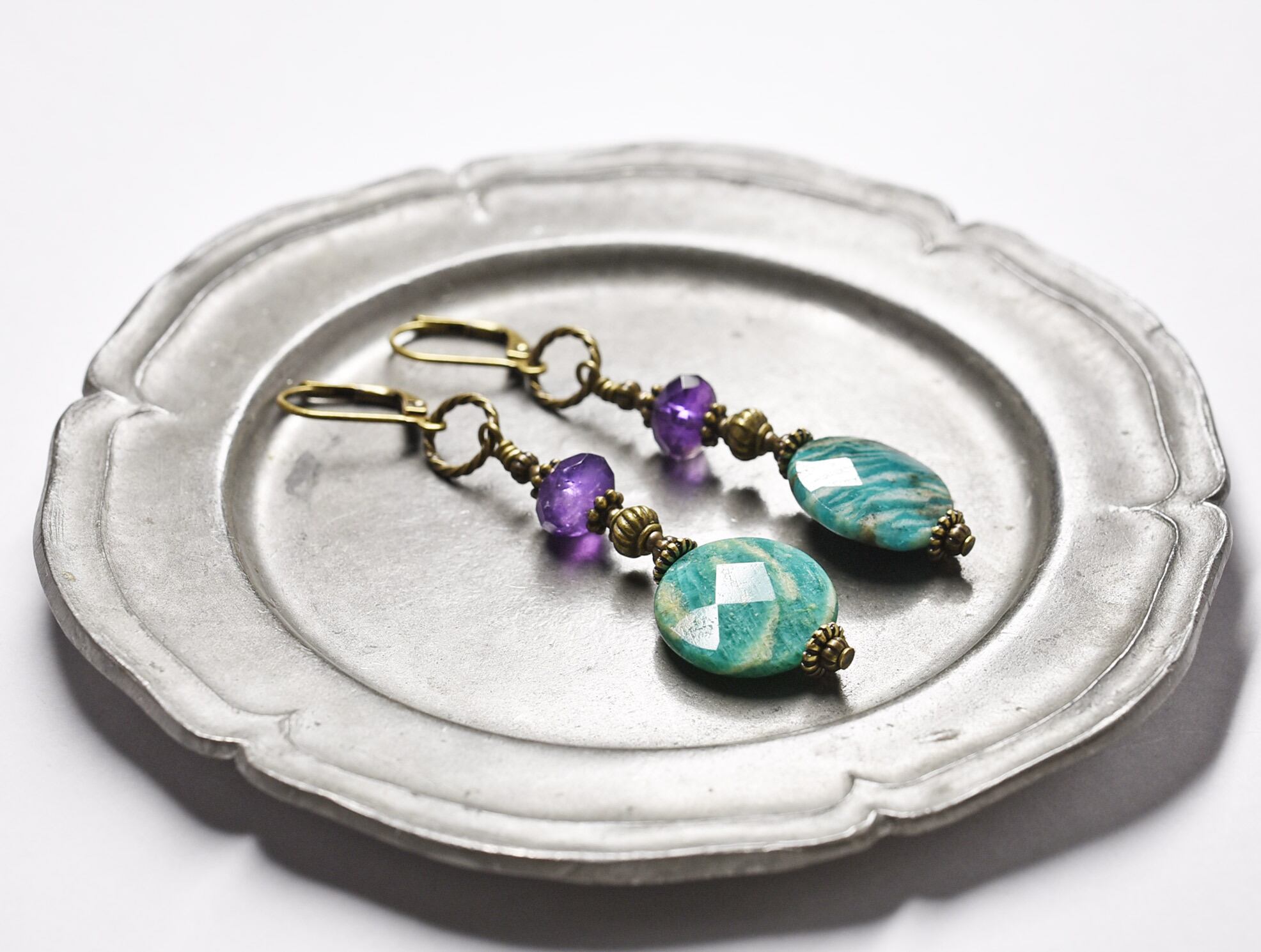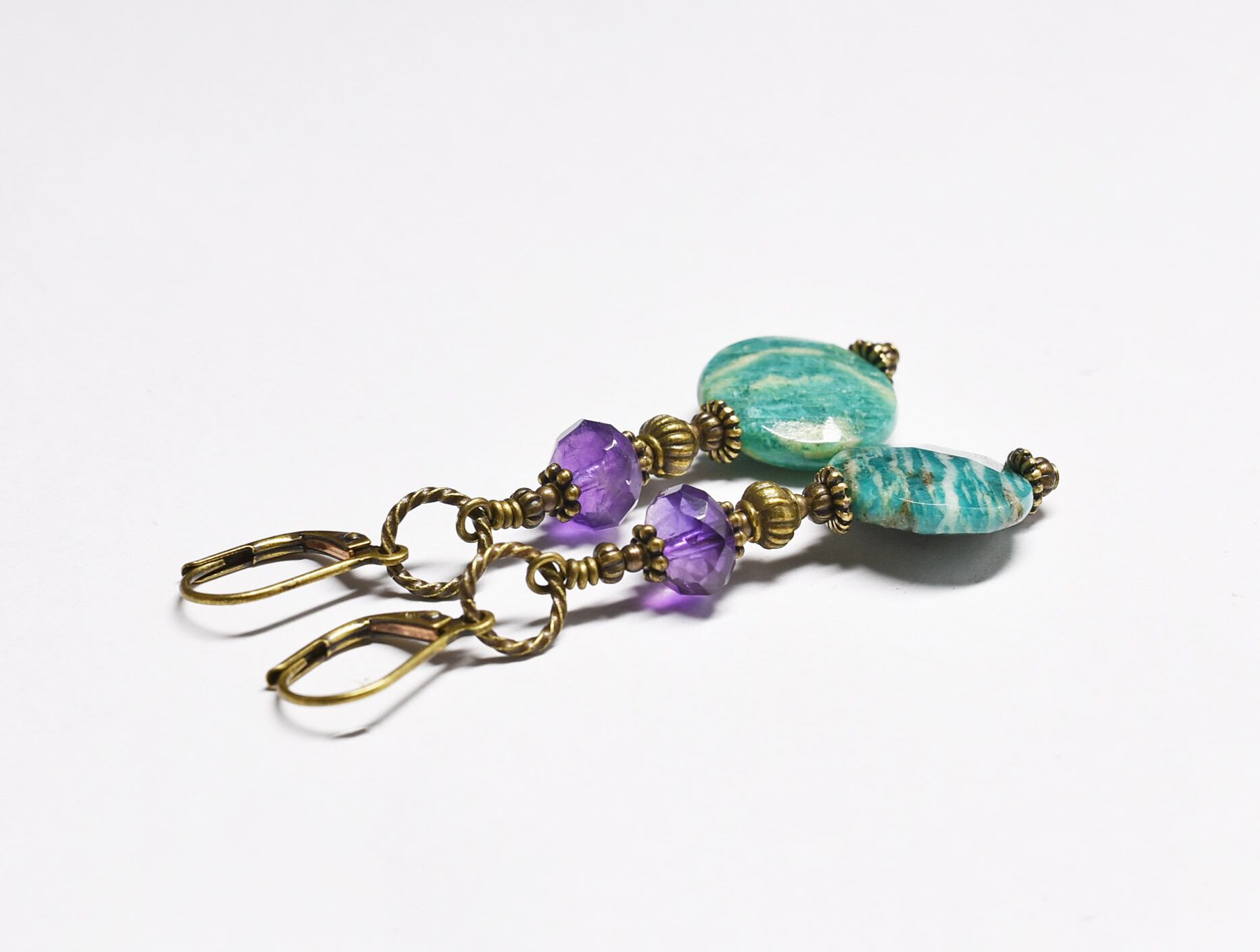 アマゾナイトとアメジスト、ブラスビーズのピアス