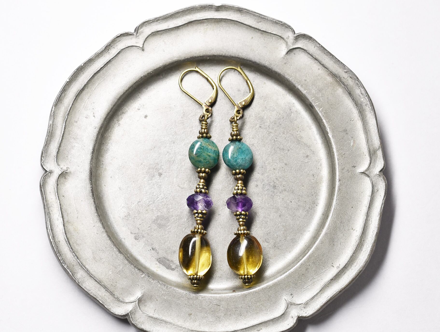 レモンクォーツとアメジスト、アマゾナイトのピアス