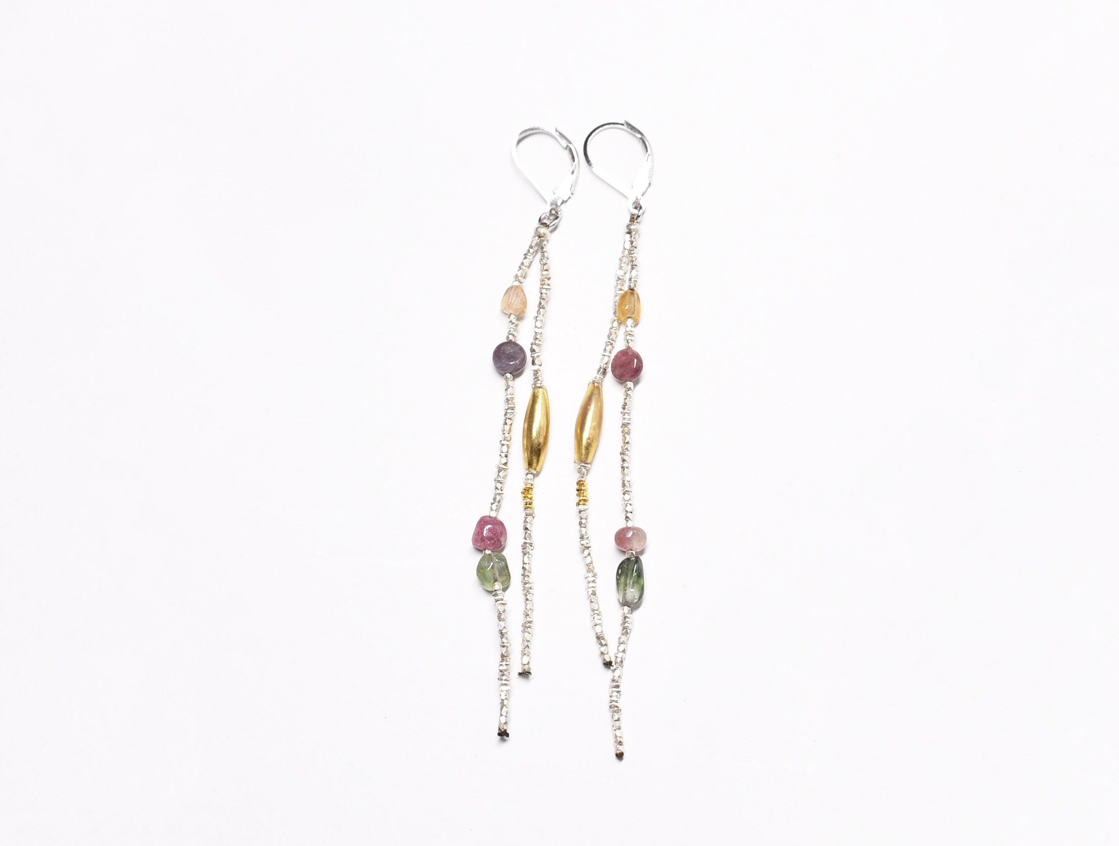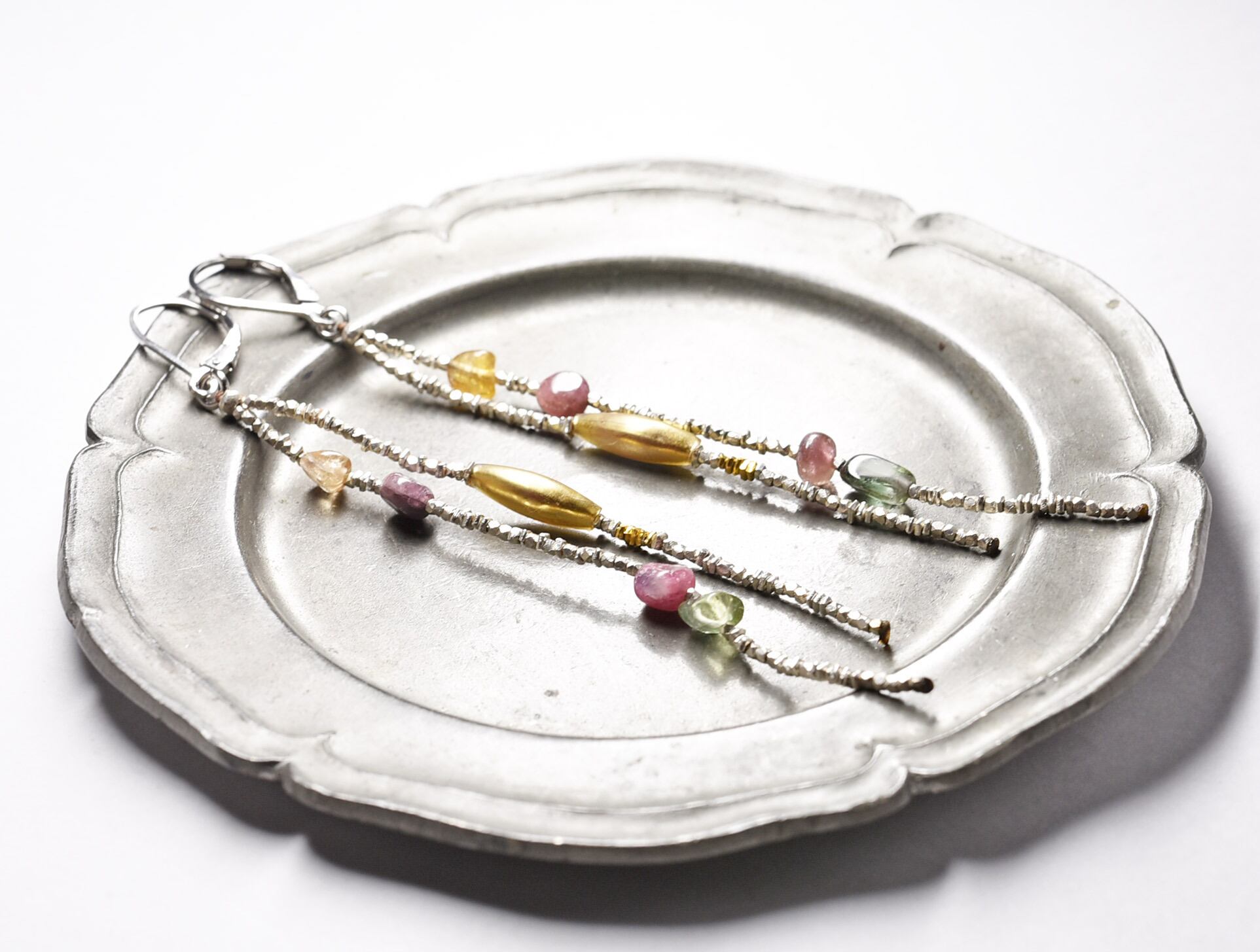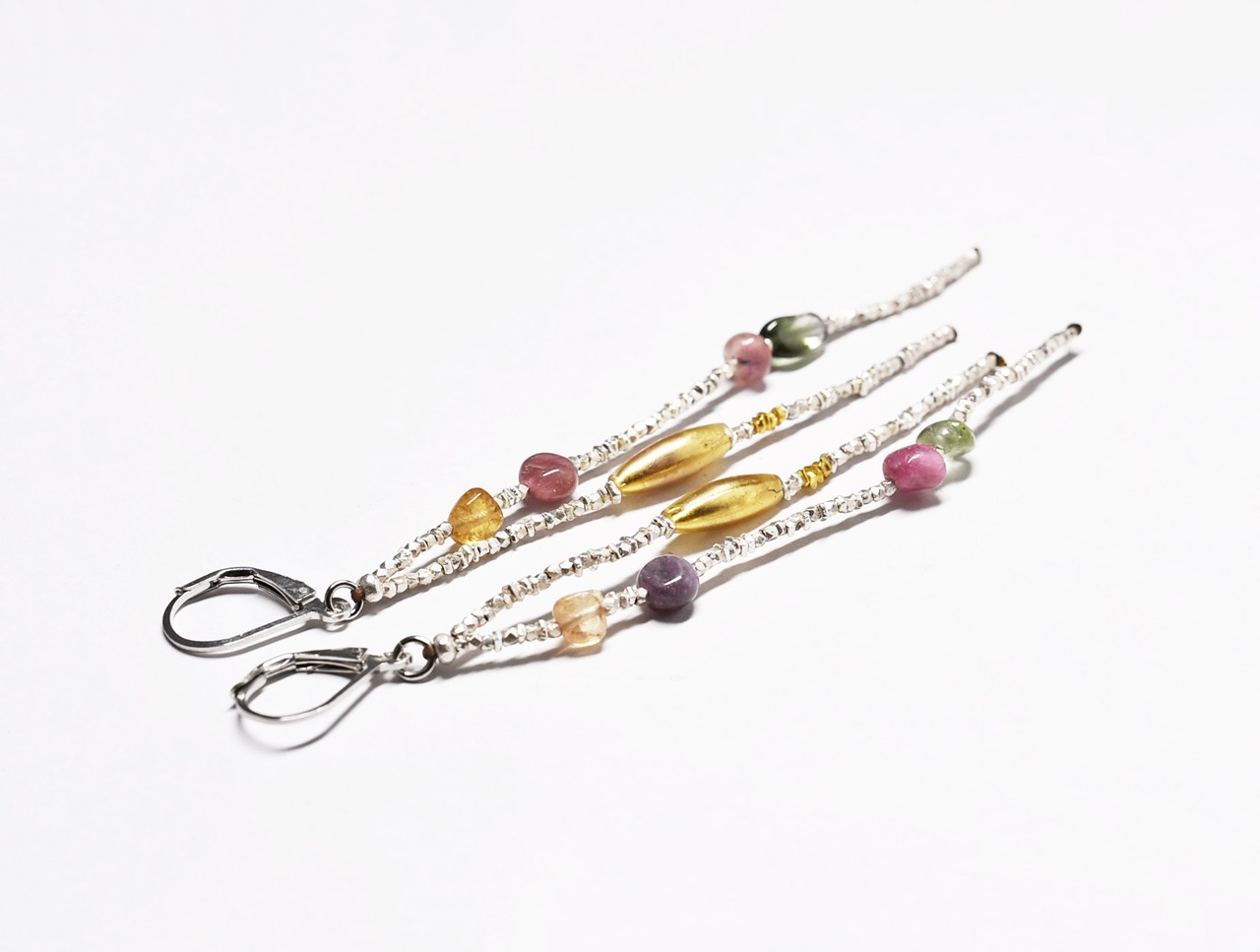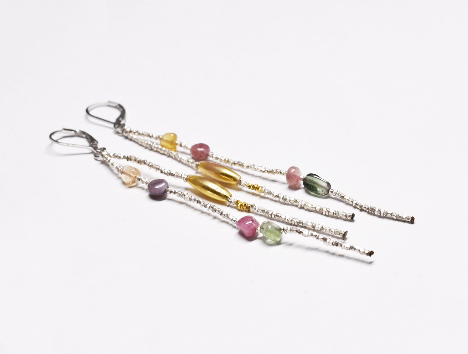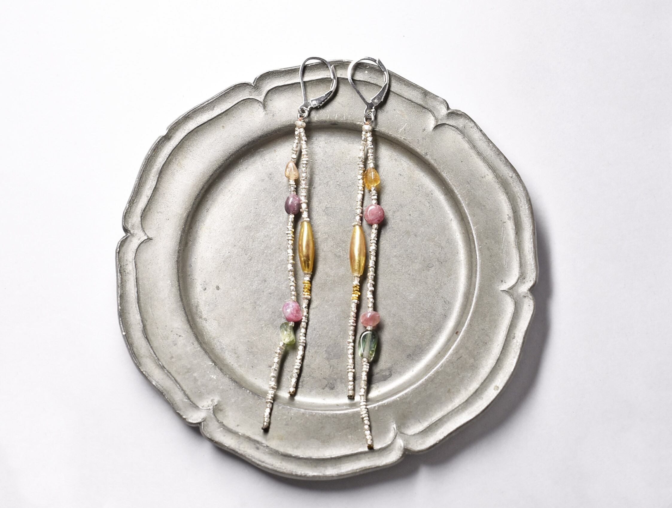 フランス吹きガラスとトルマリン、煌めくカレンシルバービーズのロングピアス