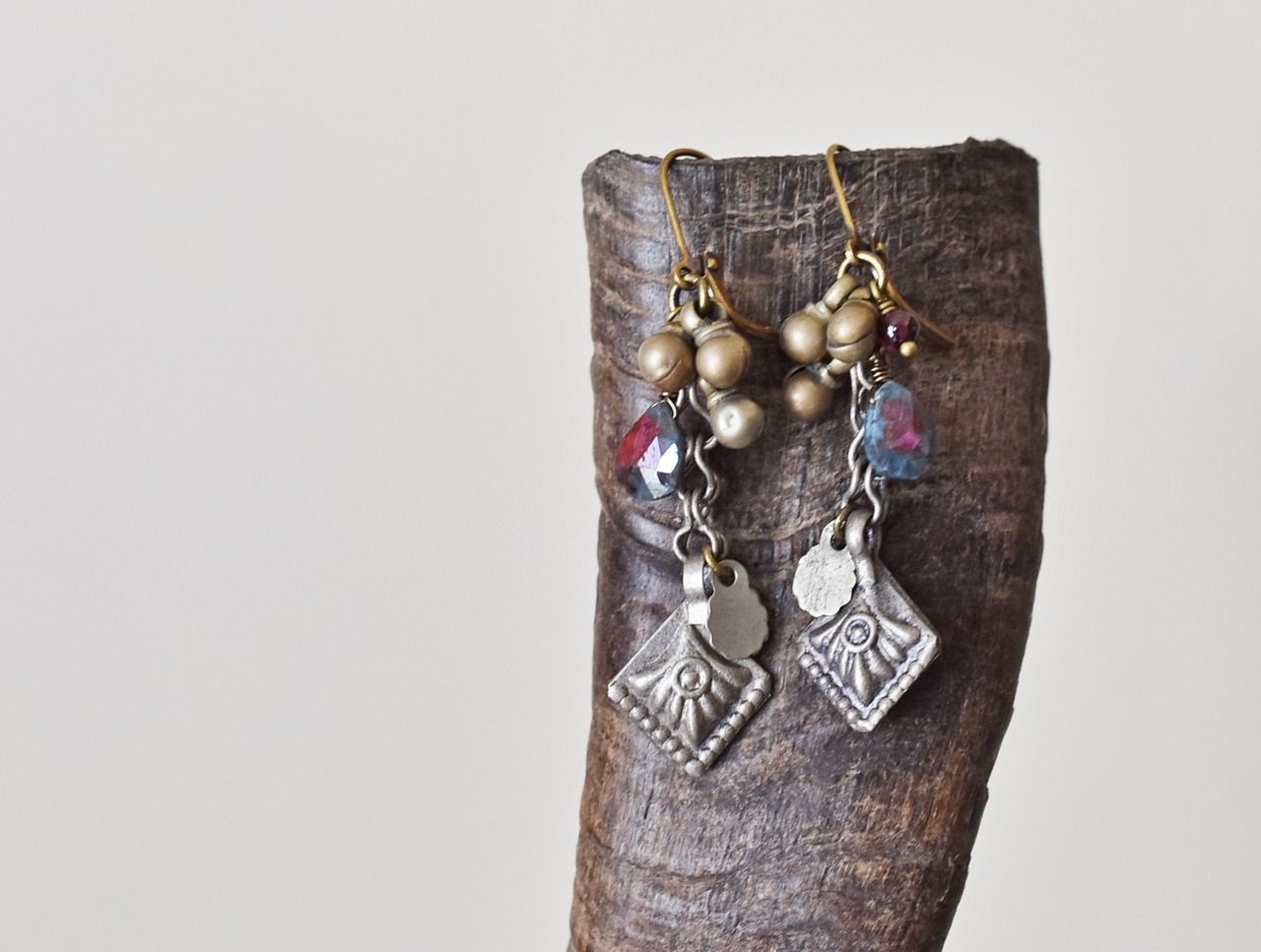 チェーンのパーツはアフガニスタンのクチ族が民族衣装や装飾品に使われていたメタルパーツです。少しぷっくりとしたスクエア型のチャームにいかにも手作り!と言った感じのチェーンが付いてます。
