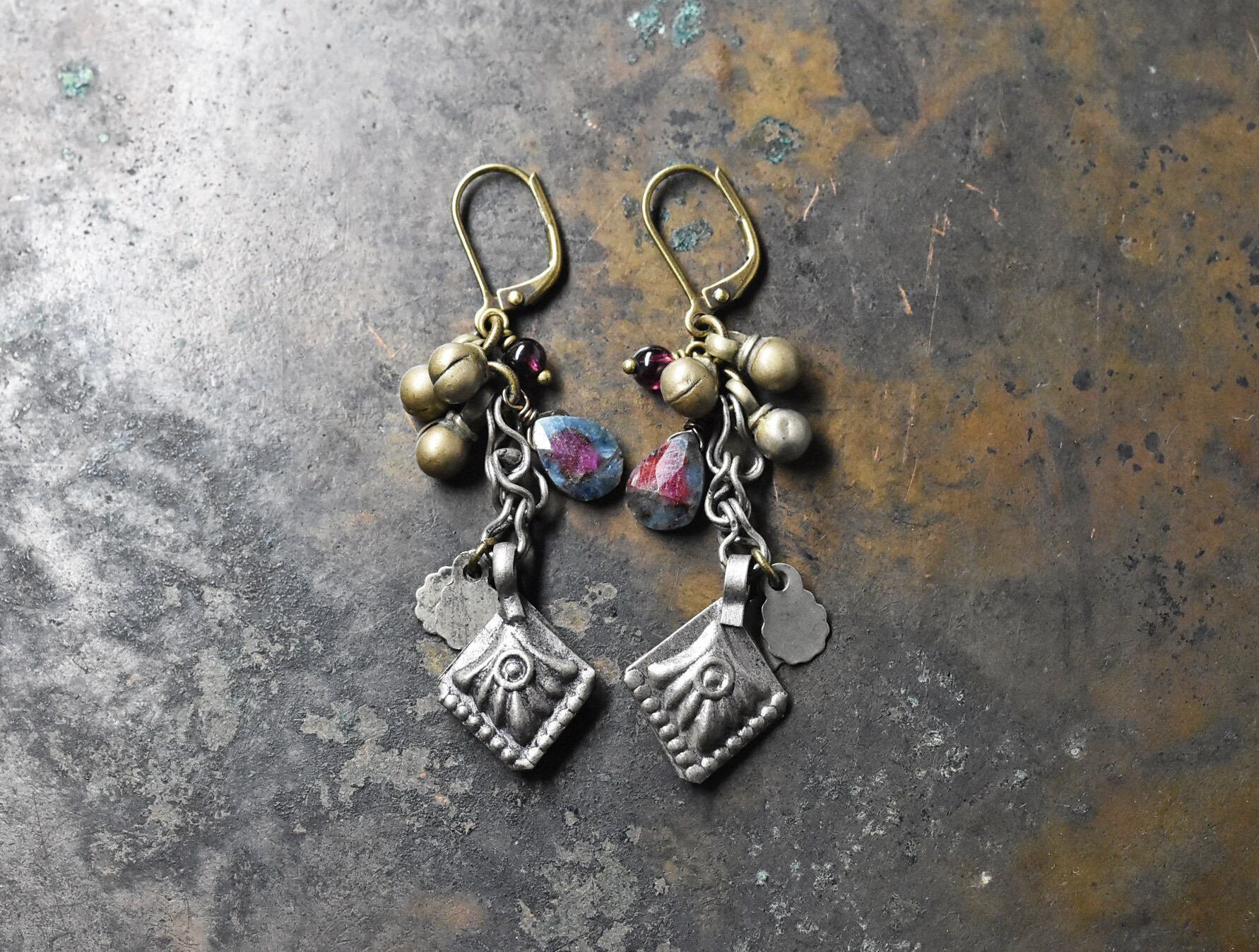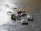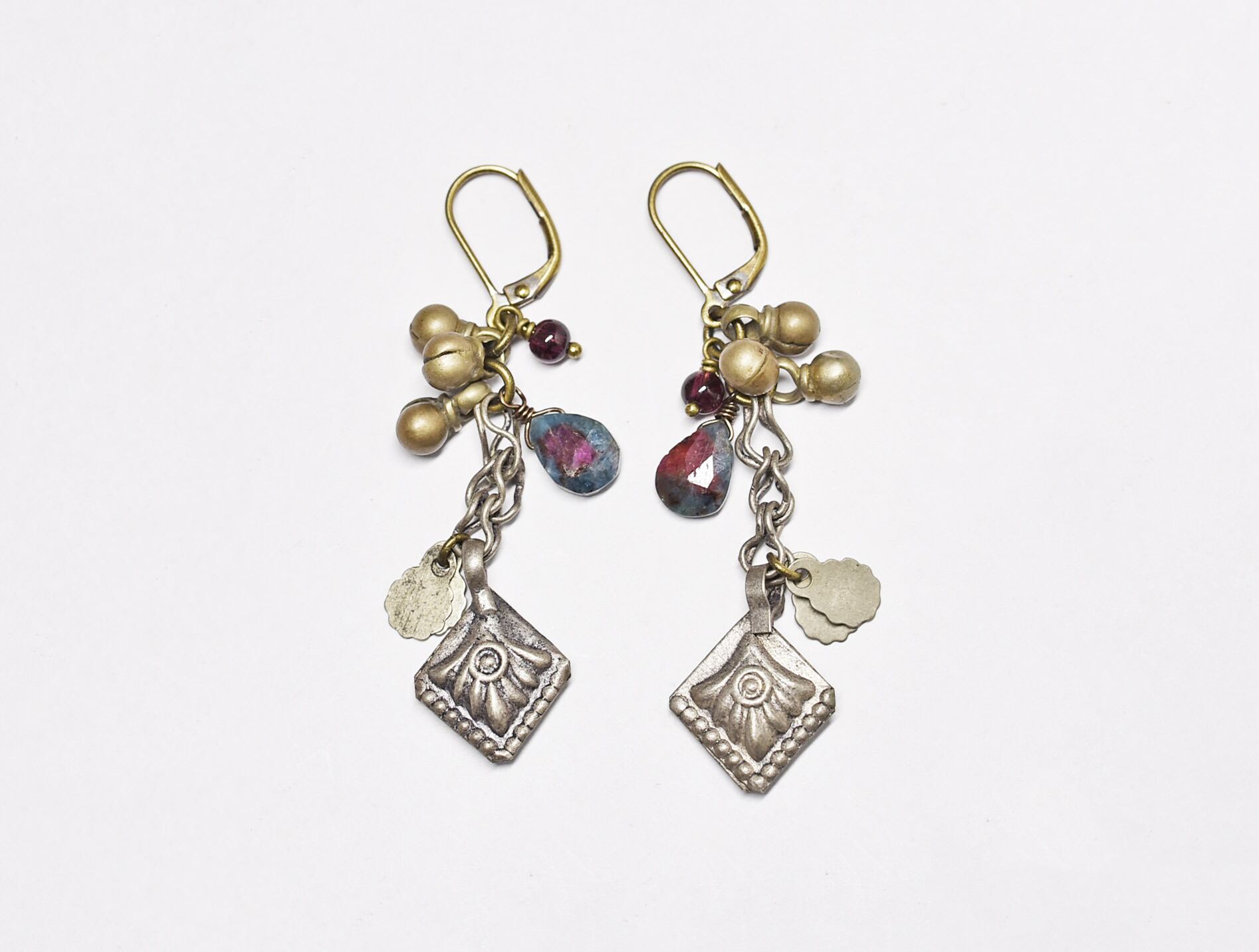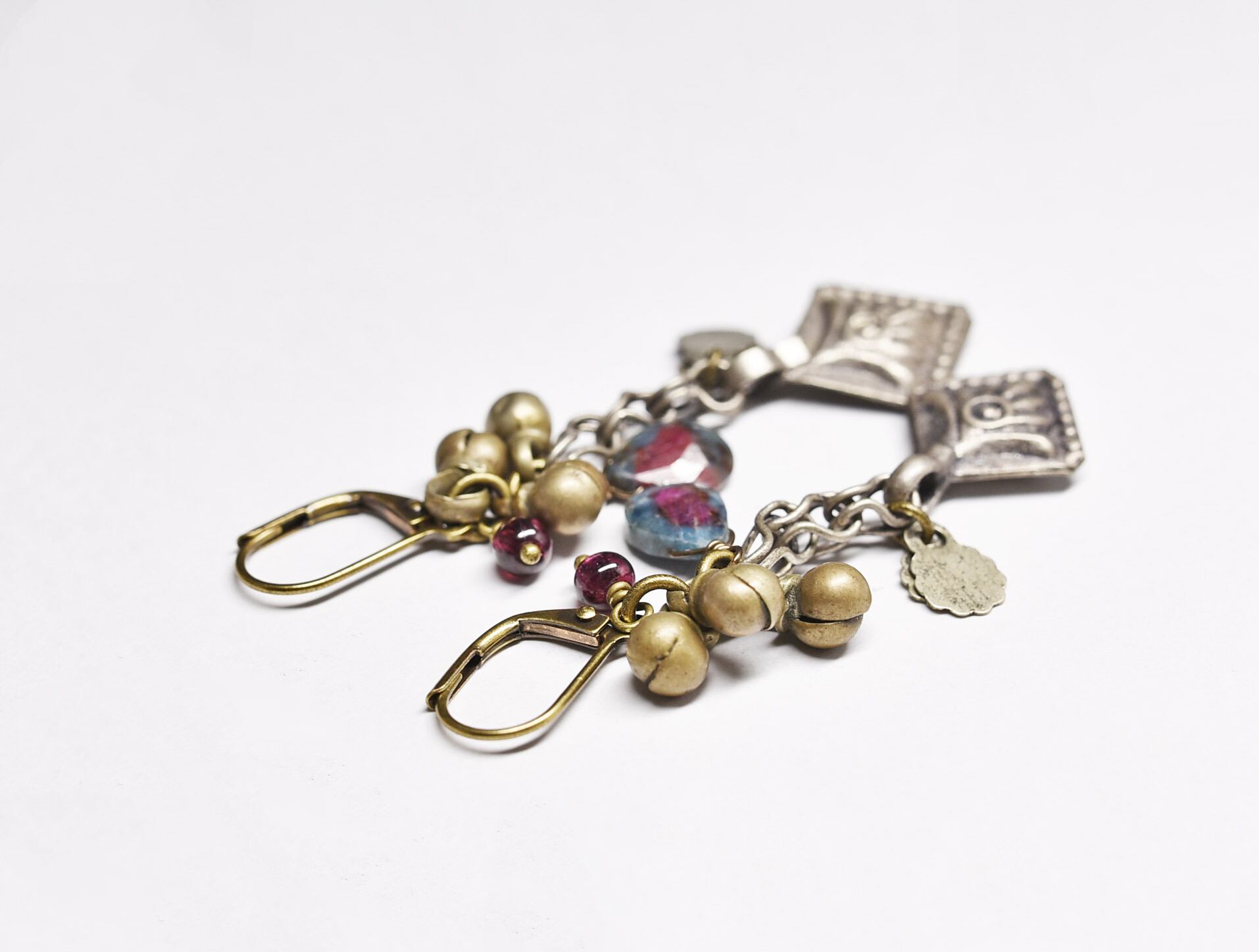 民族のメタルパーツや鈴、ルビーインゾイサイト、ガーネットを繋いだ揺れるピアスです。