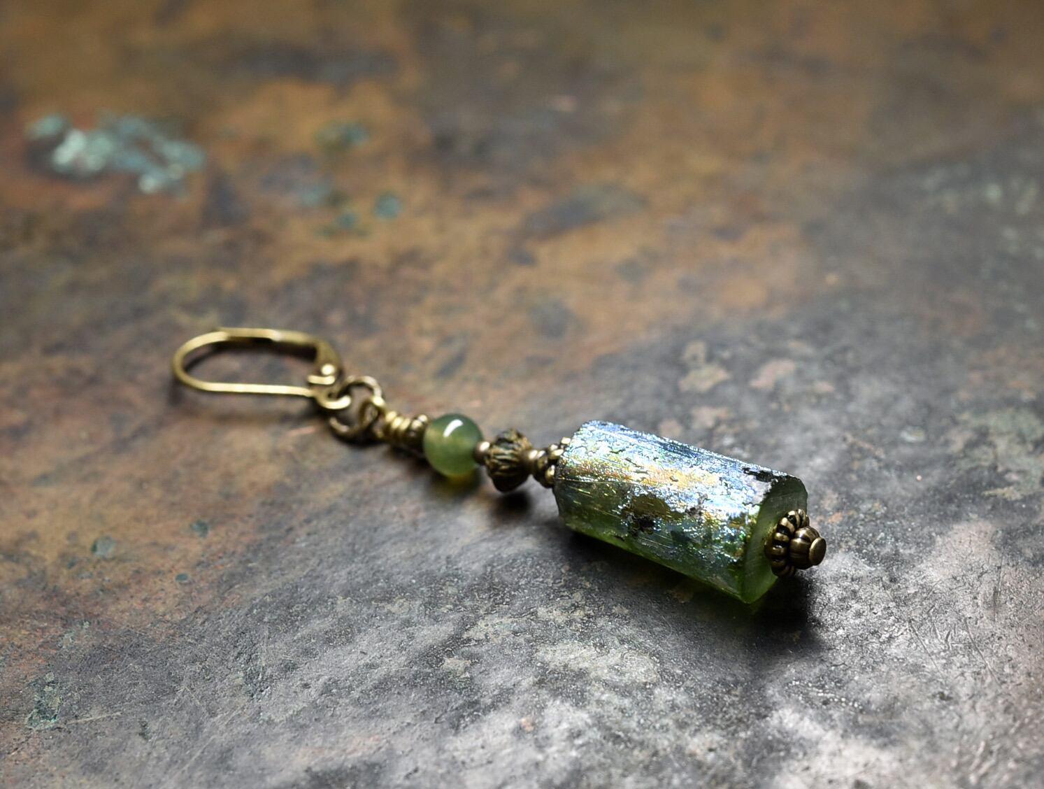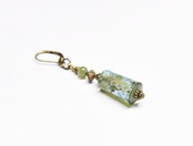 ピスタチオグリーンのローマングラスと、インディアンアゲート、ブラスビーズを繋いだ片耳のピアスです。