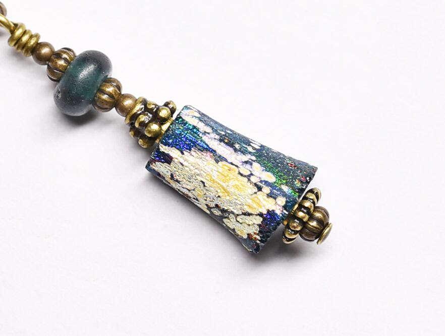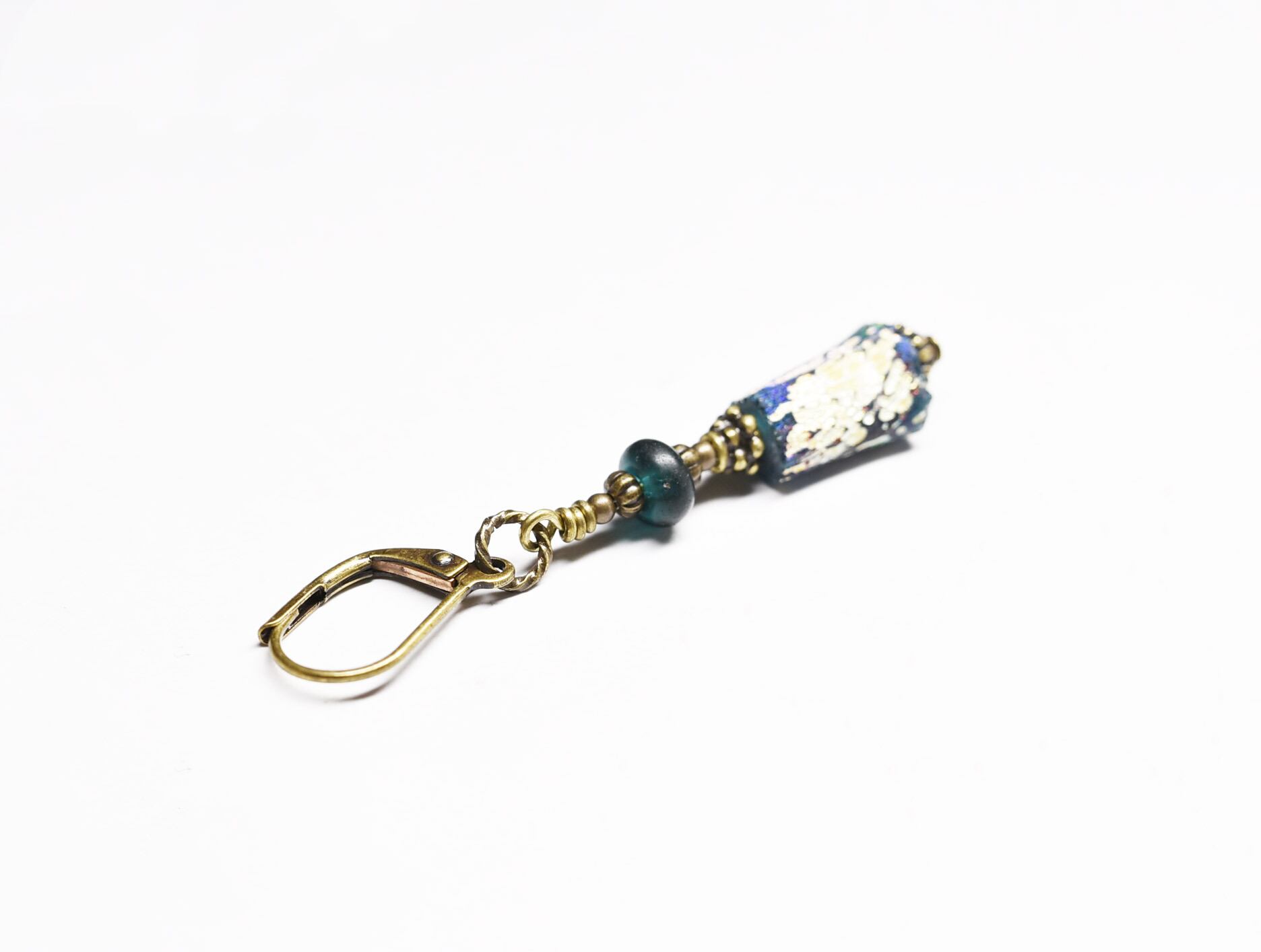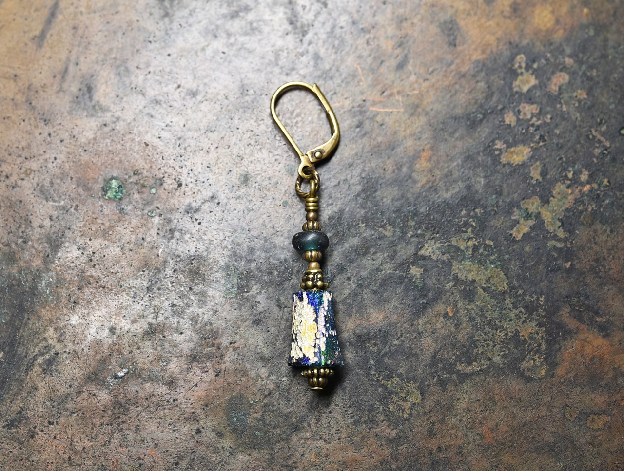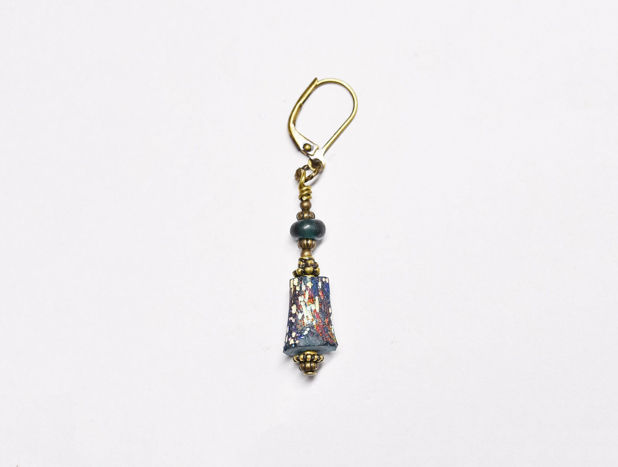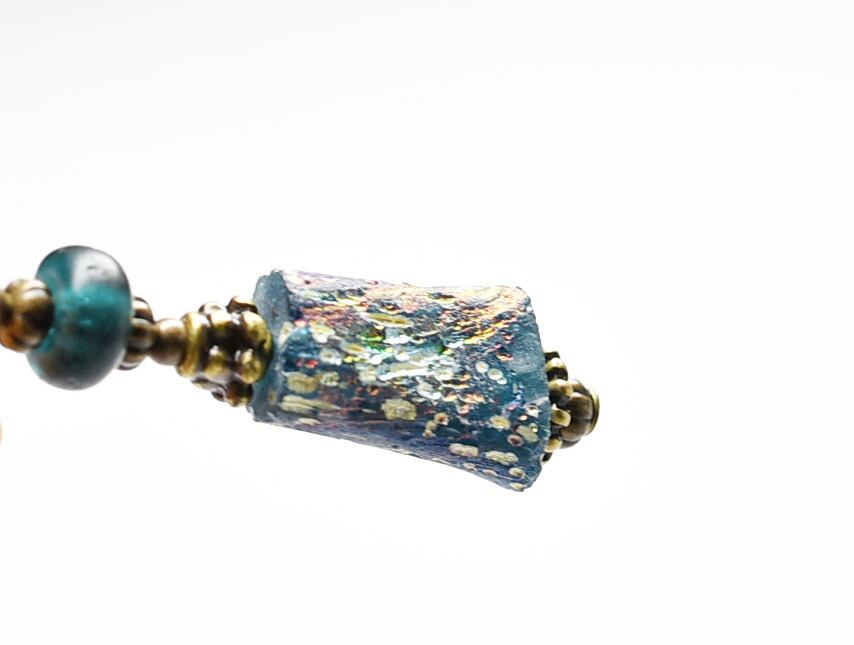 ブルーグリーンのローマングラスと、インドパシフィックビーズを繋いだ片耳のピアスです。