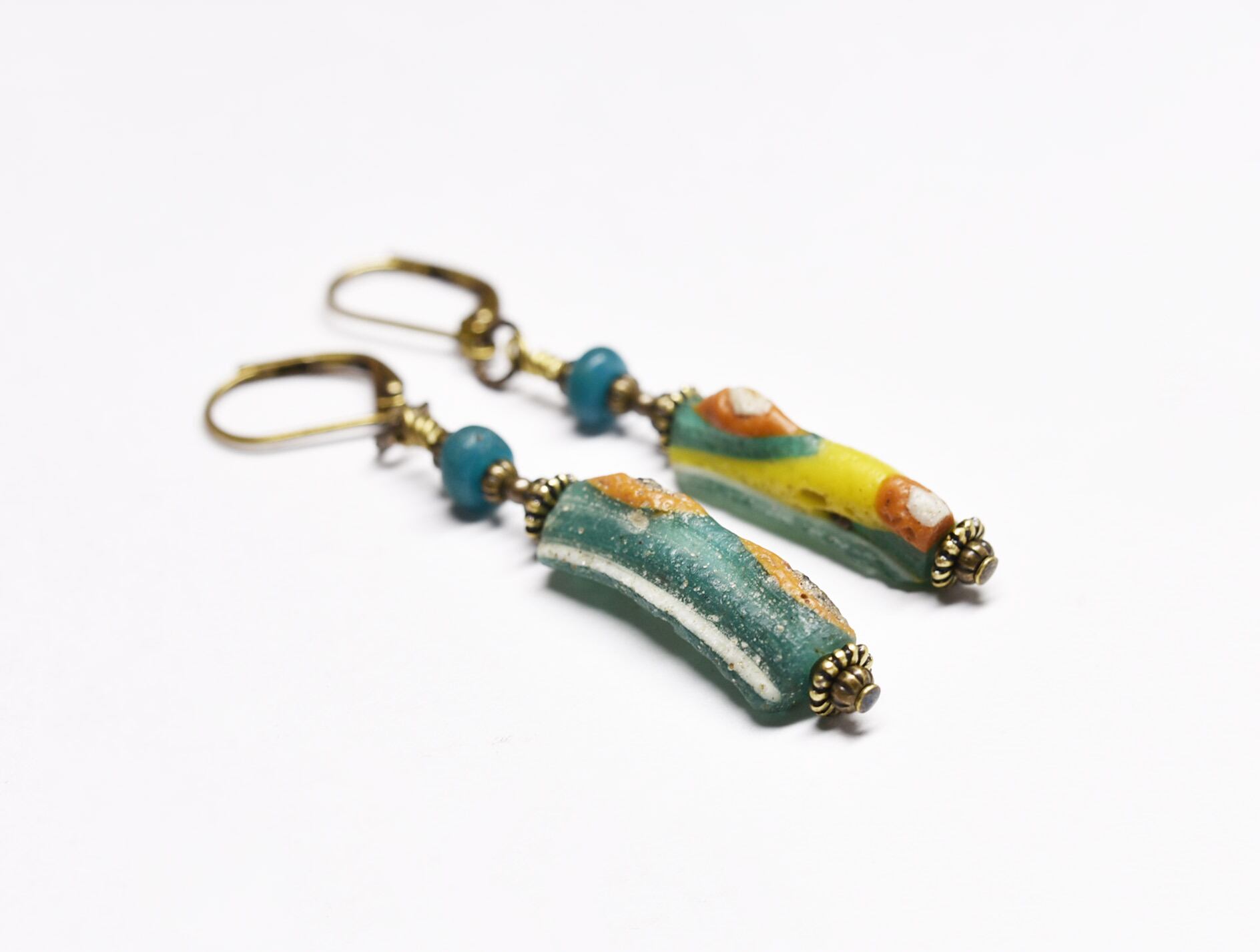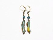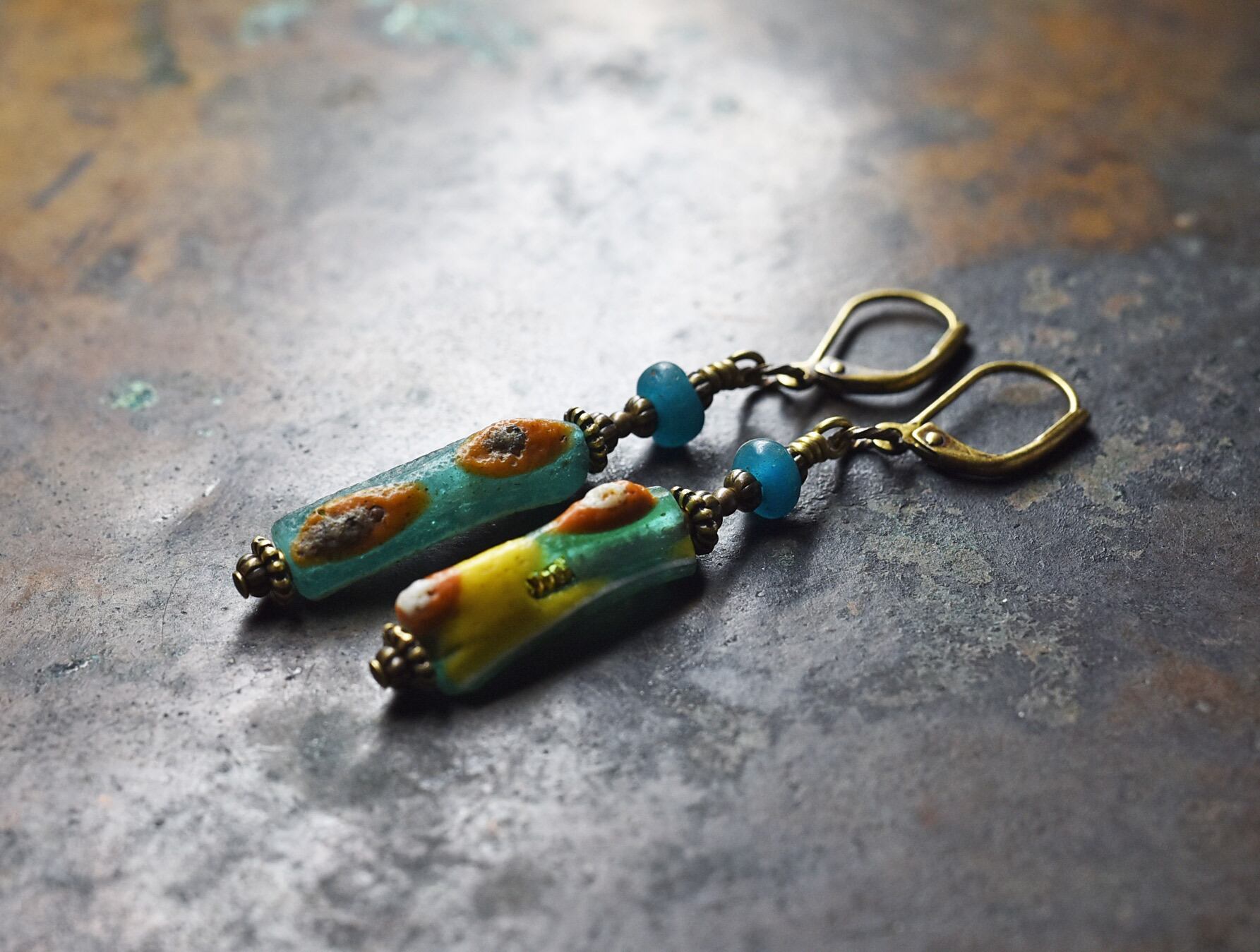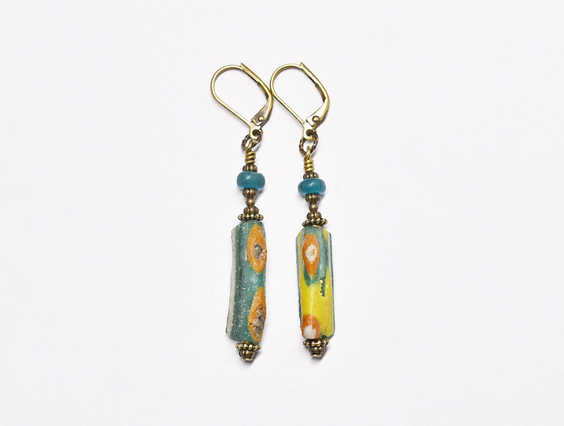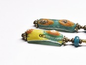 モザイク模様ローマングラスとエメラルドブルービーズのピアス