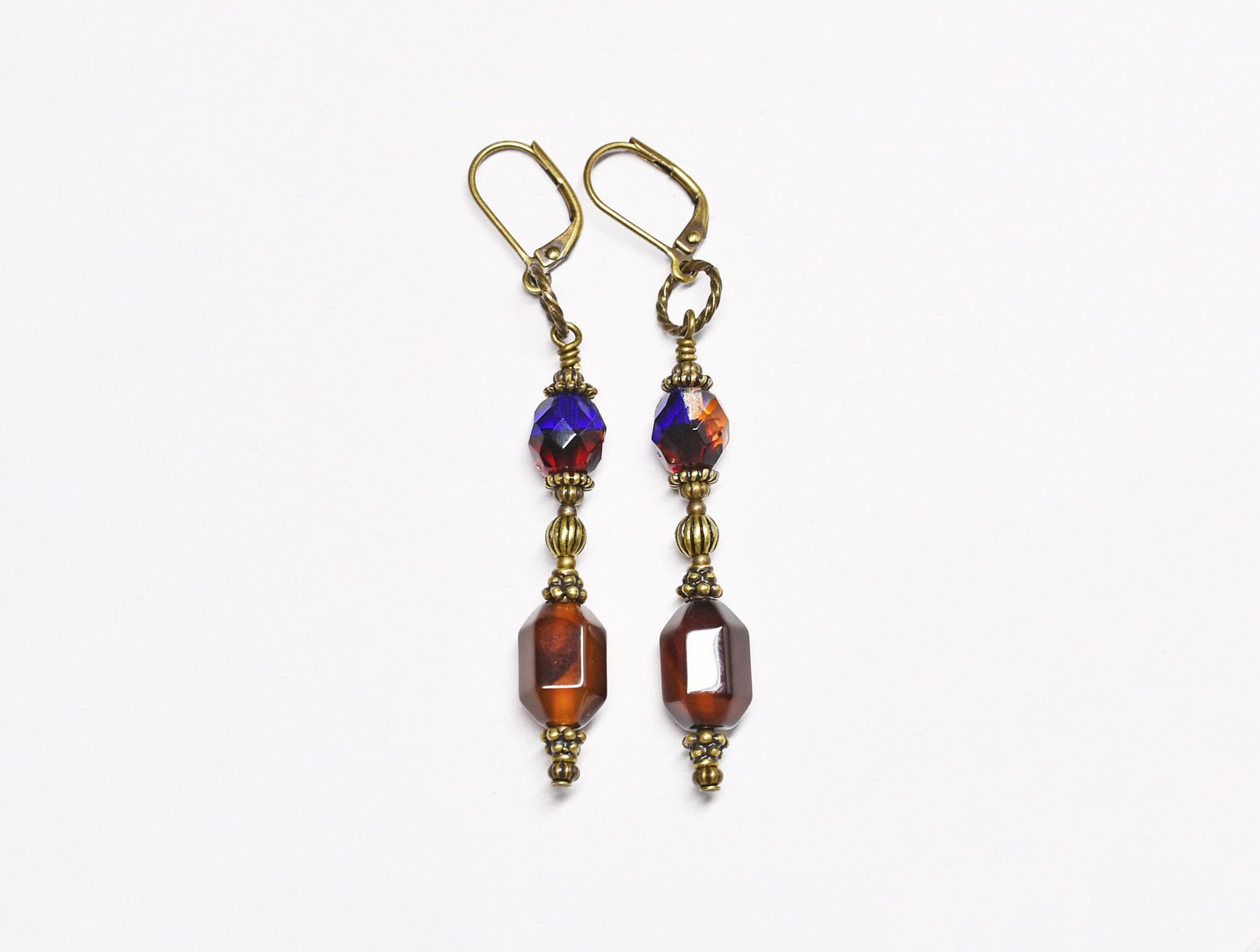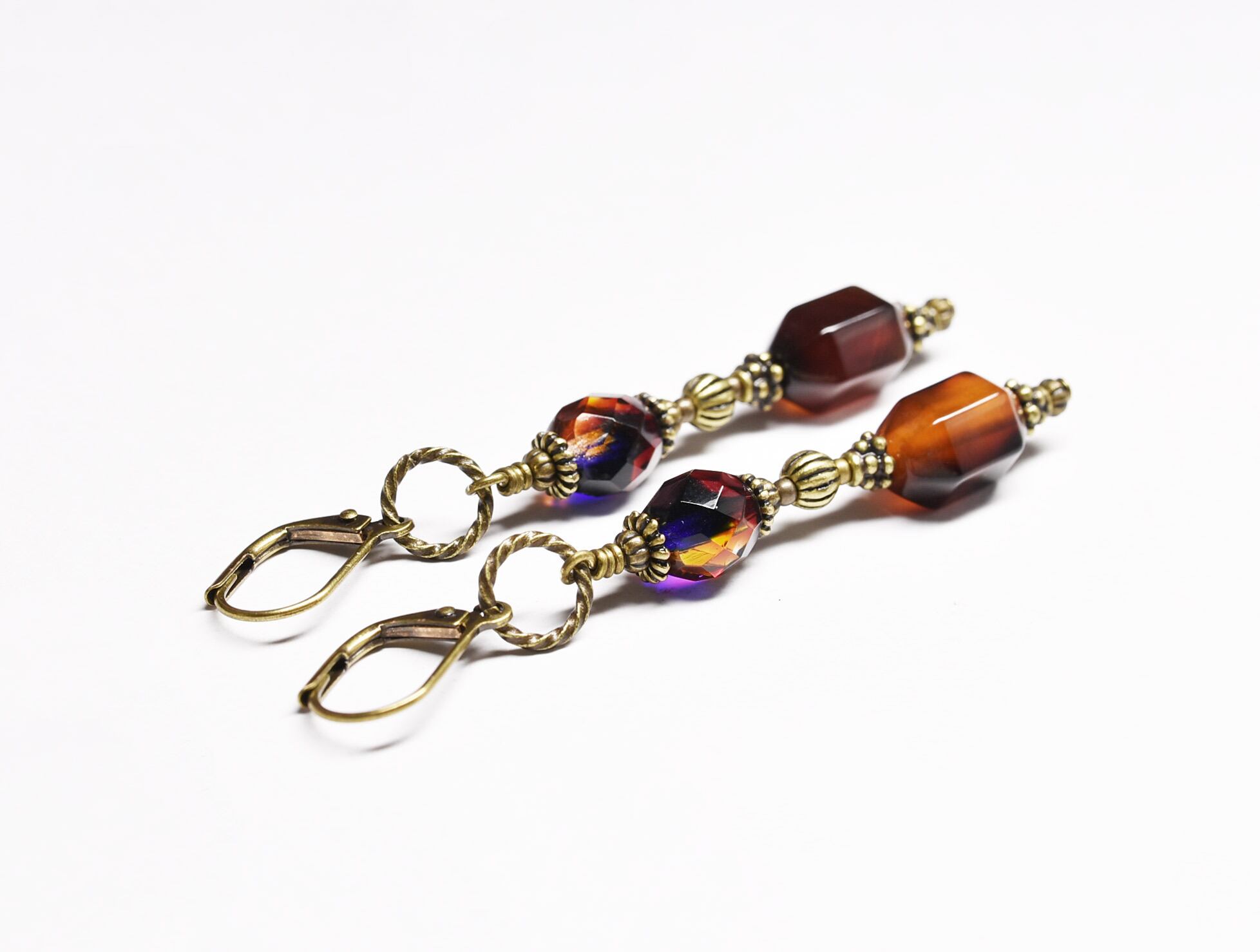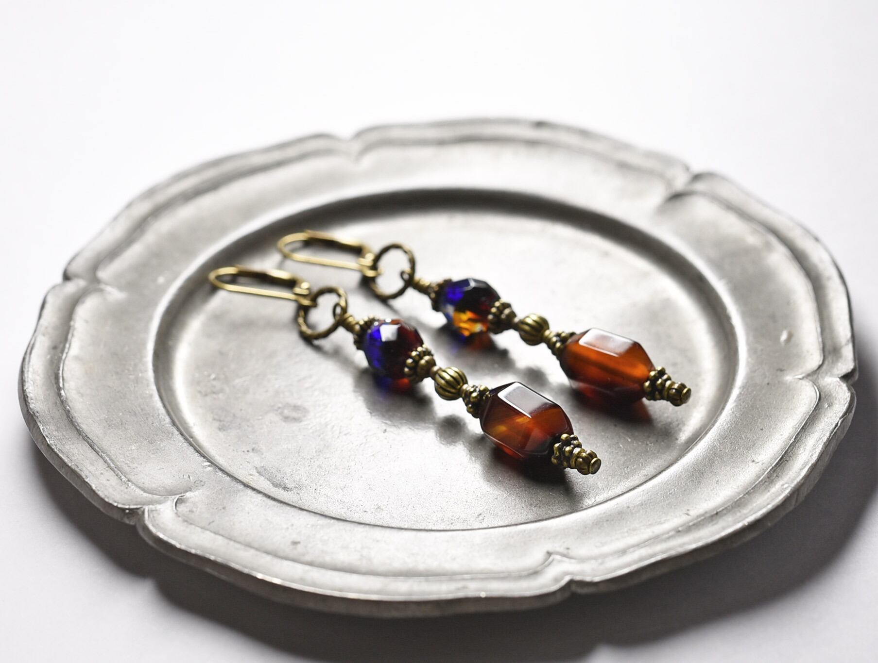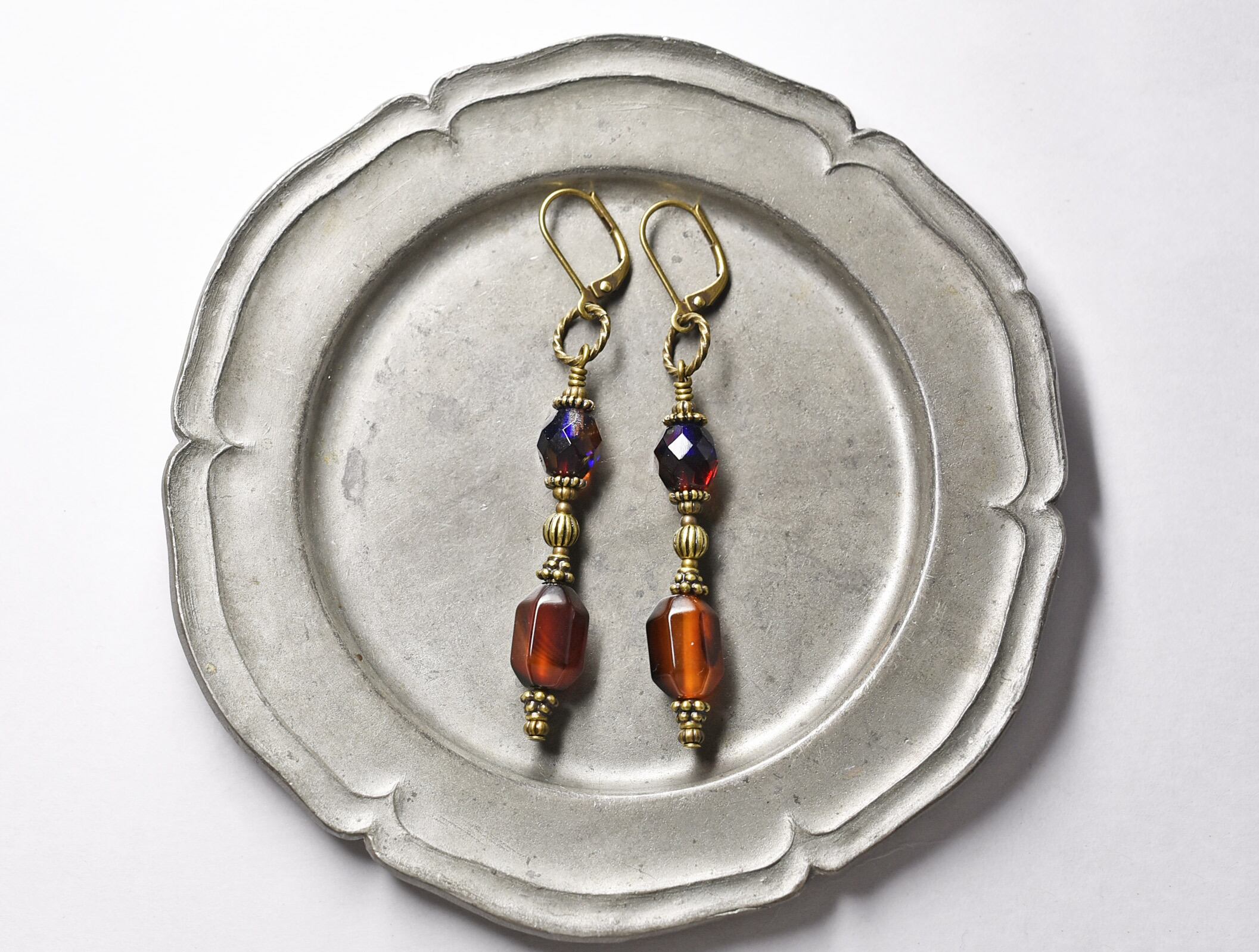 瑪瑙とチェコビーズ、ブラスビーズを繋いだピアスです。