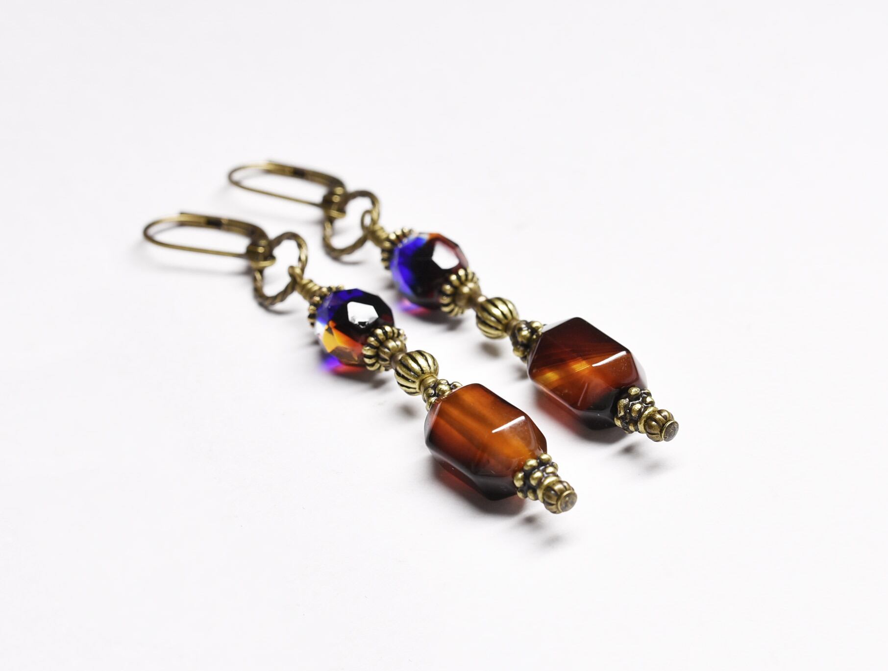ブラウン瑪瑙とチェコビーズ、手毬ブラスのピアス