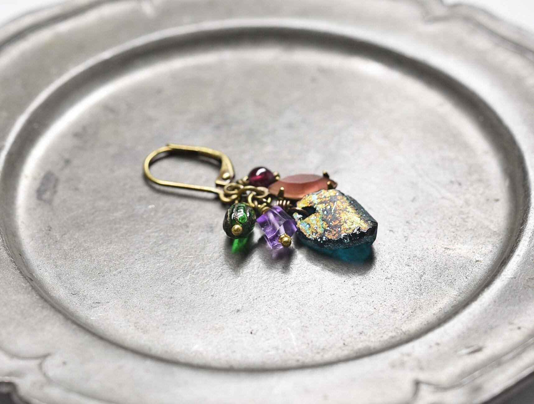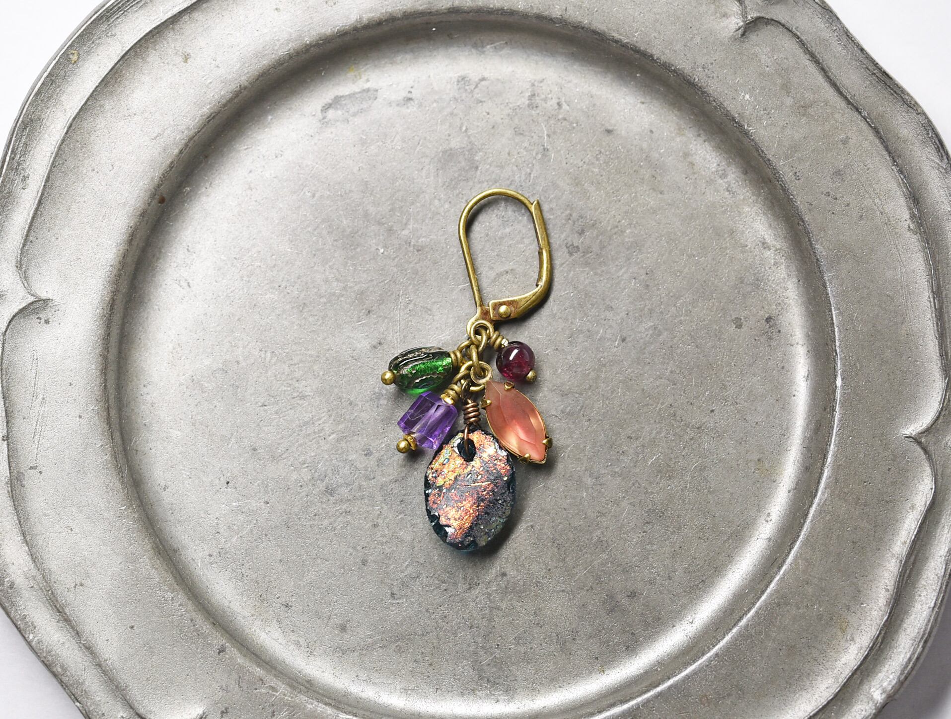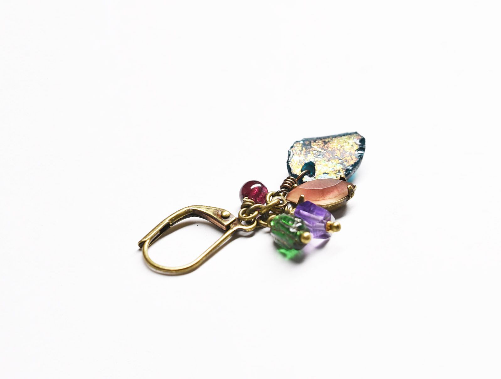 ブルーグリーン銀化ローマングラスと、アンティーク&ヴィンテージビーズ、アメジストとガーネットの片耳ピアス
