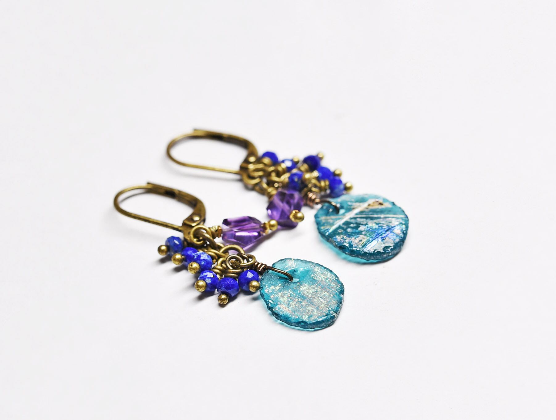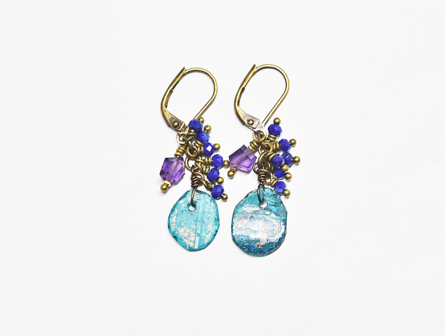 ブルーグリーン銀化ローマングラスとアメジストとたわわなカットラピスのピアス
