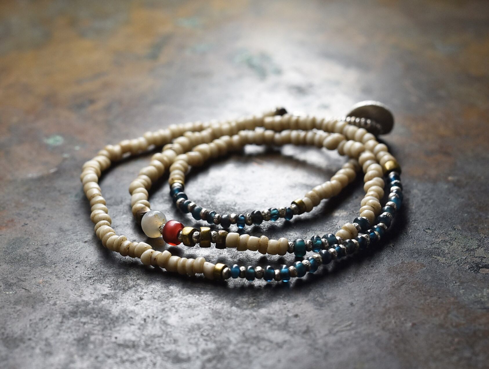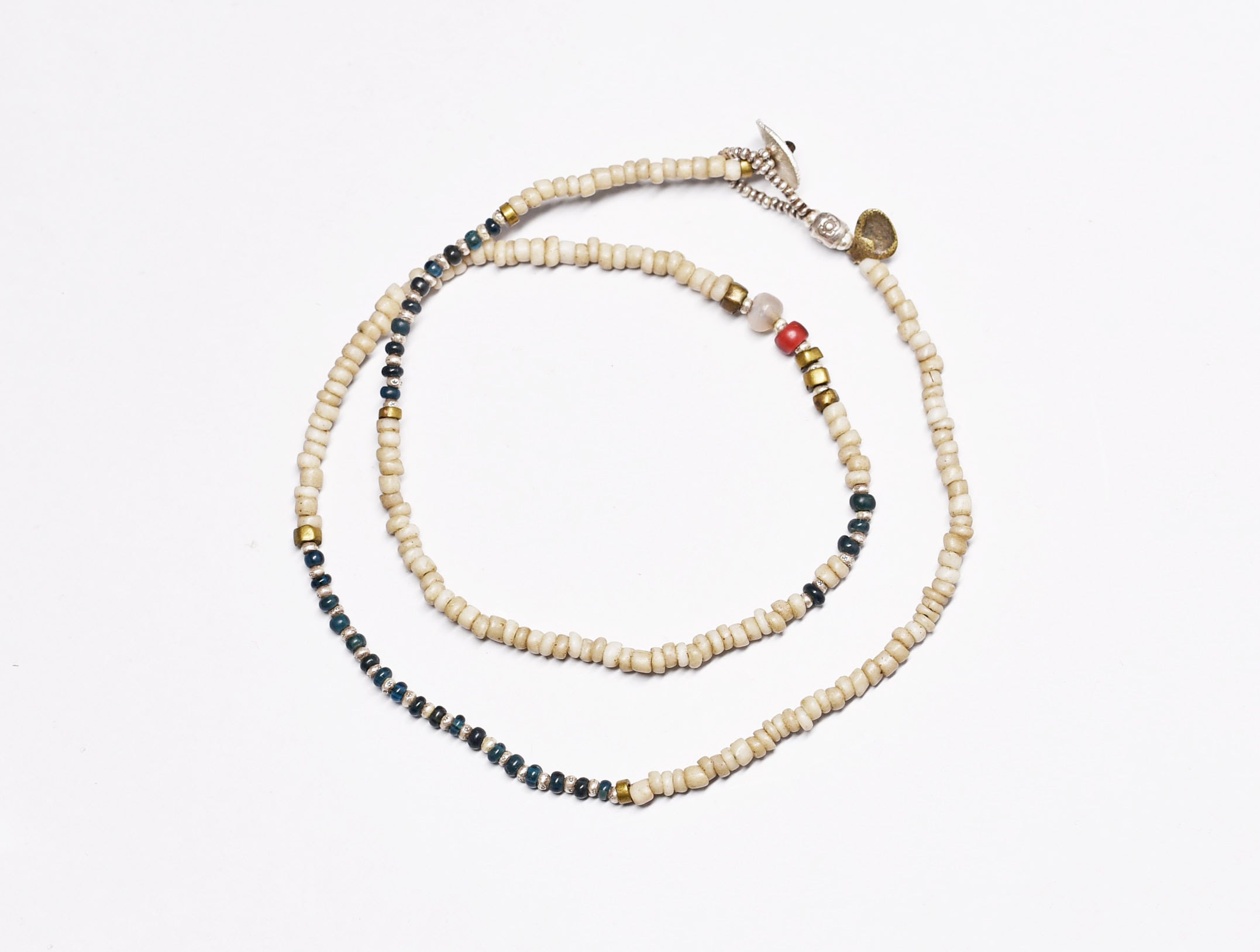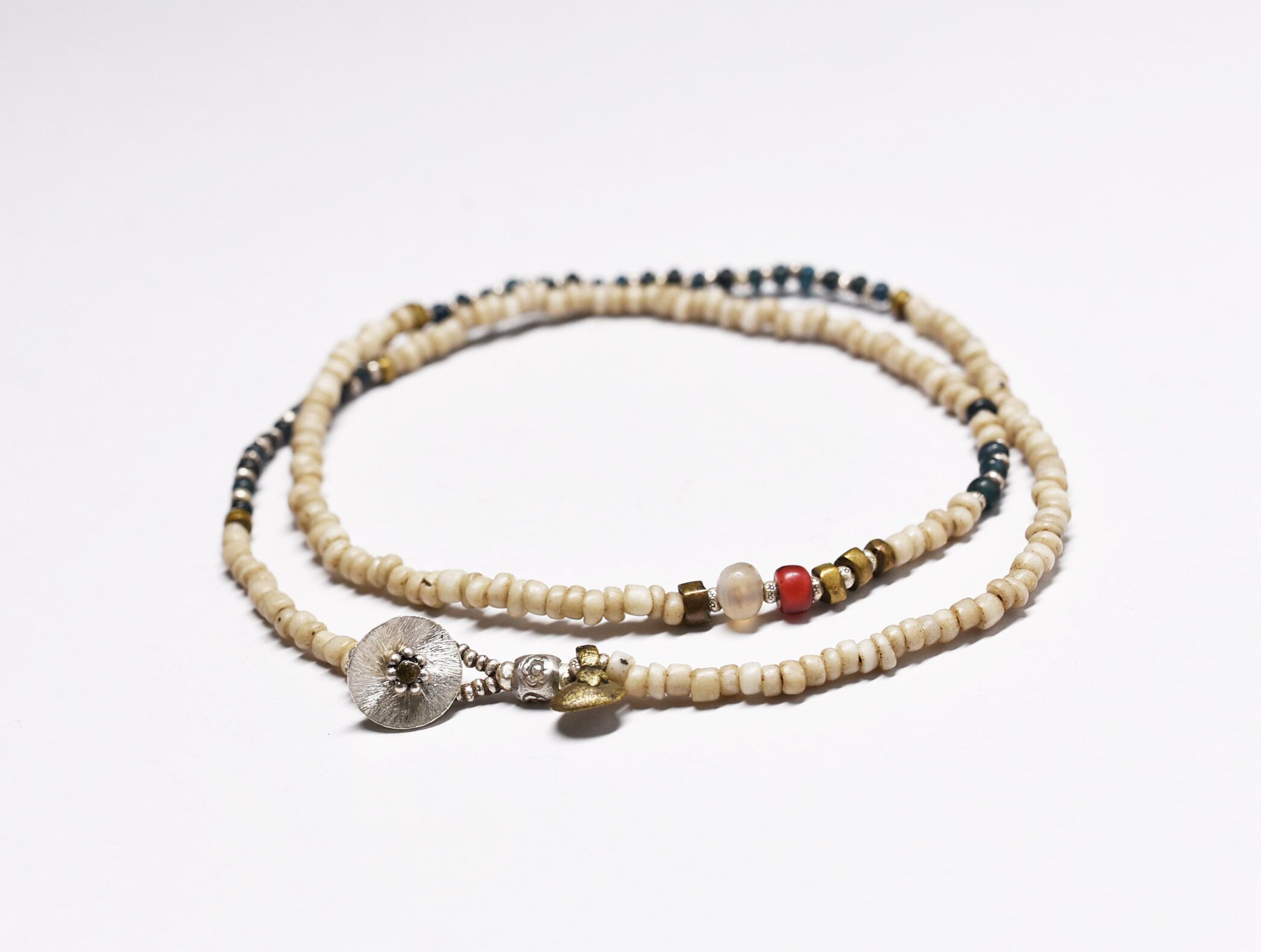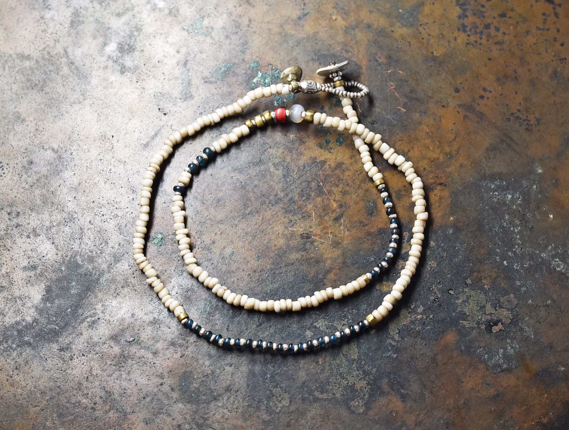 象牙色のビーズはインドまたはベネチアで作られたアンティークビーズです。(19~20世紀)この小さなビーズの一連を何連にも束ねて、ネパールの民族の女性がネックレスとして身に着けていたものです。古色がかっていてメチャメチャ渋い色合いです。