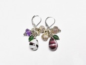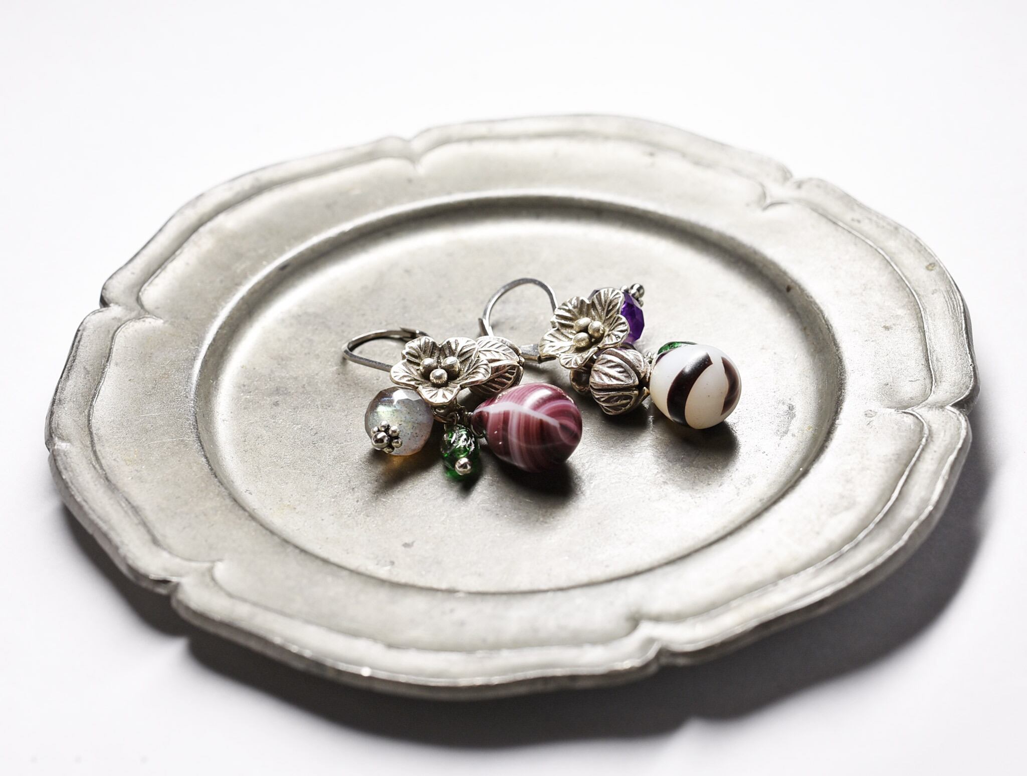 ウエディングビーズと呼ばれるボヘミアのアンティークビーズとカレンシルバーチャーム、ラブラドライト、アメジスト、小さなアンティークビーズを繋いだカラーアンシメトリーなピアスです。
