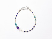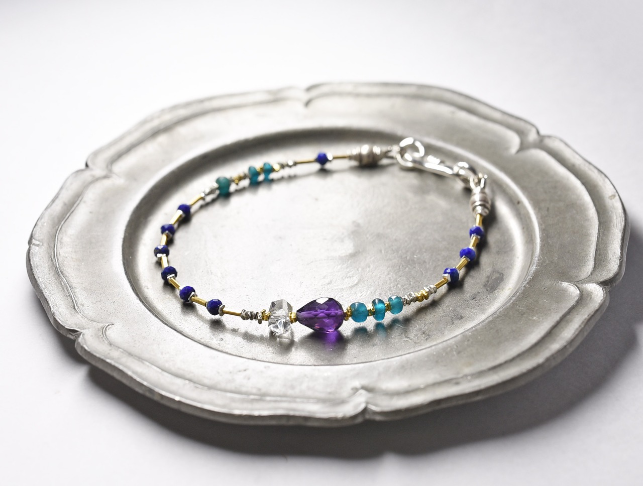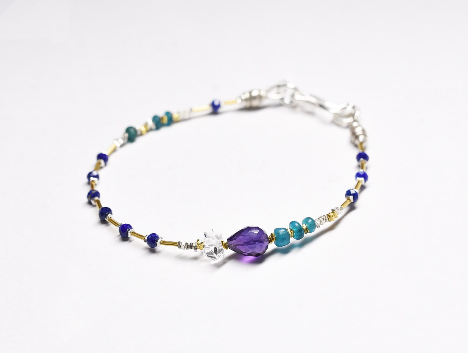 雫アメジストとハーキマーダイヤモンド、ラピス、エメラルドブルービーズ、カレンシルバービーズの華奢なブレス