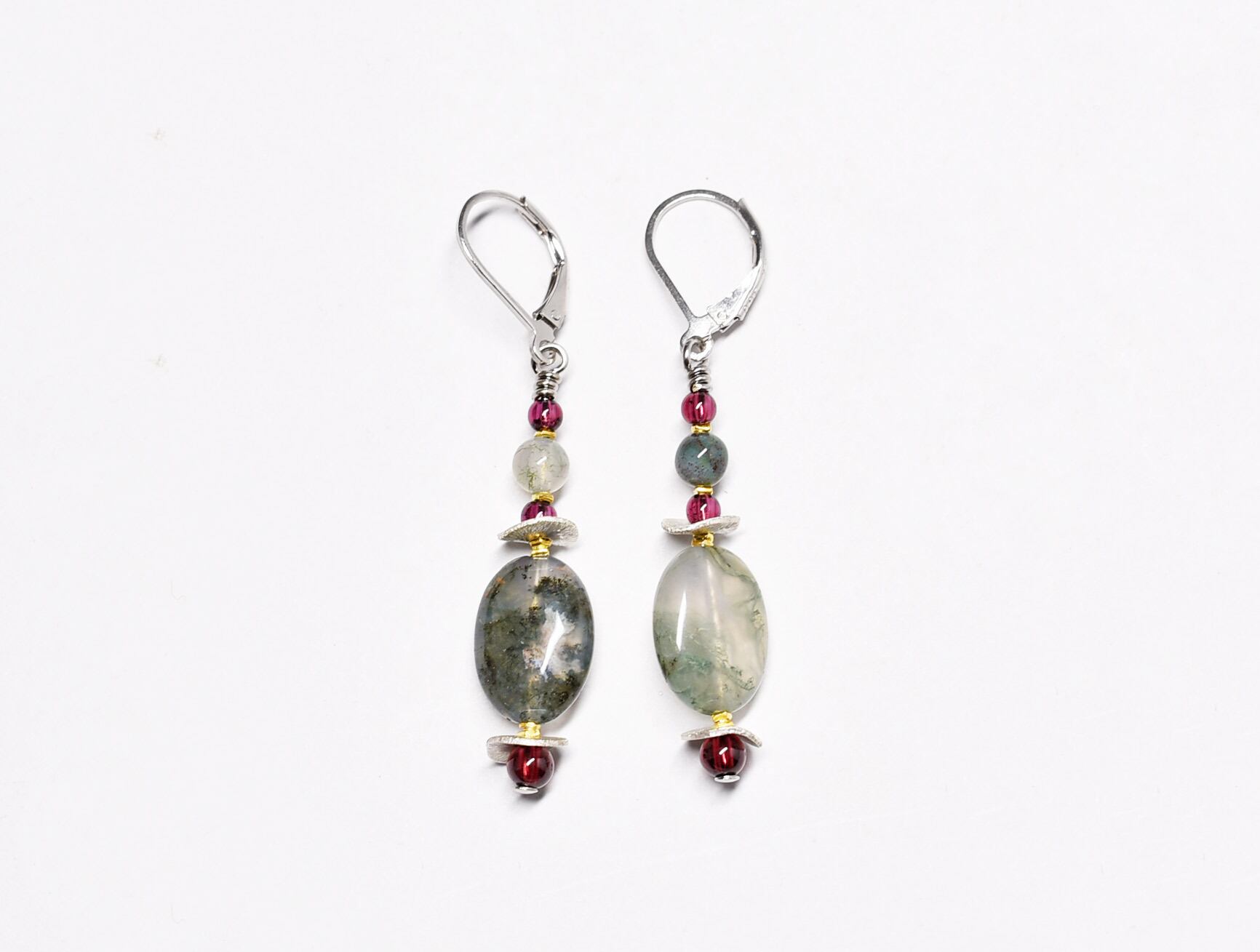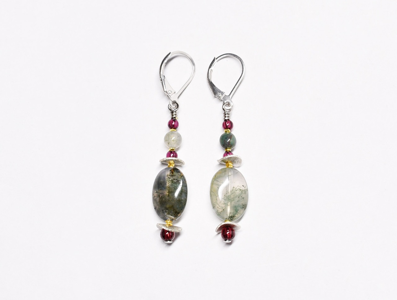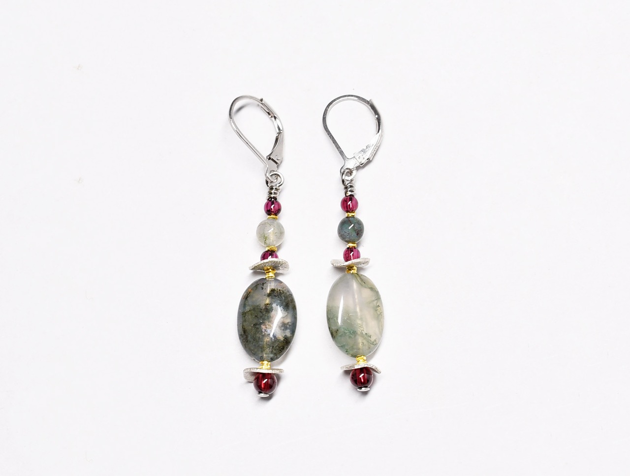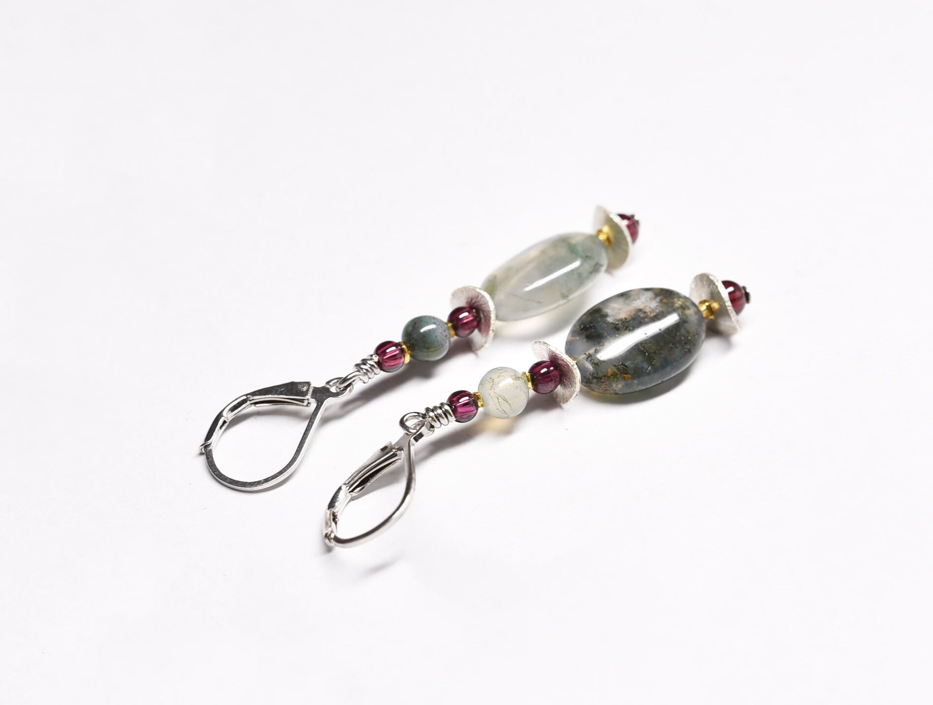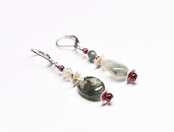 インディアンアゲート、ガーネット、カレンシルバーを繋いだカラーアンシメトリーのピアスです。