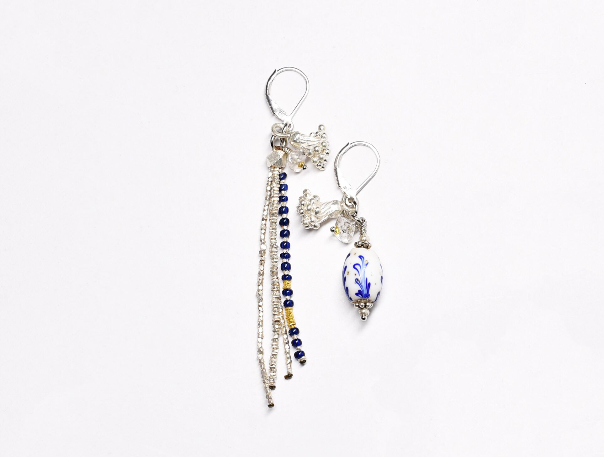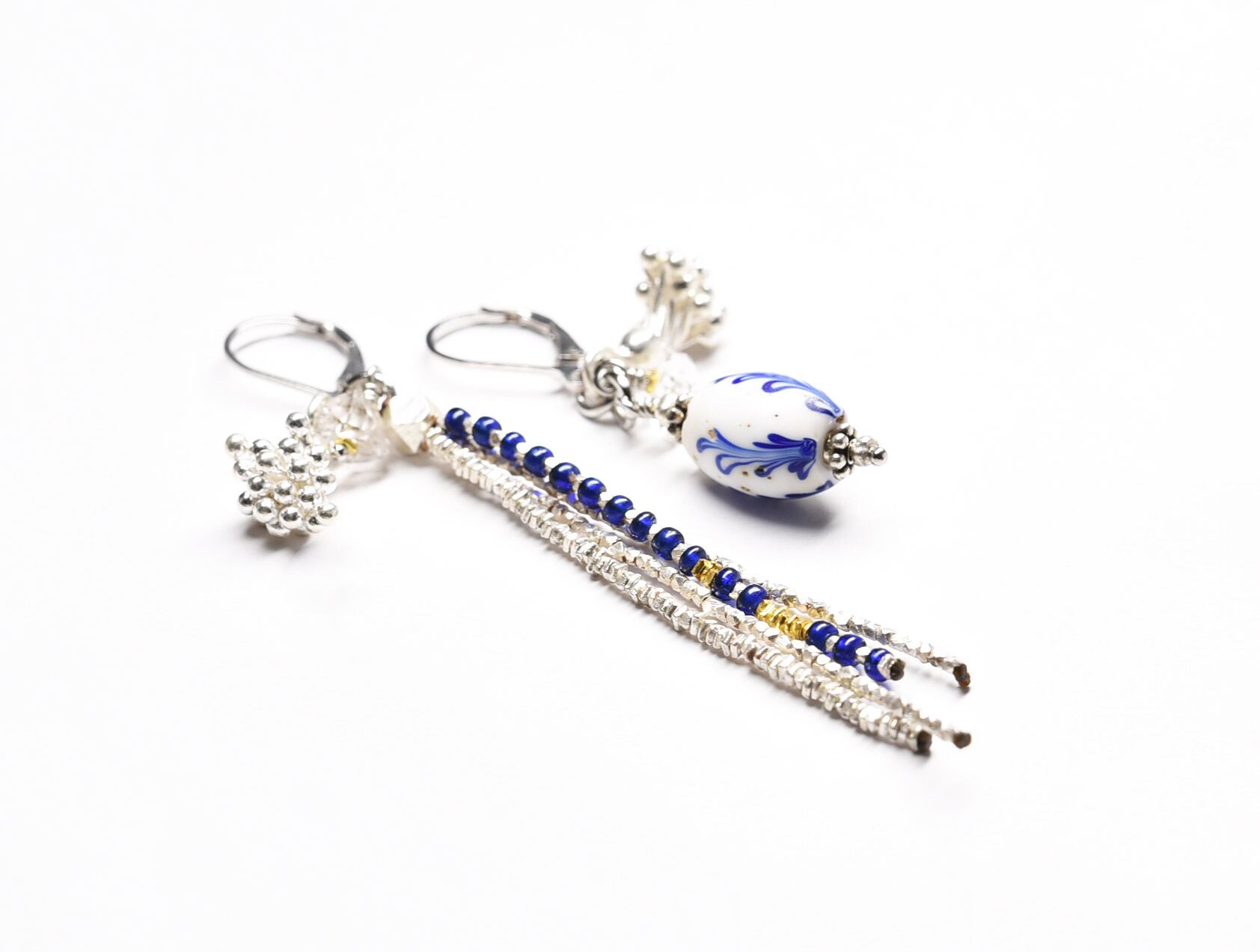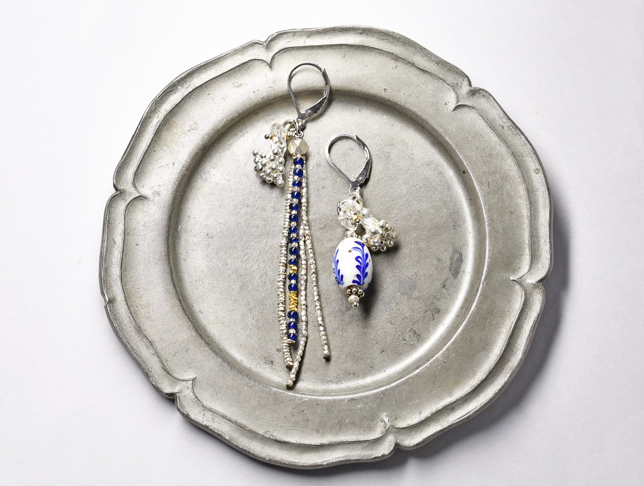 ダッチデルフトとカレンシルバーのアンティークビーズのアンシメトリーピアス