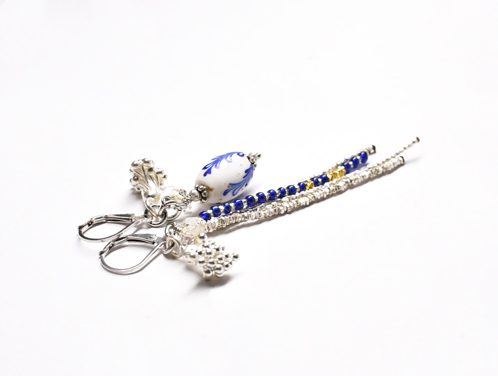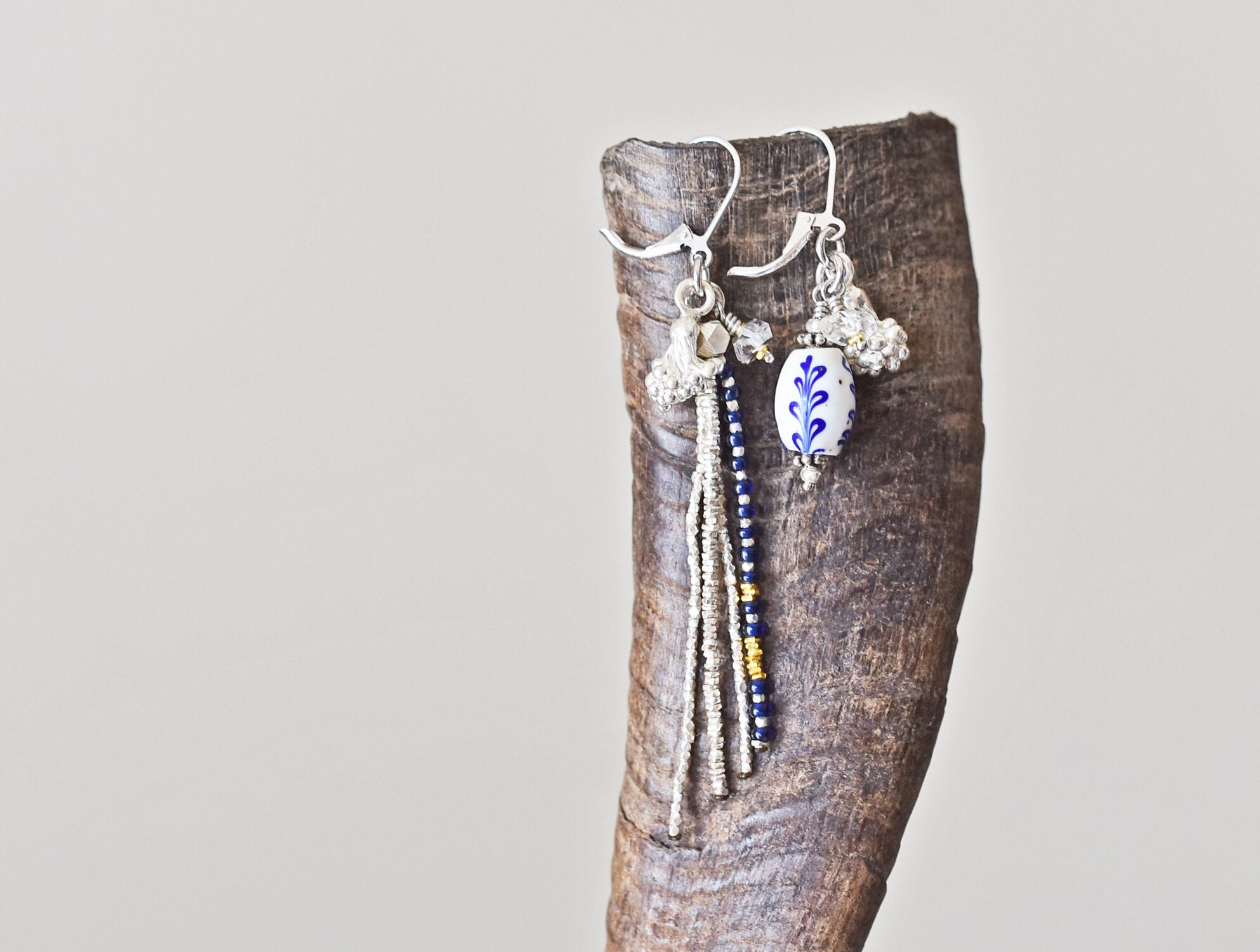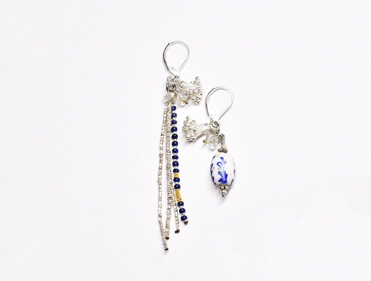 ダッチデルフトとカレンシルバーのアンティークビーズのアンシメトリーピアス