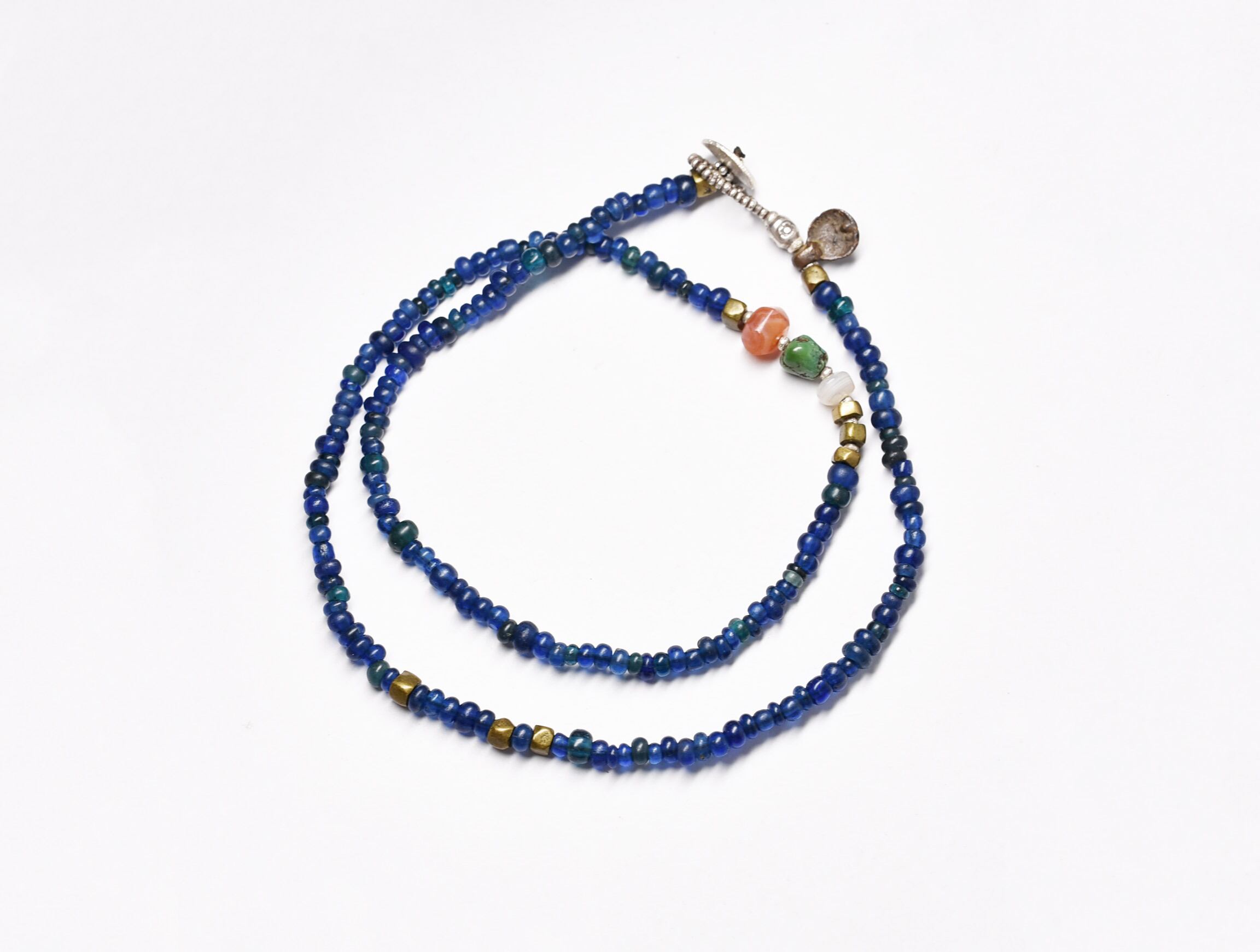 素材:ガラス、oldチベタンターコイズ、oldカーネリアン、古代瑪瑙、カレンシルバー、真鍮、ロウビキ紐