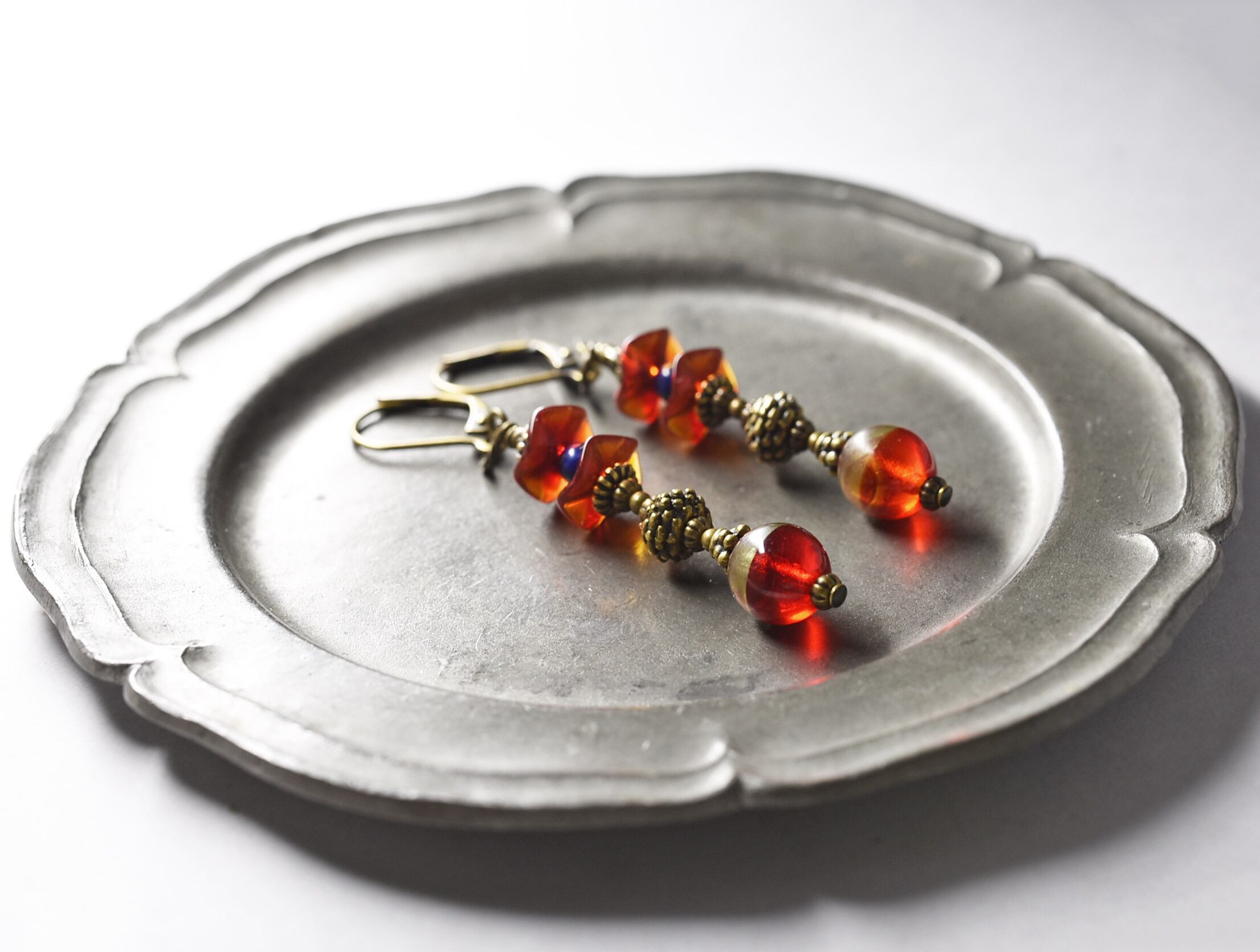 日本のヴィンテージビーズとチェコビーズ、ブラスビーズ、ラピスを繋げたピアスです。