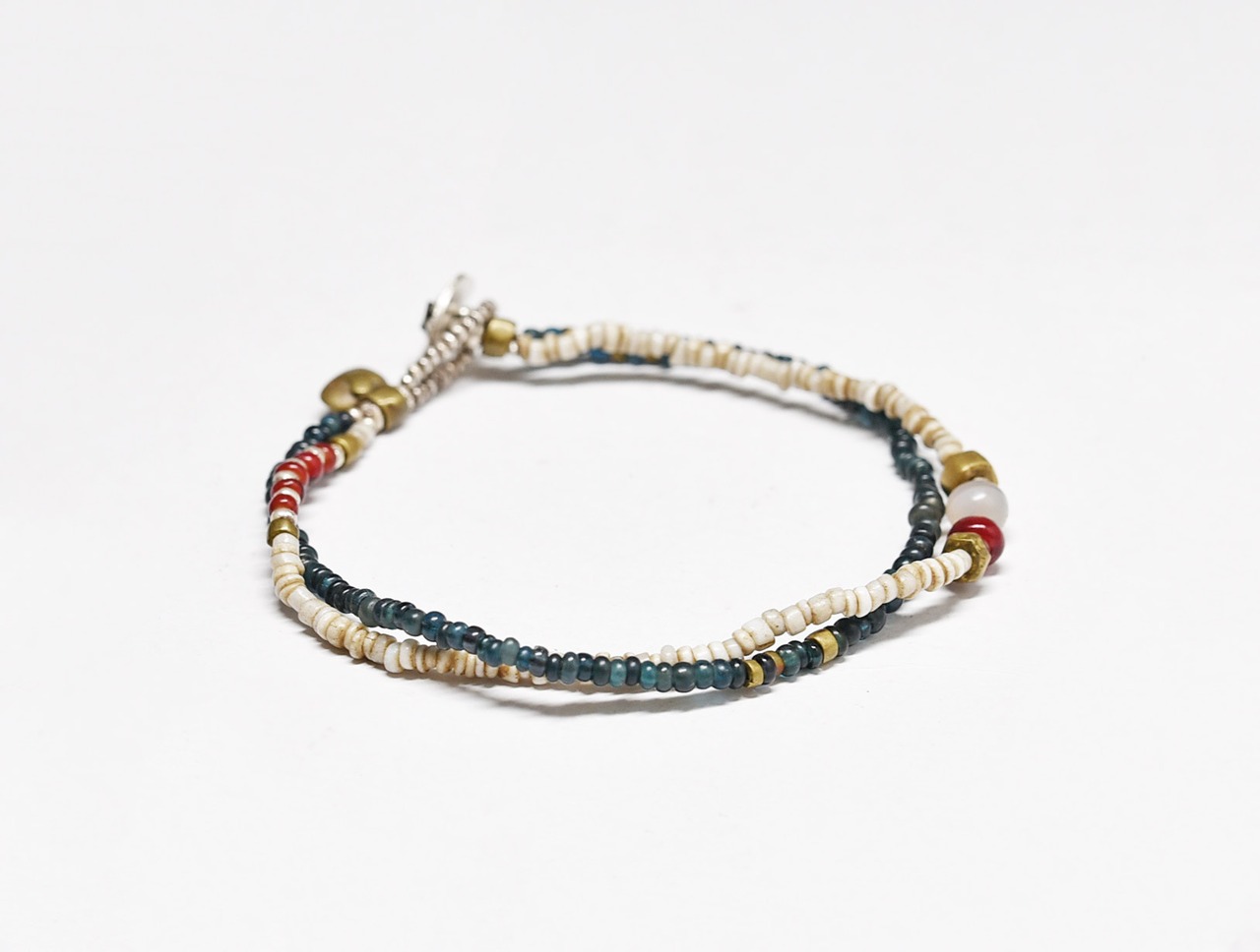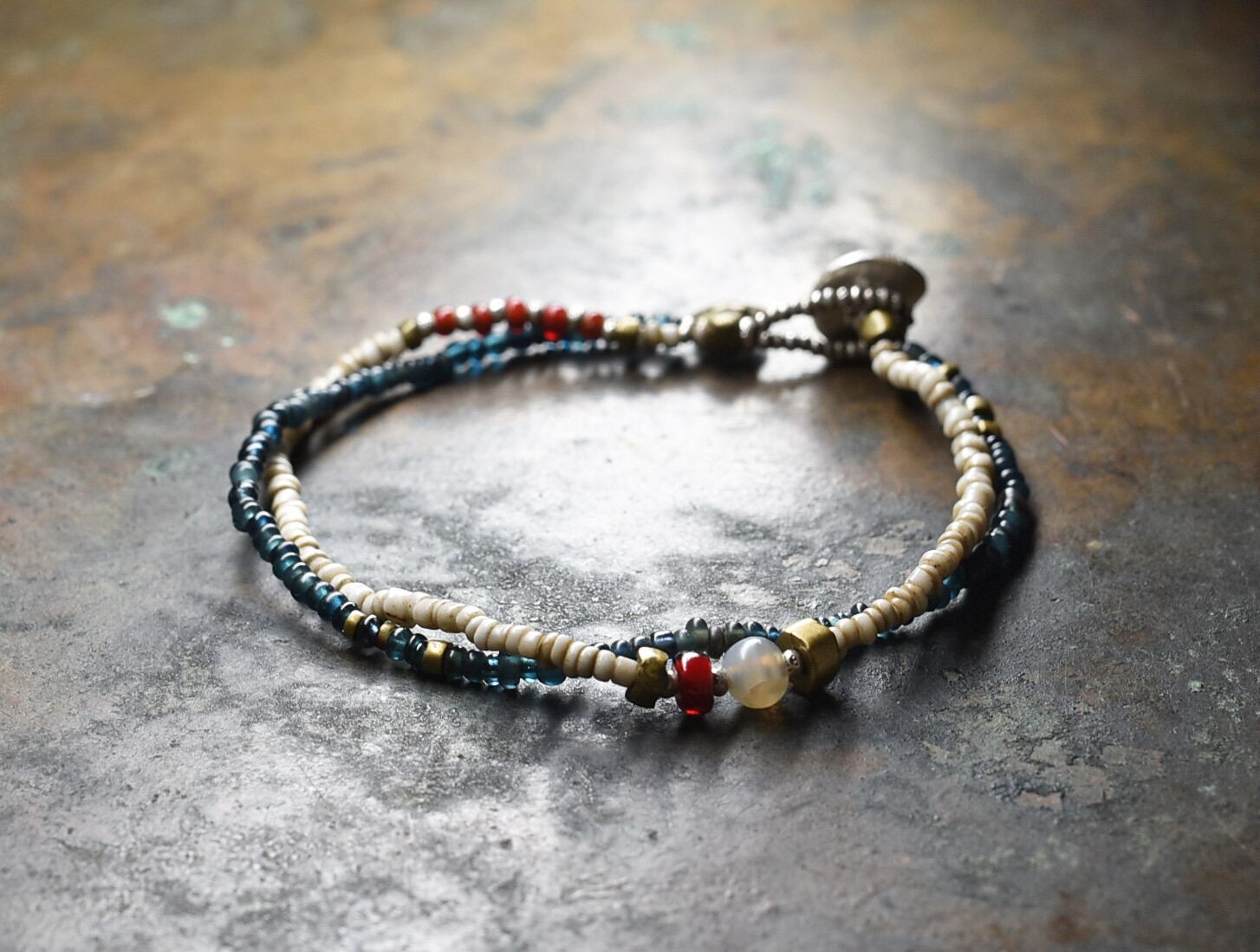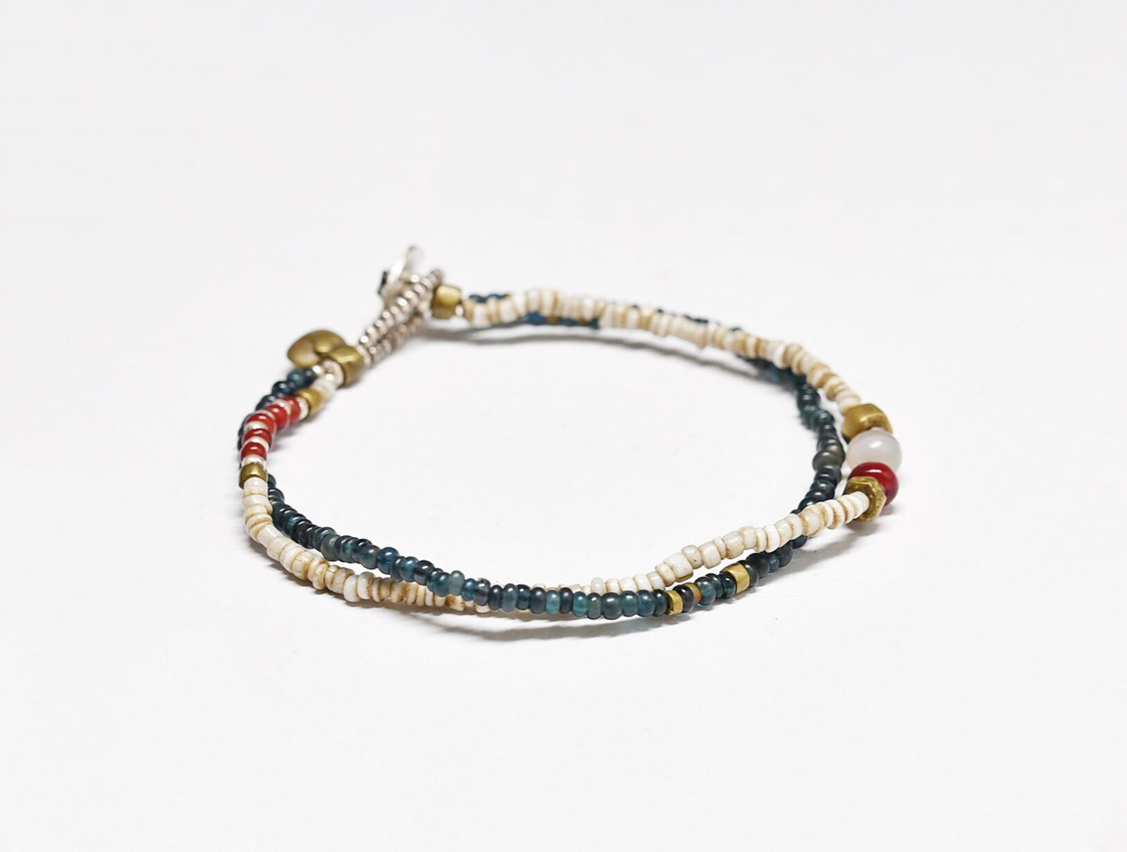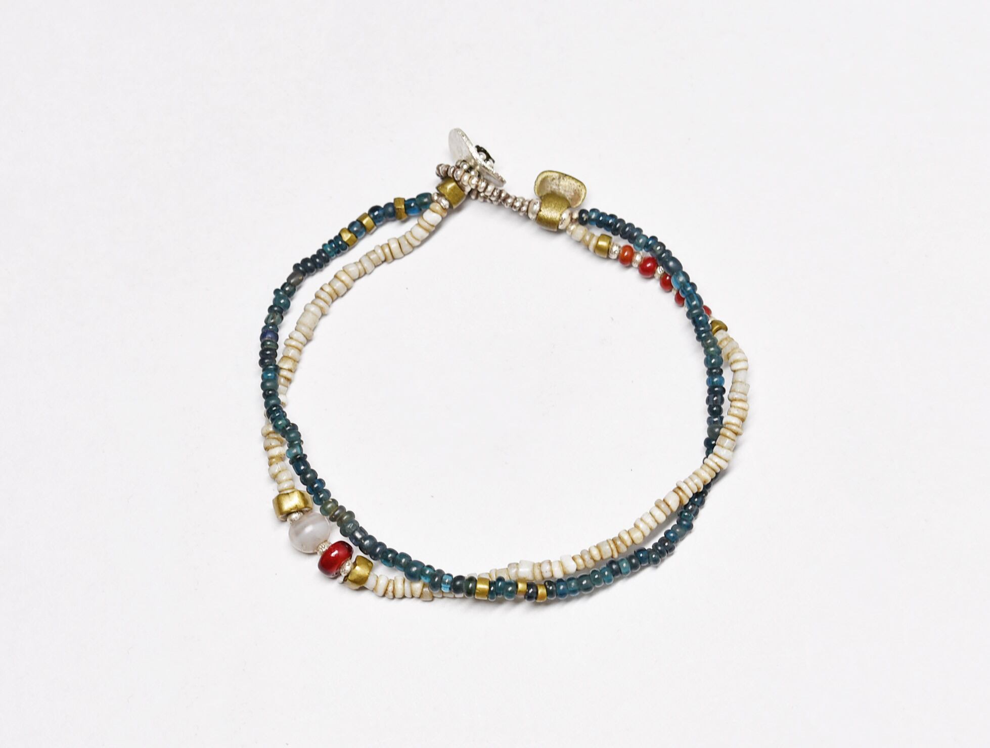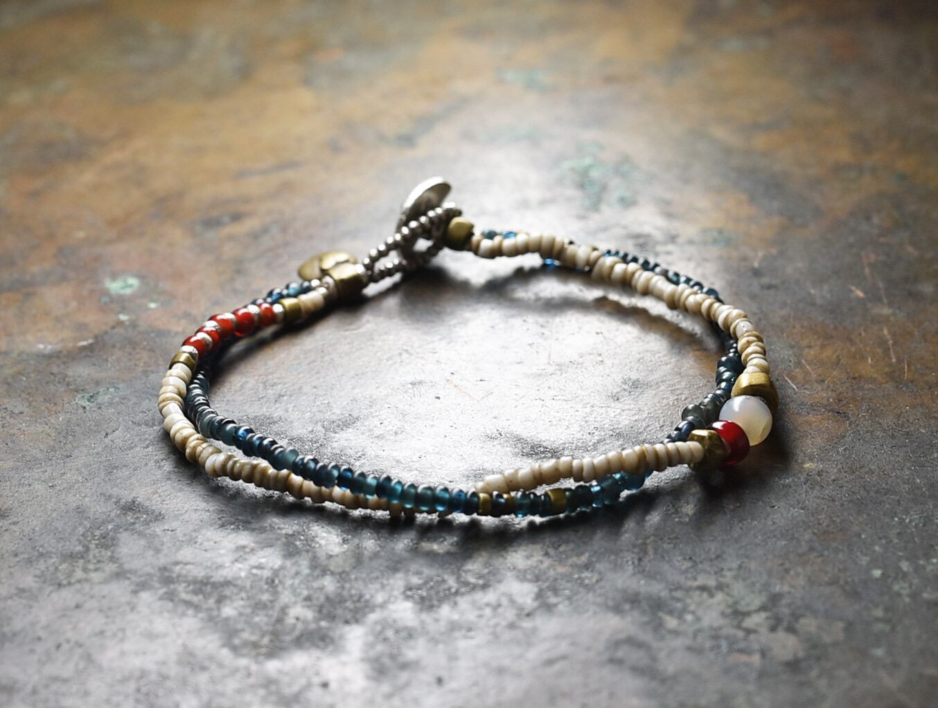 古代瑪瑙を濃い赤色のホワイトハーツ、ホワイトとインディゴブルーのアンティークビーズ、oldオリッサブラスなどを2連に繋いだブレスです。