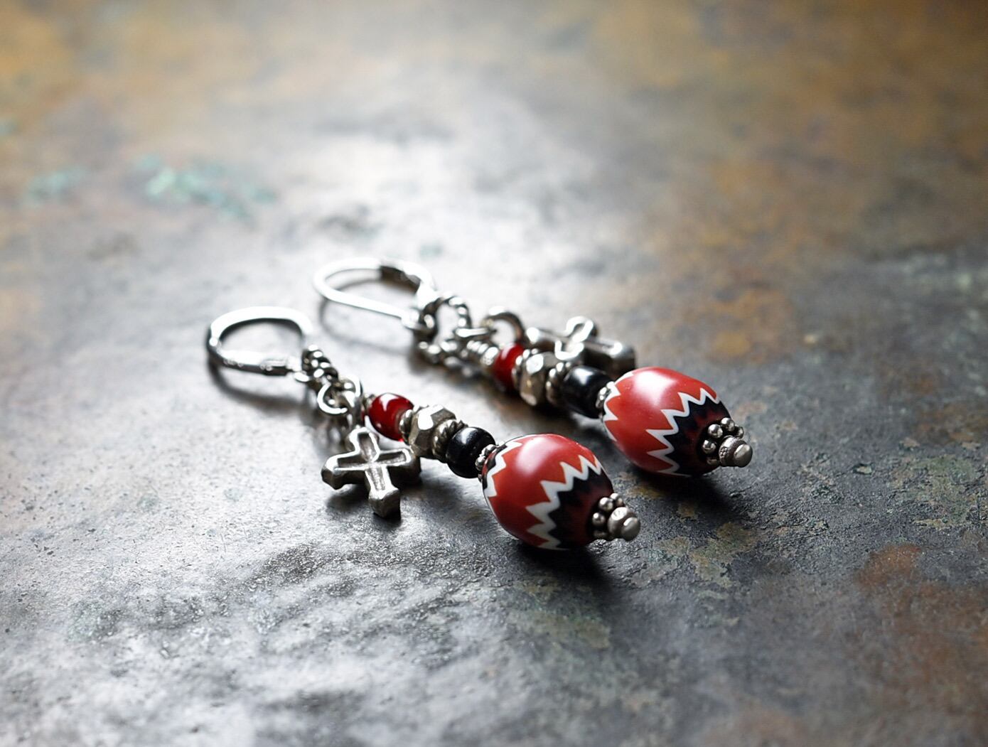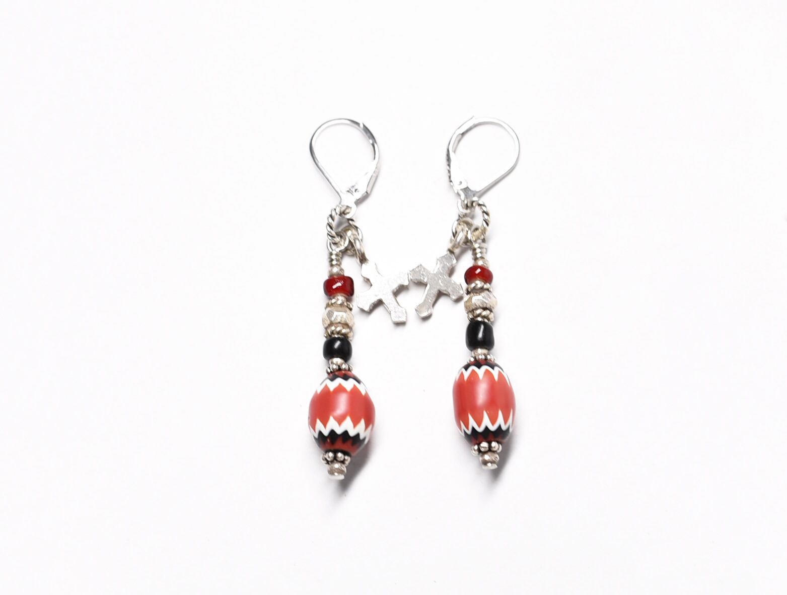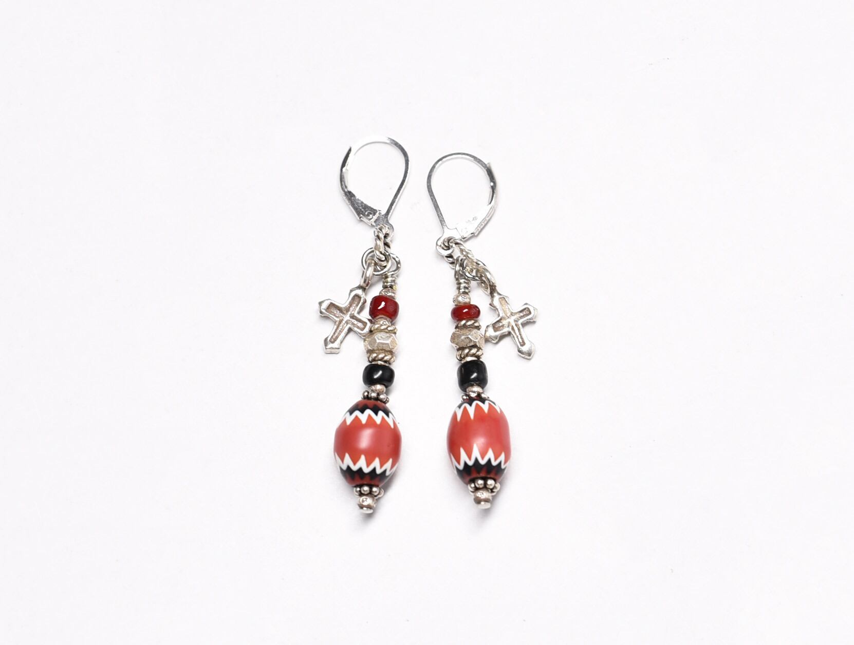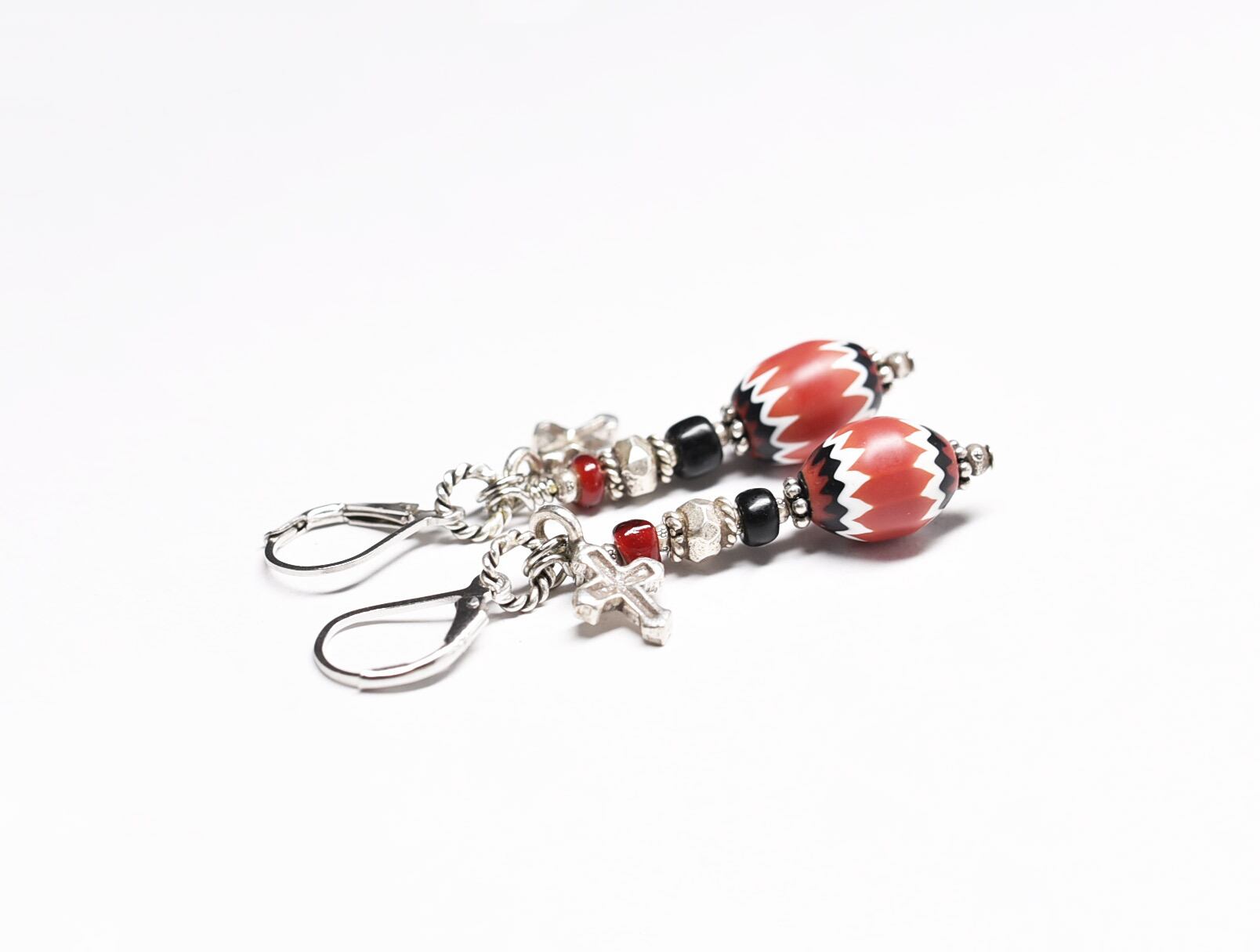 レッドシェブロンビーズとクロスカレンシルバーのピアス