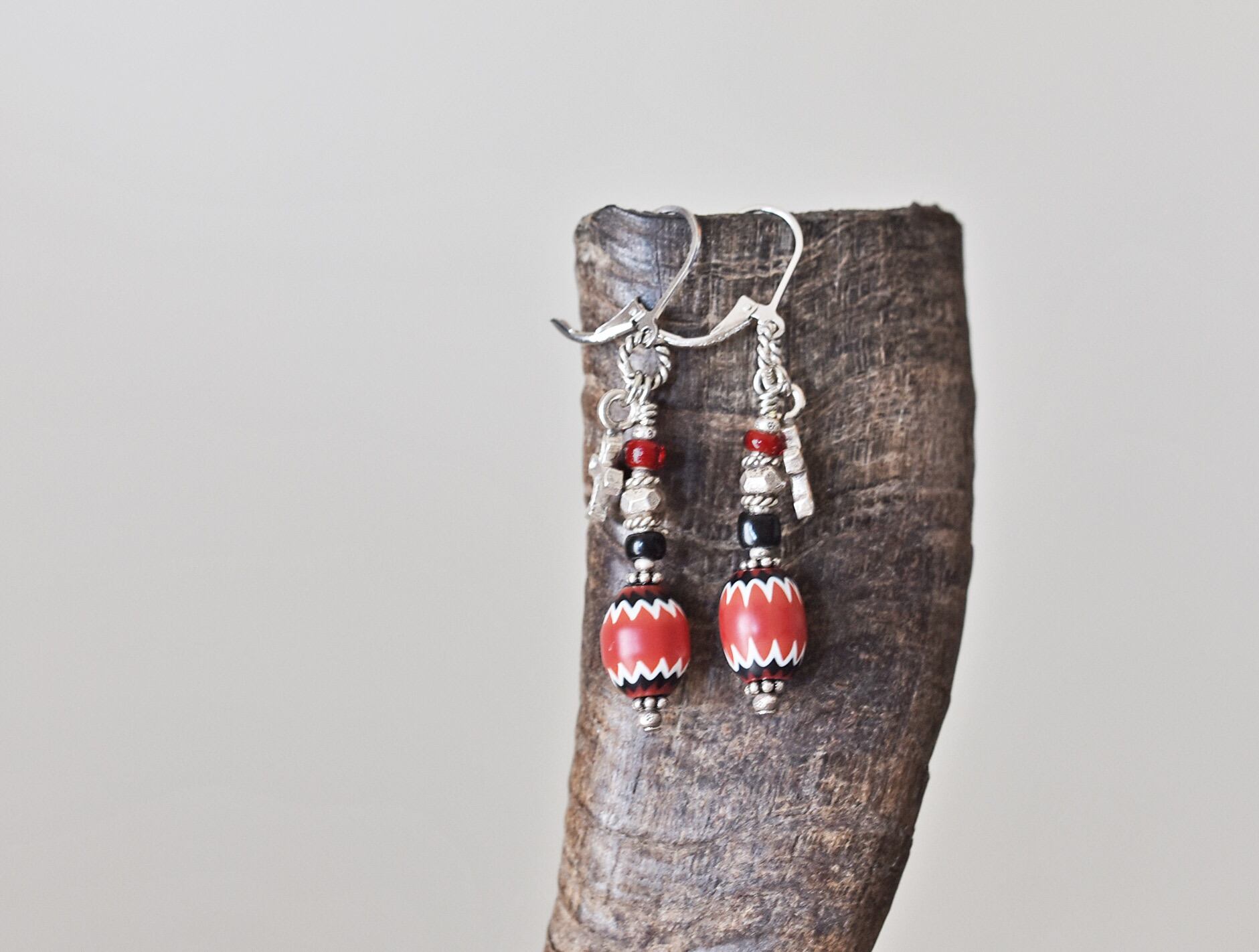 レッドシェブロン、ベネチアのアンティークビーズ、カレンシルバーを繋いだピアスです。