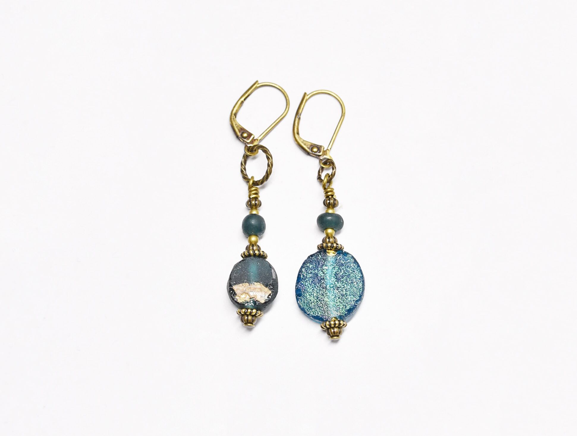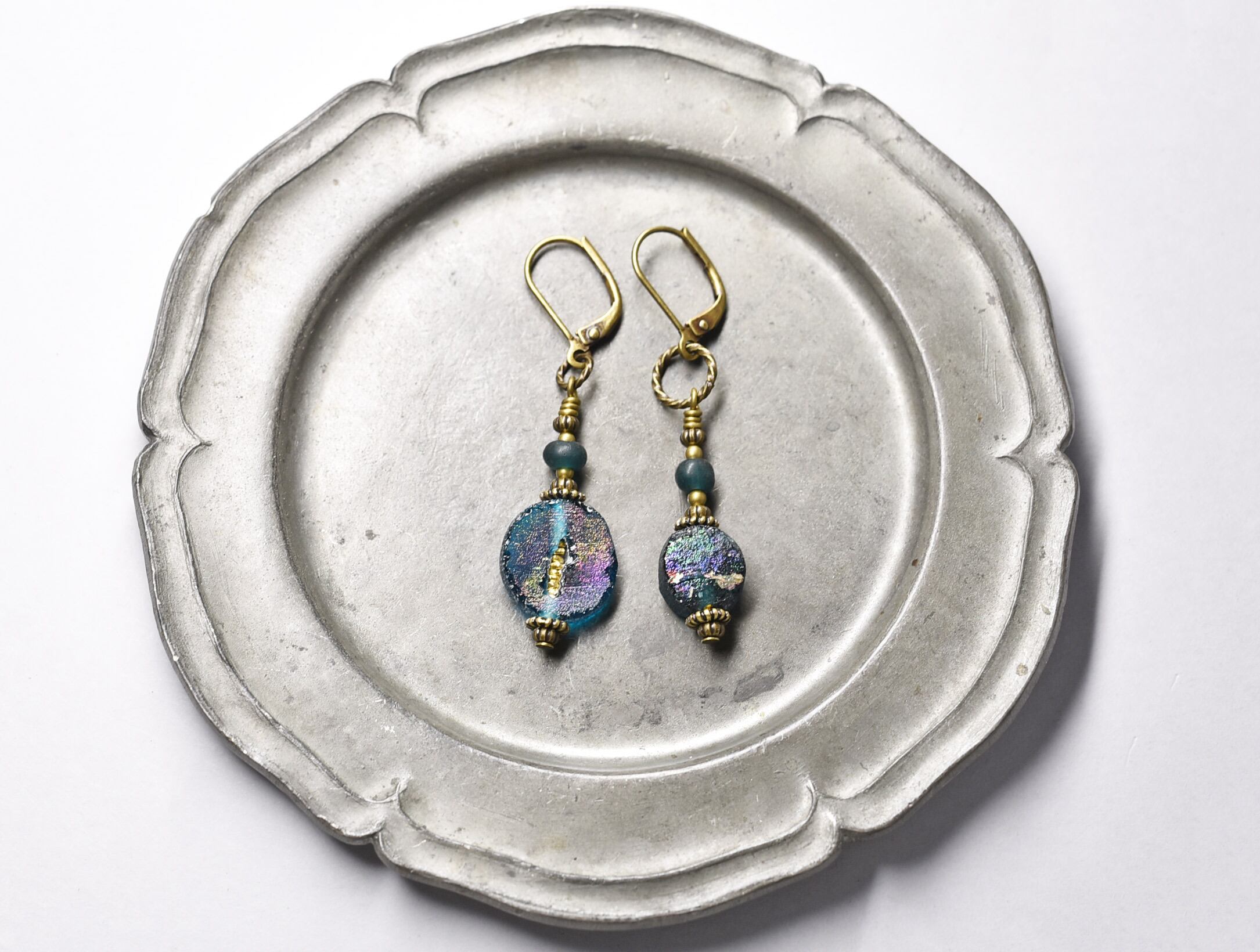 銀化したローマングラスと、灰青緑色のアンティークビーズを繋いだアンシメトリーなピアスです。
