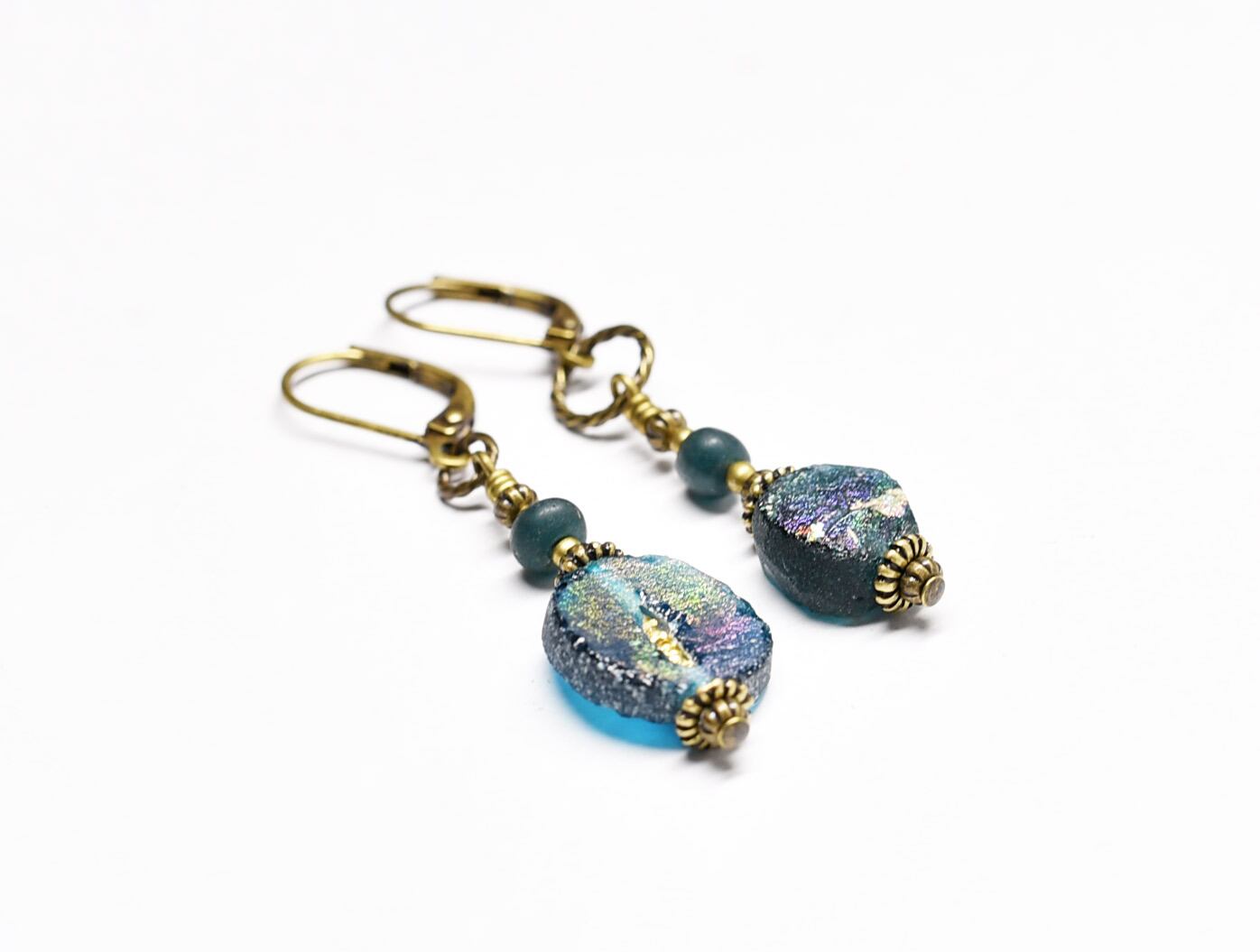 銀化ローマングラスと灰青緑色アンティークビーズのアンシメトリーピアス