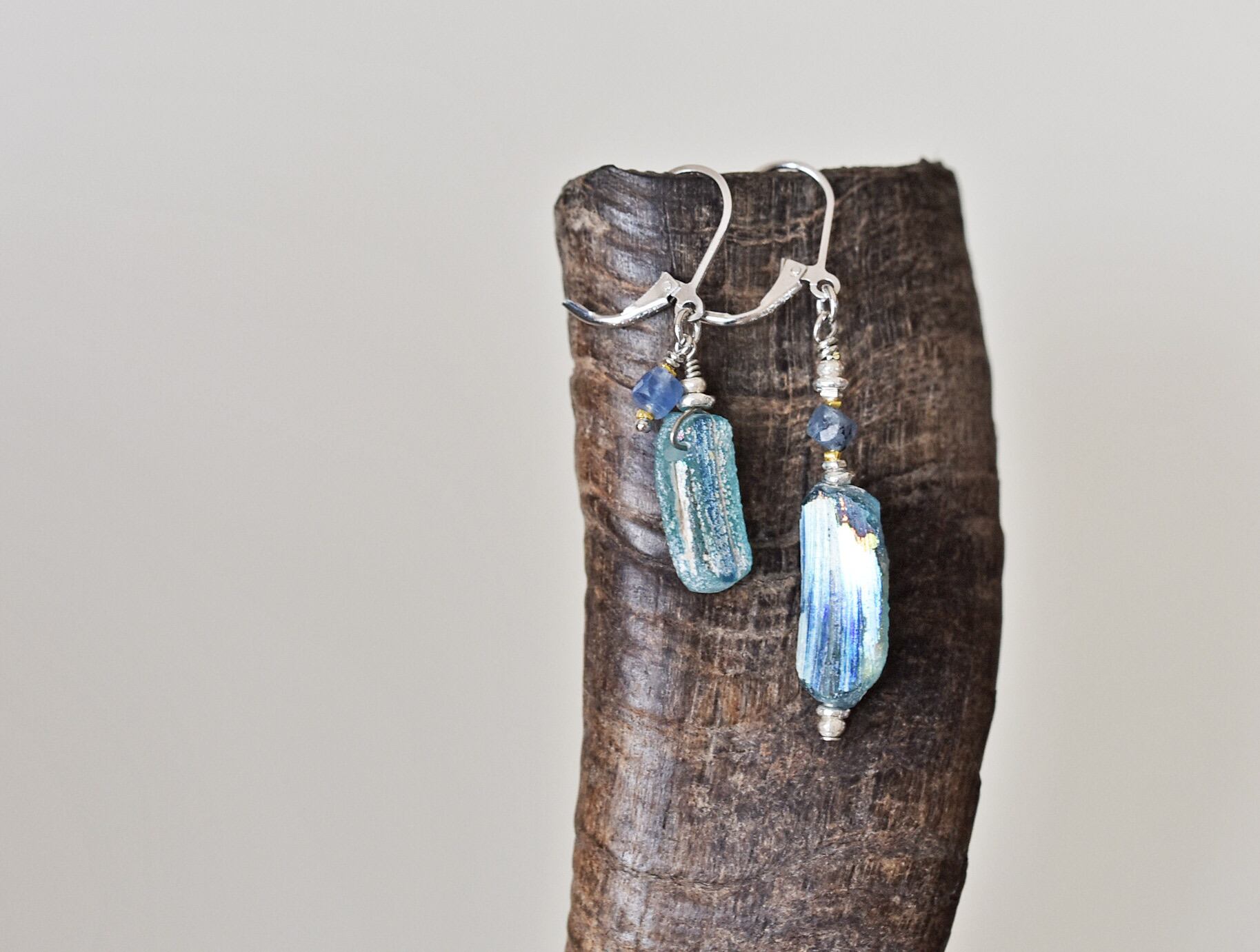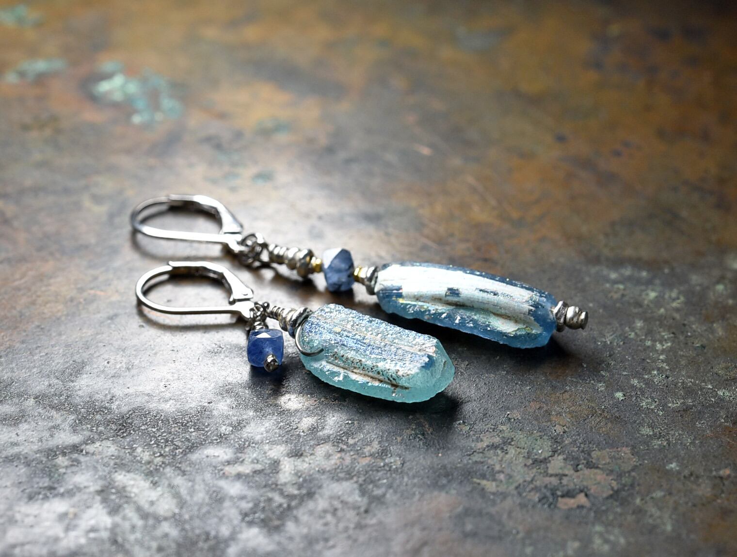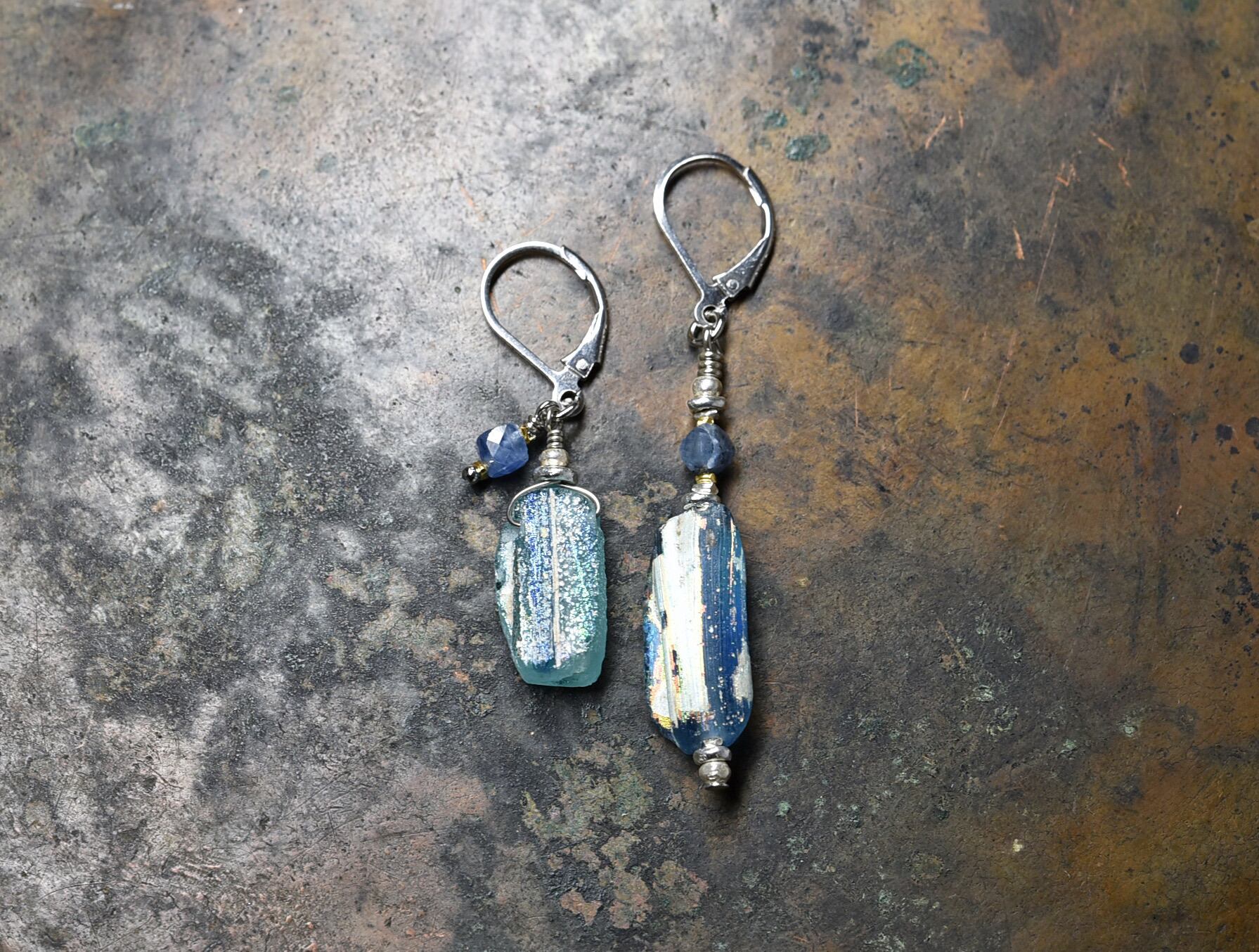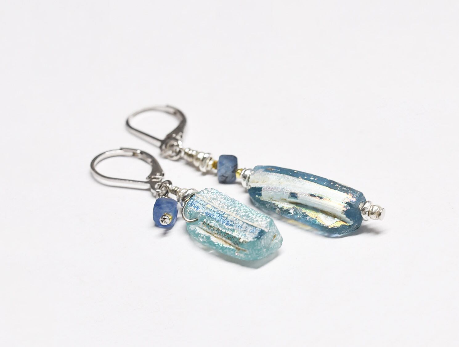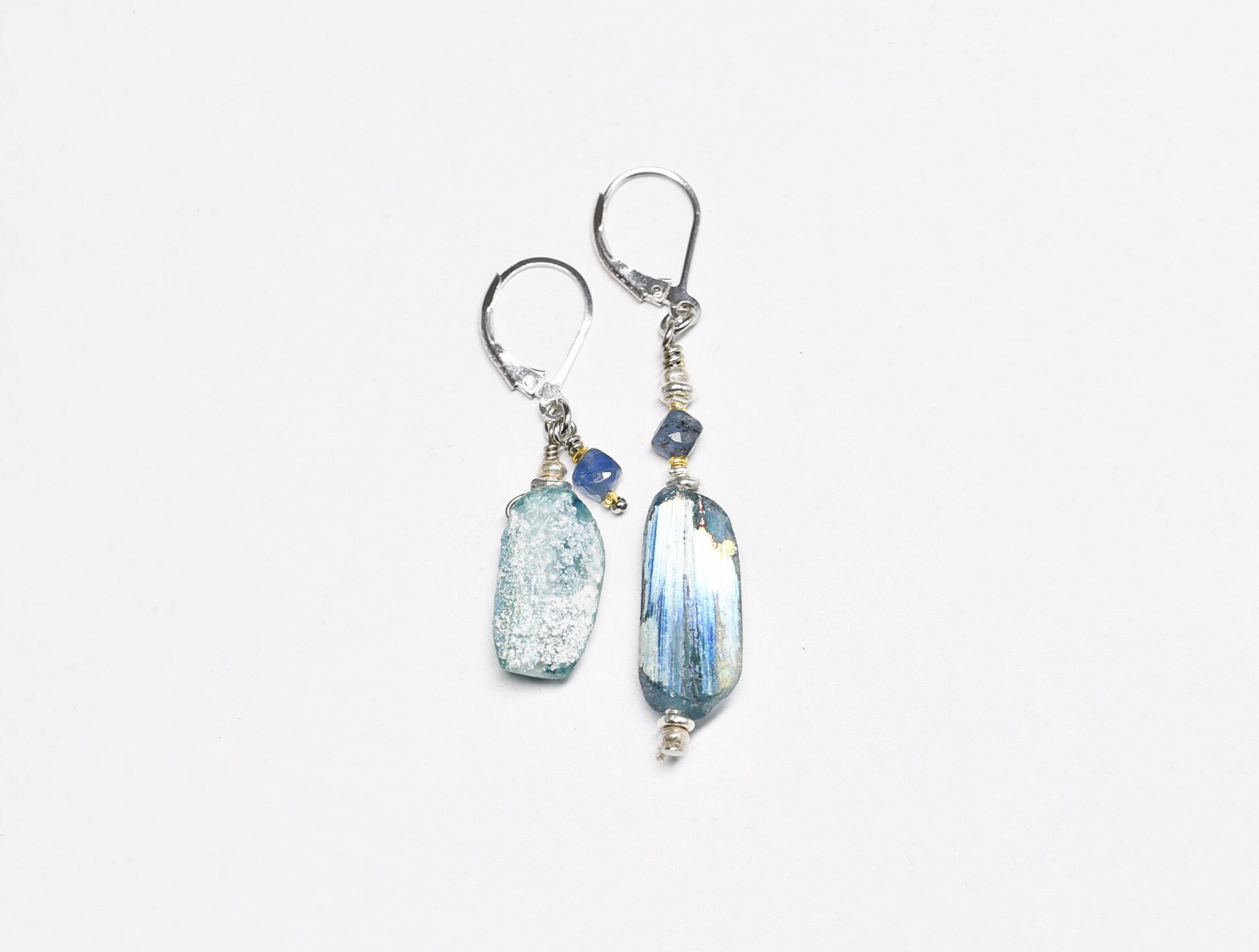 銀化したローマングラス、カレンシルバー、カイヤナイトを繋いだアンシメトリーなピアスです。