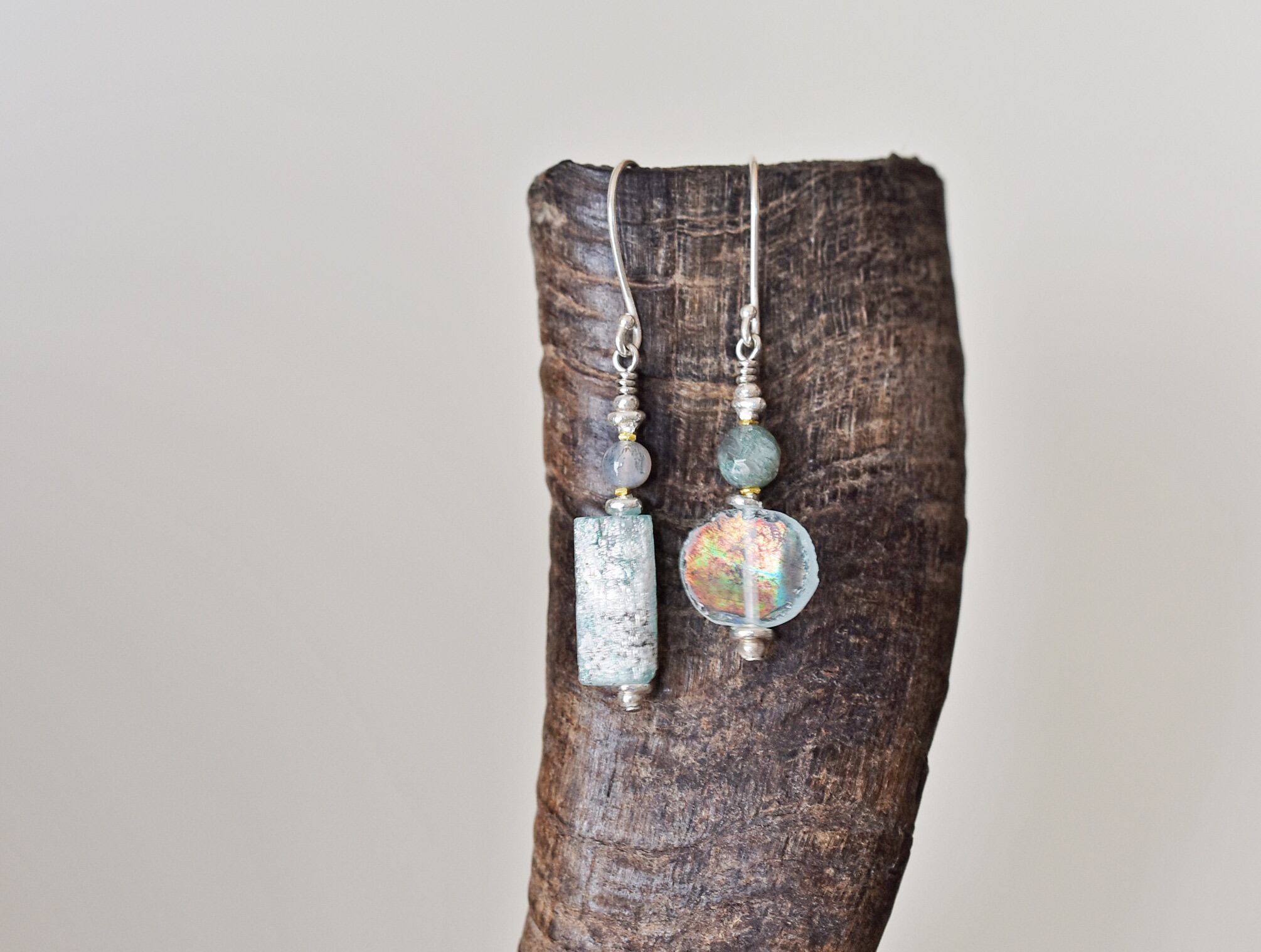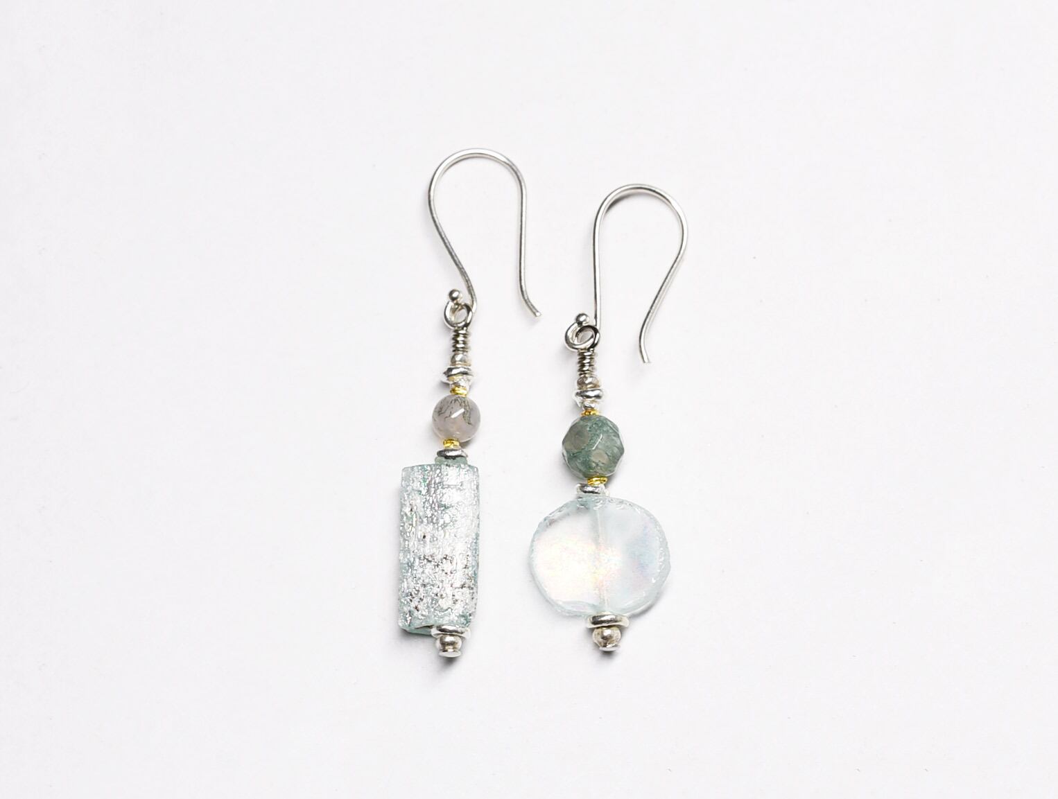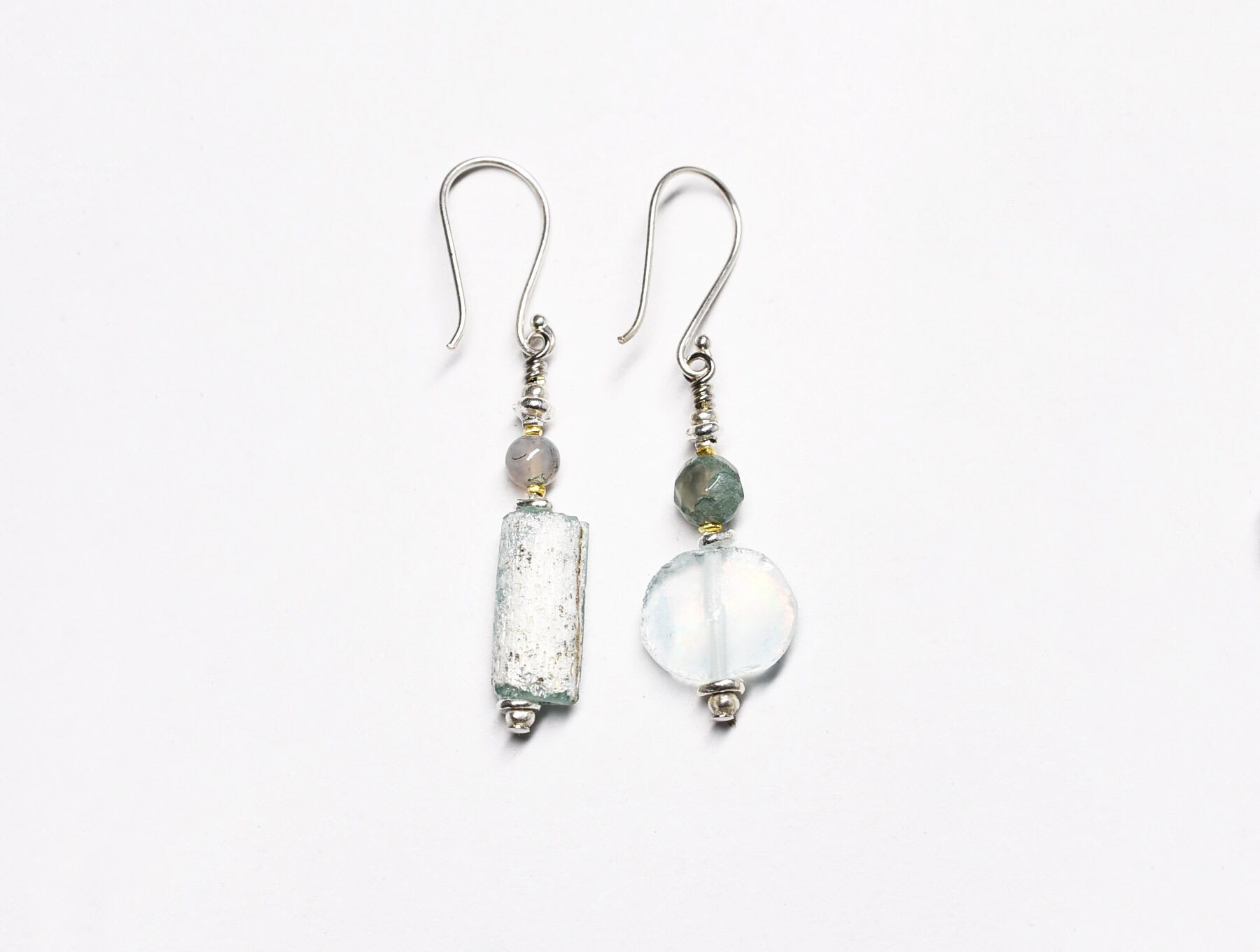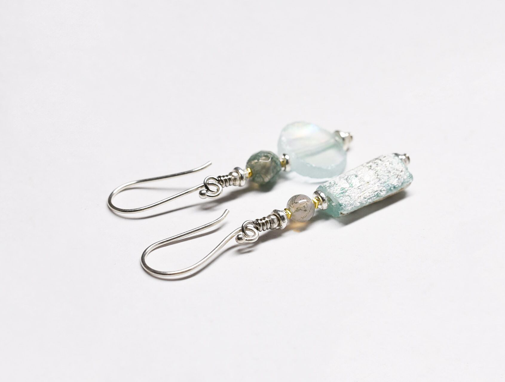 銀化したローマングラス、カレンシルバー、インディアンアゲートを繋いだアンシメトリーなピアスです。