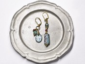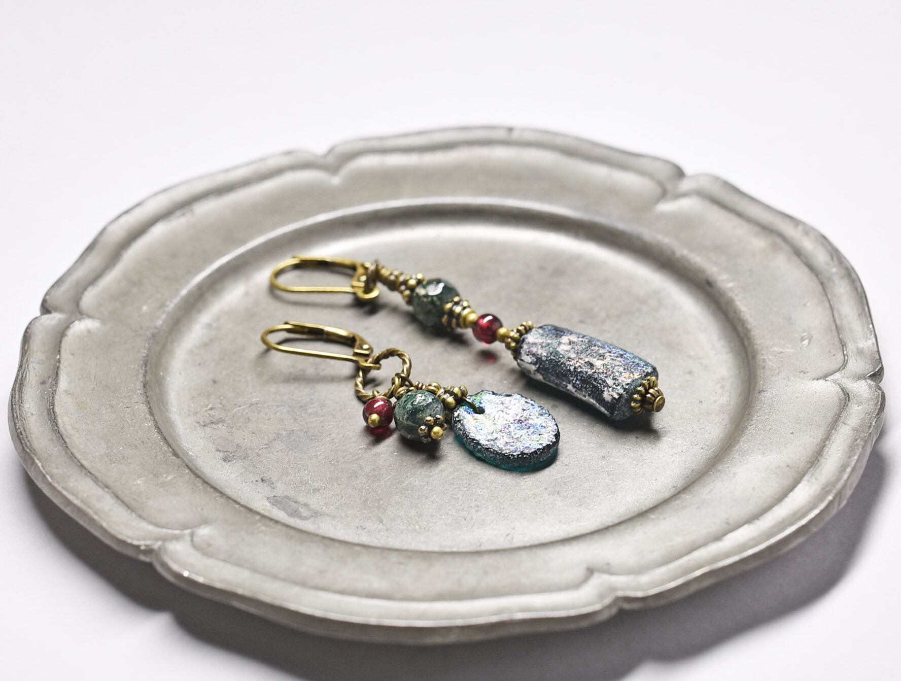銀化したローマングラスをアンシメトリーに繋ぎ、インディアンアゲートとガーネットをあしらったピアスです。