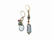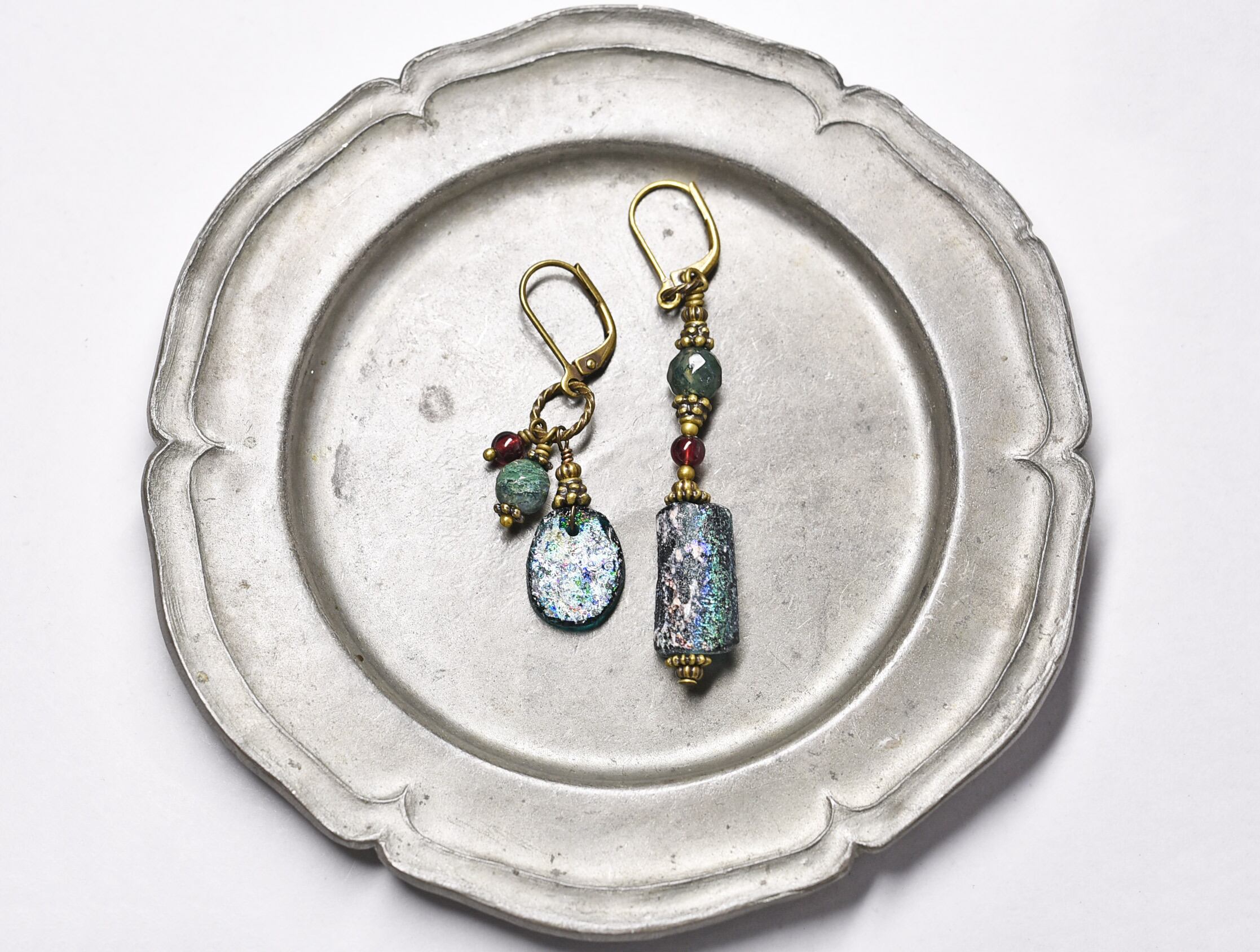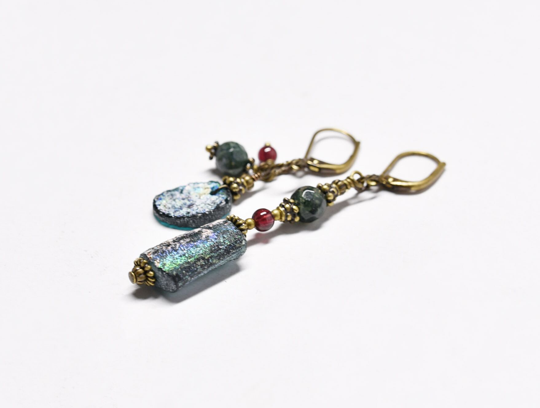 銀化ローマングラスとインディアンアゲート、ガーネットのアンシメトリーピアス