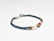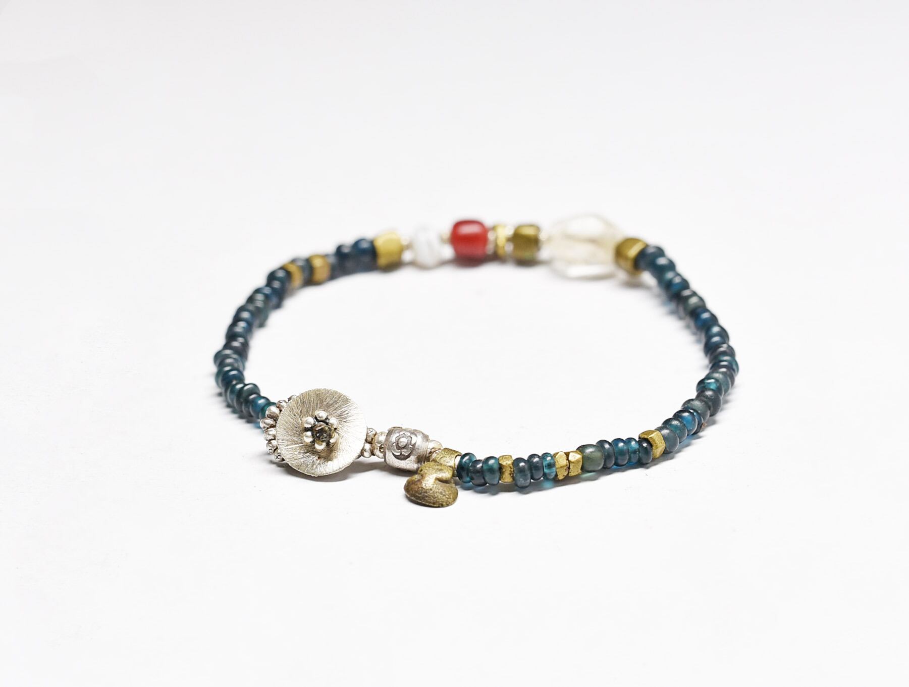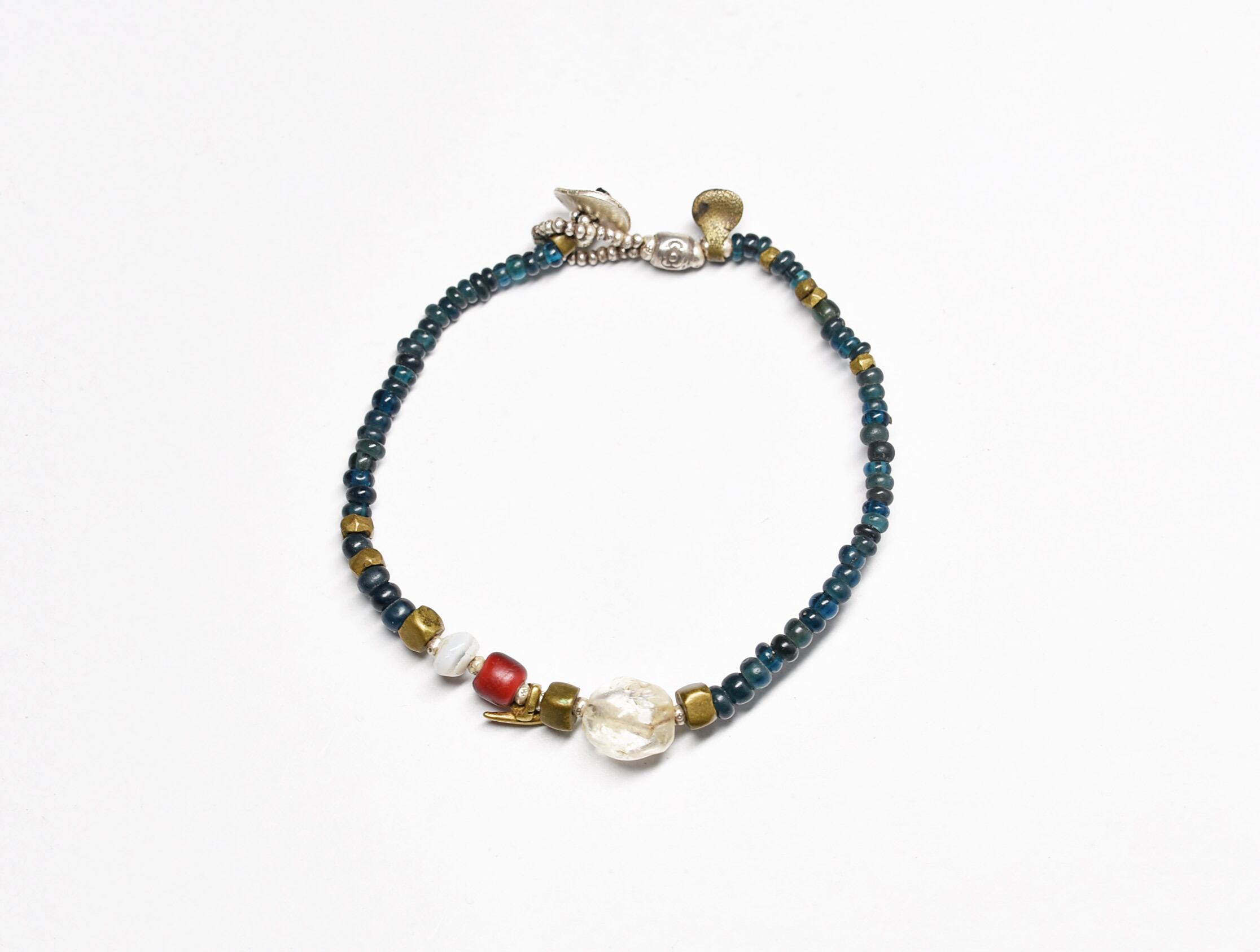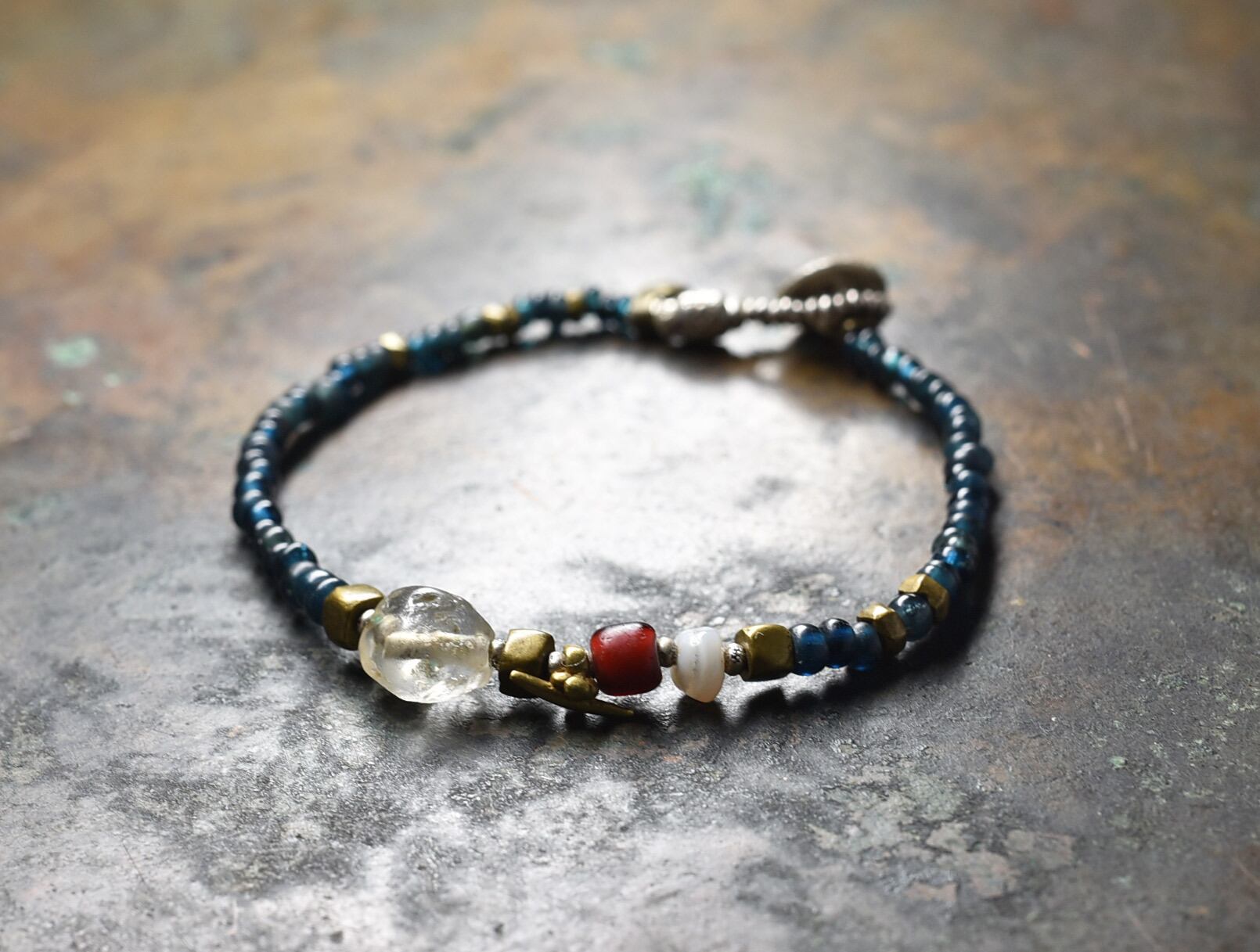 古代水晶、古代瑪瑙、金赤ホワイトハーツ、インディゴブルーのアンティークビーズ、oldオリッサブラスなどで繋いだブレスです。