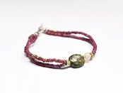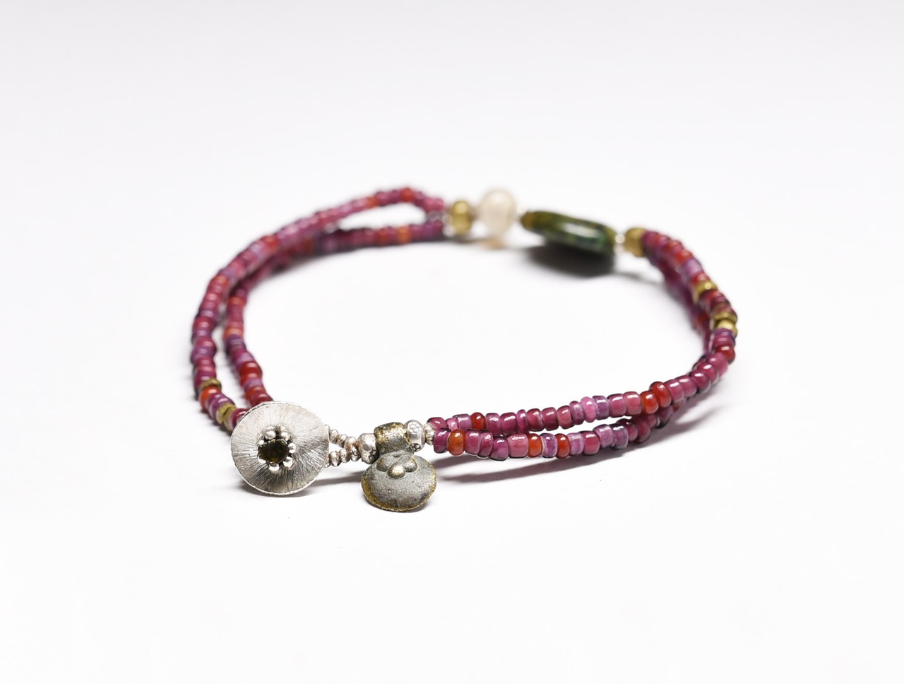 濃淡のある紫色や赤色のビーズはホワイトハーツと呼ばれるアンティークビーズです。